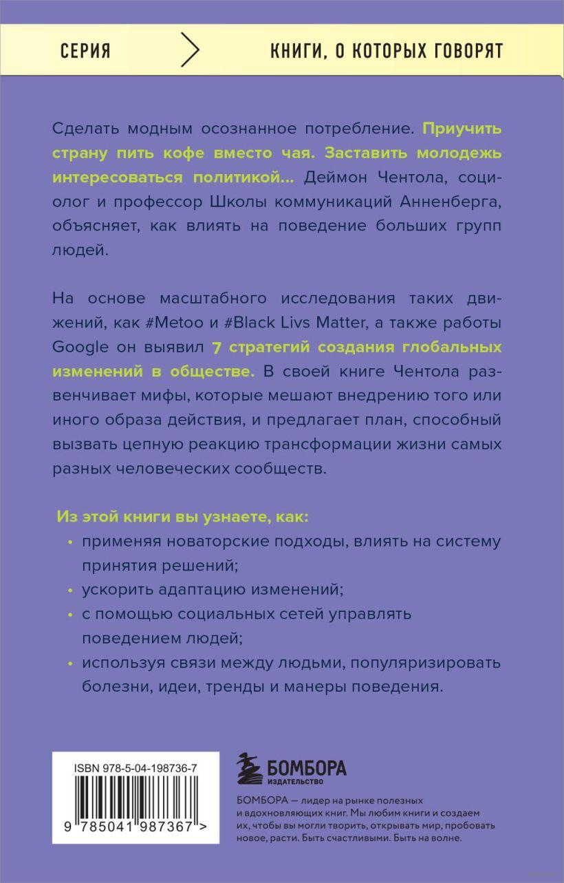 На основе масштабного исследования таких движений, как #Metoo и #Black Livs Matter, а также работы Google, он выявил 7 стратегий создания глобальных изменений в обществе. В своей книге Чентола развенчивает мифы, которые мешают внедрению того или иного образа действия, и предлагает план, способный вызвать цепную реакцию трансформации жизни самых разных человеческих сообществ.