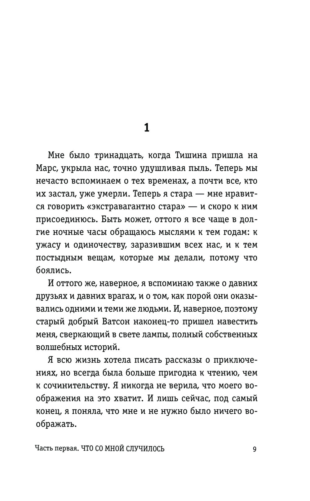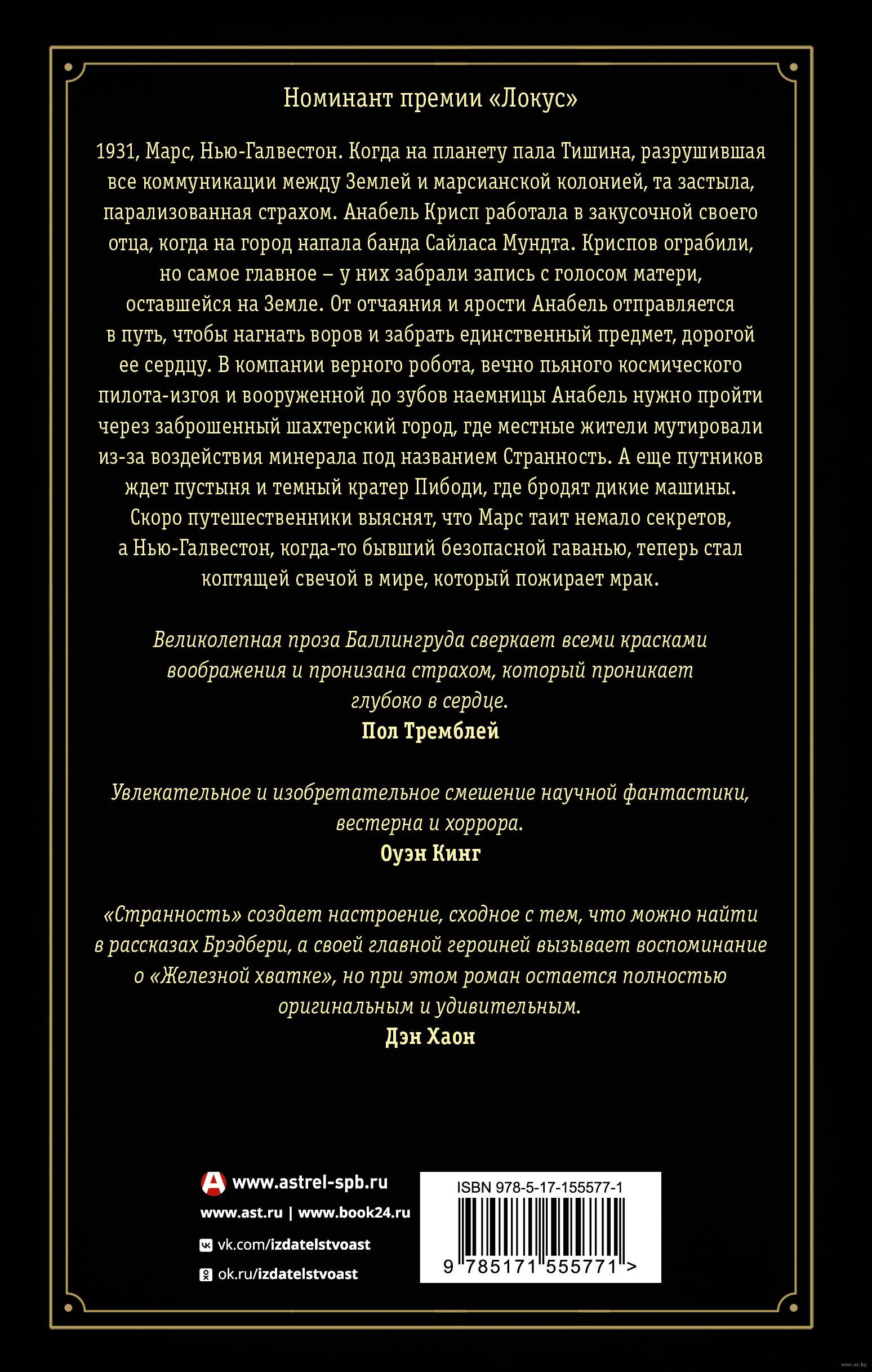 1931, Марс, Нью-Галвестон. Когда на планету пала Тишина, разрушившая все коммуникации между Землей и марсианской колонией, та застыла, парализованная страхом. Анабель Крисп работала в закусочной своего отца, когда на город напала банда Сайласа Мундта. Криспов ограбили, но самое главное, что у них забрали запись с голосом матери, оставшейся на Земле. От отчаяния и ярости Анабель отправляется в путь, чтобы нагнать воров и забрать единственный предмет, дорогой ее сердцу. В компании верного робота, вечно пьяного космического пилота-изгоя и вооруженной до зубов наемницы Анабель нужно пройти через заброшенный шахтерский город, где местные жители мутировали из-за воздействия минерала под названием Странность. А еще путников ждет пустыня и темный кратер Пибоди, где бродят дикие машины. Вскоре путники выяснят, что Марс таит немало секретов, а Нью-Галвестон, когда-то бывший безопасной гаванью, теперь стал коптящей свечой в мире, который пожирает мрак.