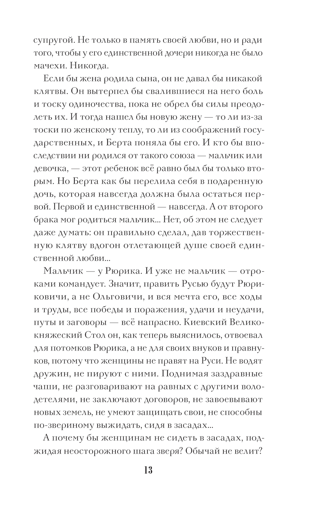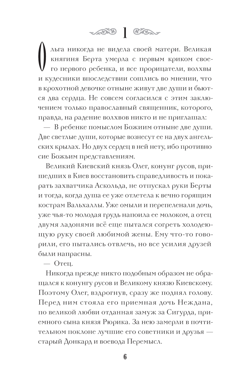 Княгиня Ольга, жена киевского князя Игоря и мать князя Святослава – одна из самых удивительных женщин в русской истории. Когда древляне убивают Игоря, Ольга жестоко мстит им за мужа. После его смерти она становится полновластной правительницей Киевской Руси. Деяния ее велики. Независимая и решительная, обладавшая блестящим даром управленца, она назначала и упорядочивала дань, распределяя налоги в пользу Киева и объединяя вокруг него русские земли. Искала связи с другими странами и была первым государственным деятелем, чей статус они признавали. В 955 году Ольга приняла христианскую веру, начала вводить христианство на русской земле, а позже стала первой женщиной на Руси, причисленной к лику святых. Она воспитала достойных внуков, один из них – Владимир Святославич – стал крестителем Руси.