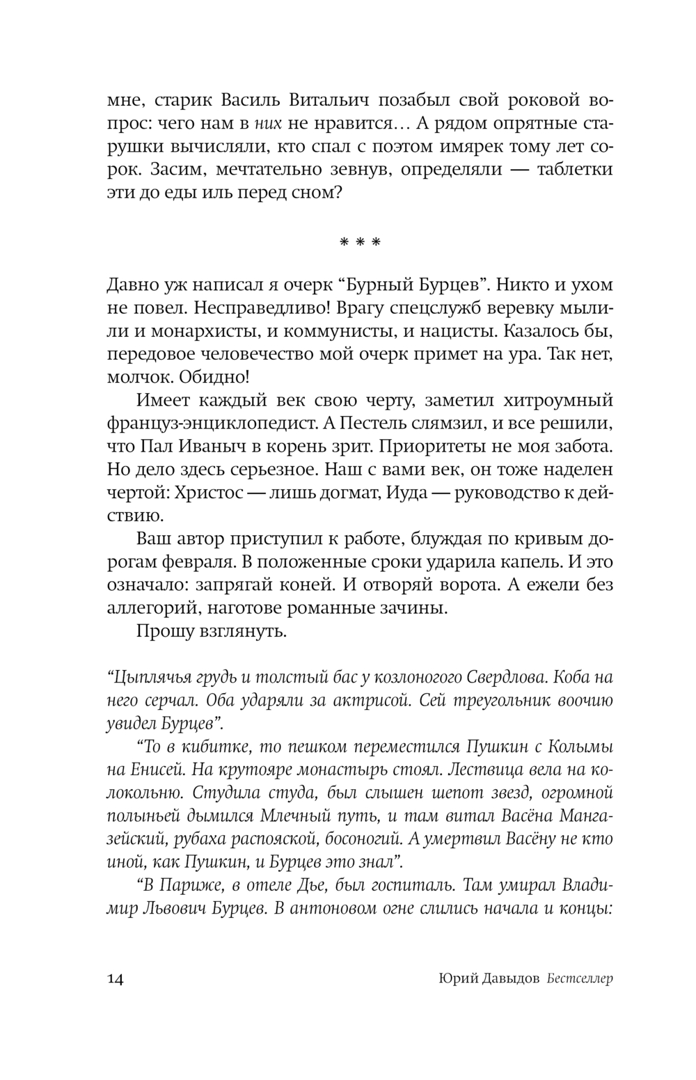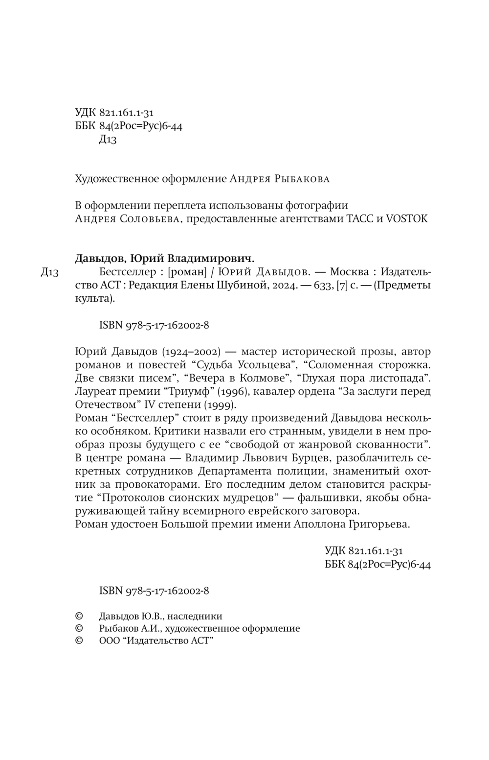 Роман "Бестселлер" стоит в ряду произведений Давыдова несколько особняком. Критики назвали его странным, увидели в нем прообраз прозы будущего с ее "свободой от жанровой скованности". В центре романа – Владимир Львович Бурцев, разоблачитель секретных сотрудников Департамента полиции, знаменитый охотник за провокаторами. Его последним делом становится раскрытие "Протоколов сионских мудрецов" – фальшивки, якобы обнаруживающей тайну всемирного еврейского заговора.