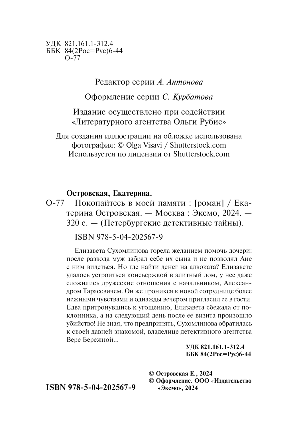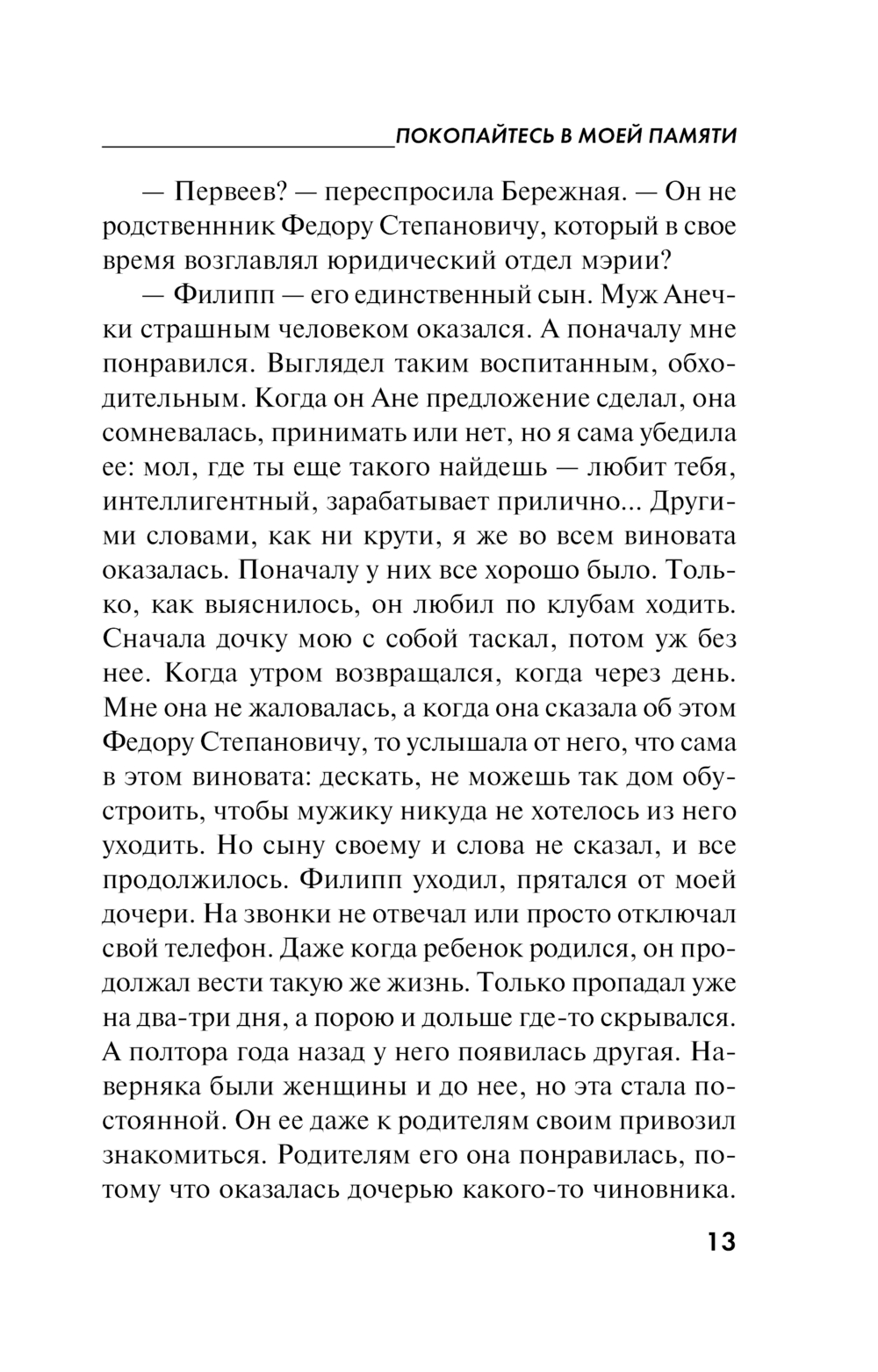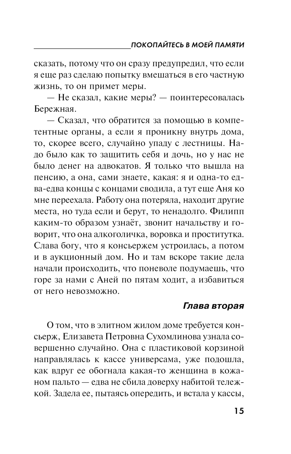 Елизавета Петровна Сухомлинова, главная героиня романа "Покопайтесь в моей памяти", пенсионерка. Но она очень хочет помочь своей дочери, поэтому устраивается сразу на две работы: консьержкой в элитном доме и искусствоведом в аукционном доме. Но и на одном, и на другом месте работы Елизавета Петровна оказывается втянута в непредвиденные и весьма опасные события...