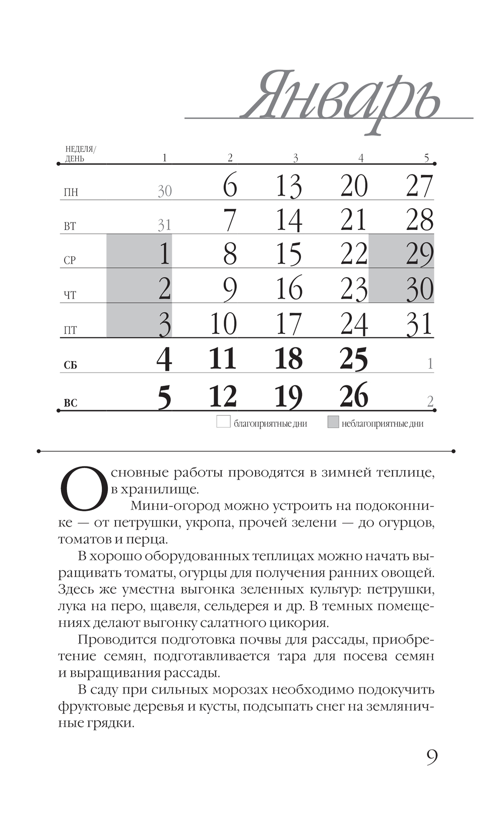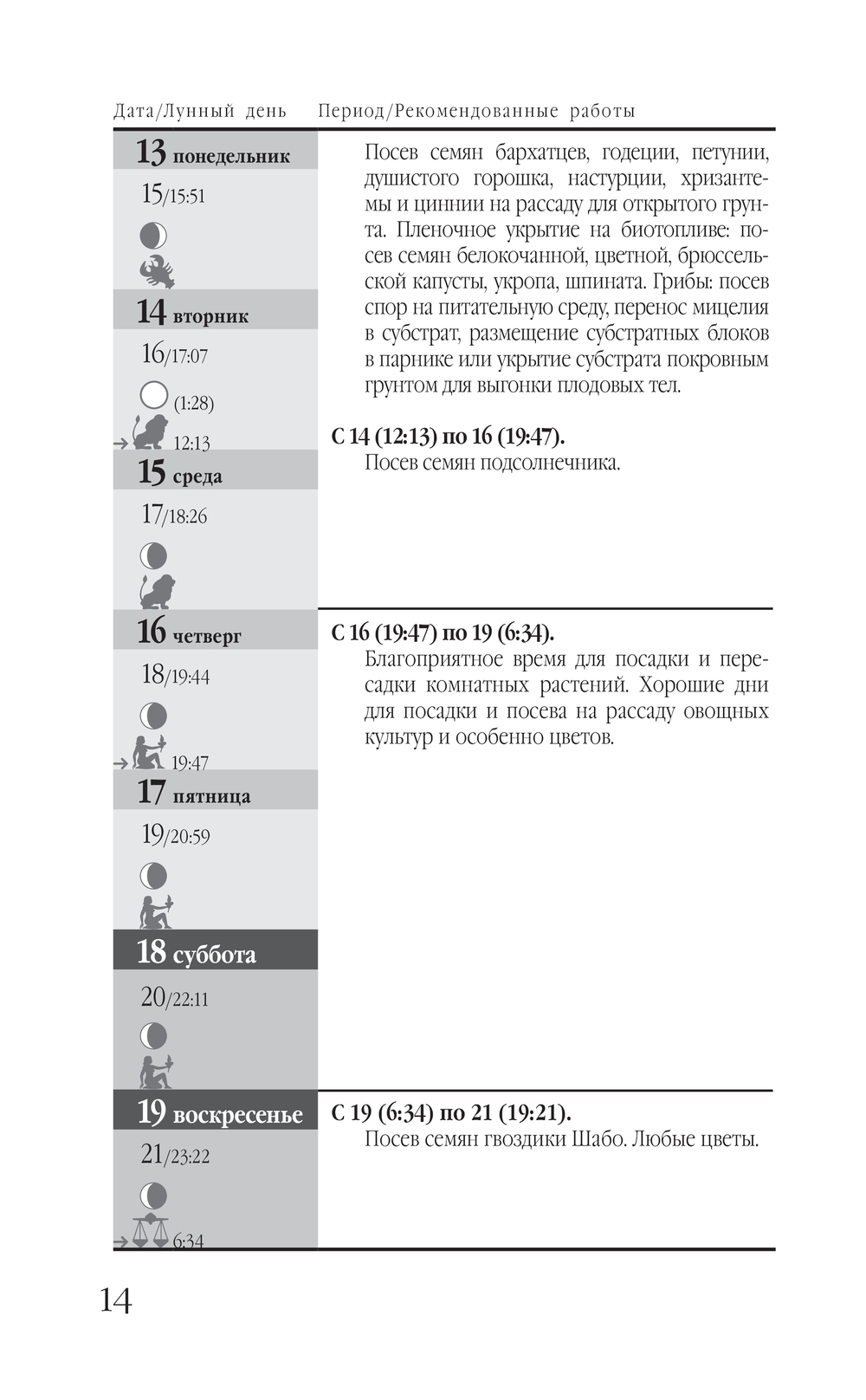 Составленный с учетом фаз Луны, календарь от Татьяны Борщ поможет вам определить наиболее благоприятные дни для посева семян, обработки почвы, пересадки различных культур, а удобный ежедневник поможет вам за всем уследить и ничего не упустить.