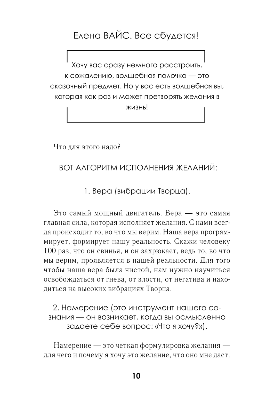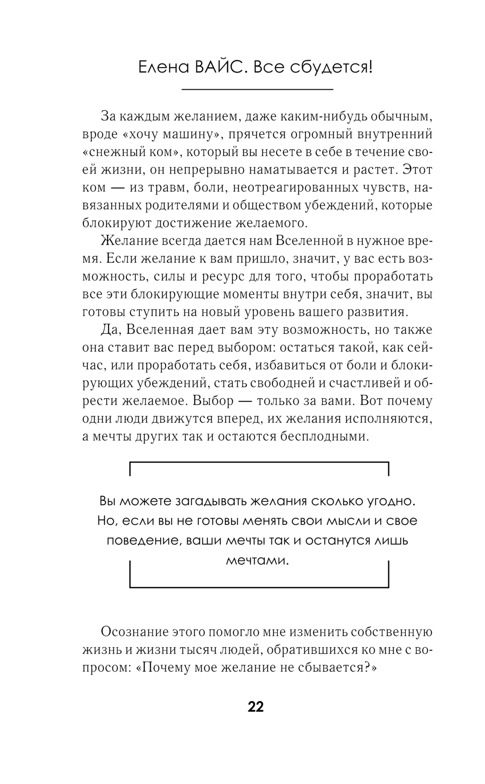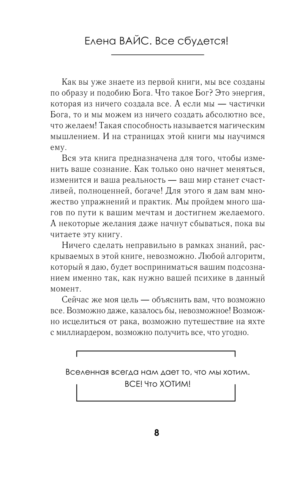 Эта книга – волшебная инструкция по исполнению желаний. Все, что ты хочешь: квартиру, повышение по службе, замужество или машину VIP-класса – все сбудется! Елена Вайс, практикующий клинический психолог и немного волшебница, перевернет твое сознание и научит творить реальность, в которой для тебя возможно все!