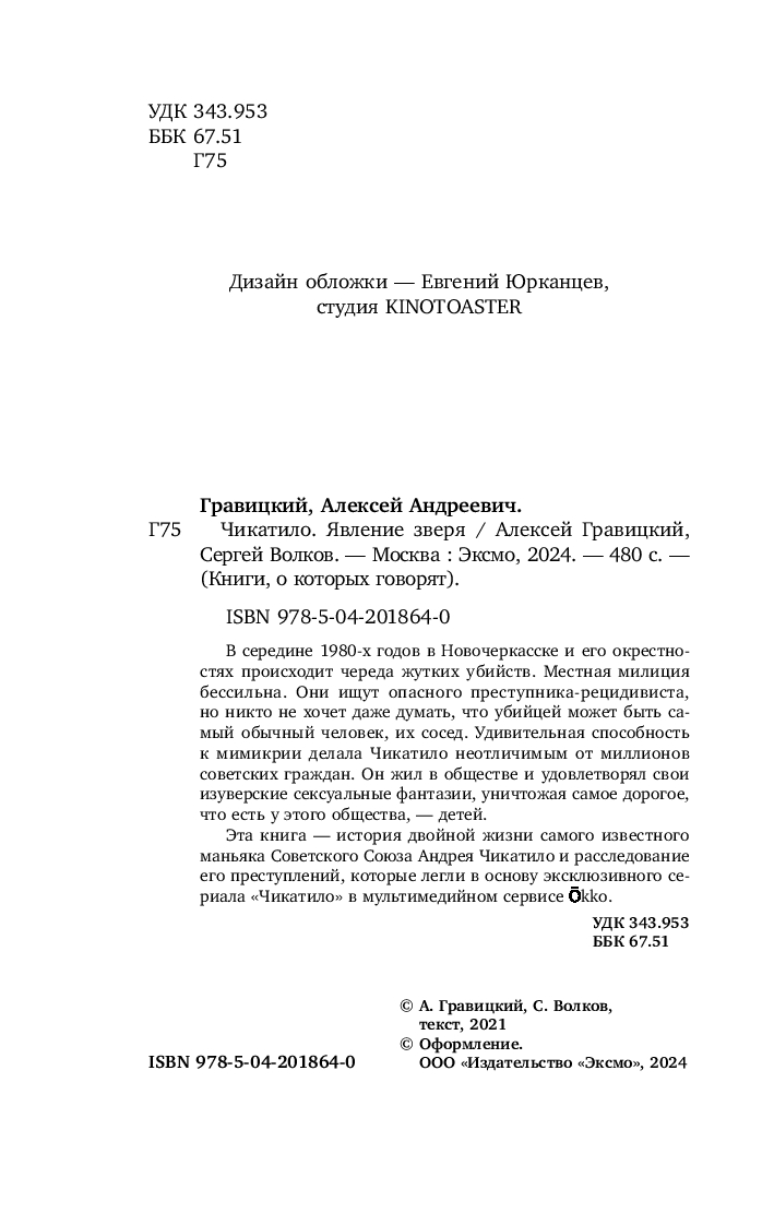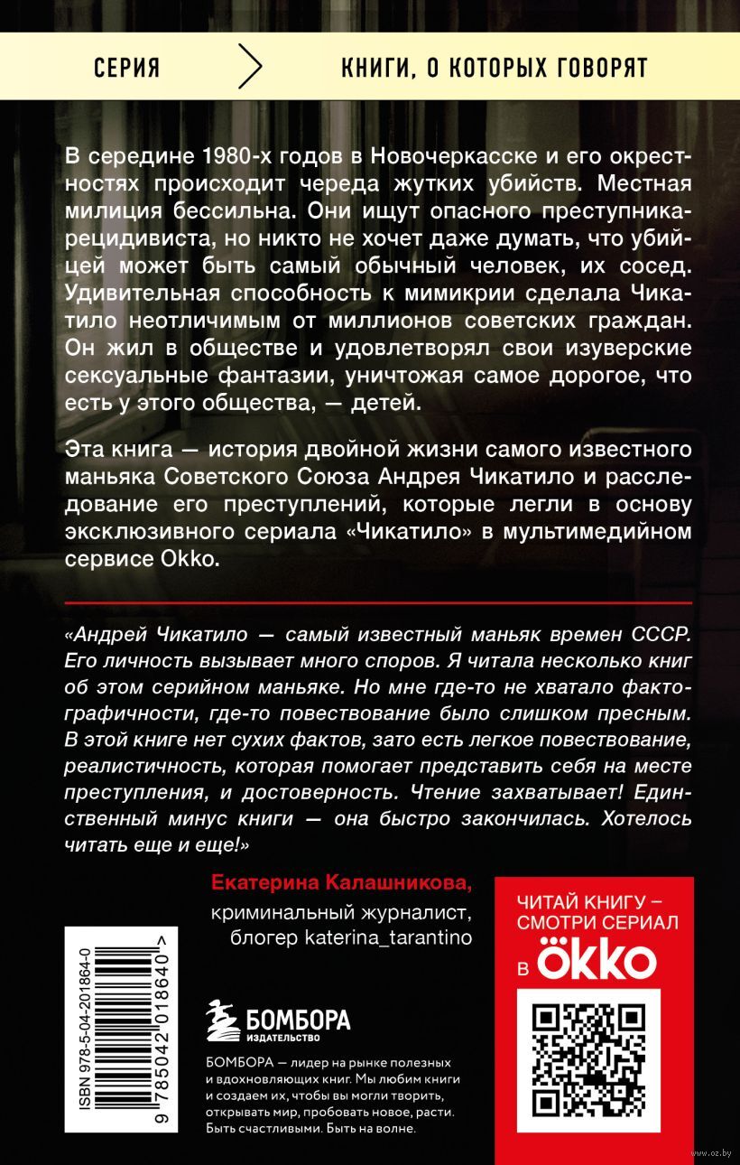 Эта книга – история двойной жизни самого известного маньяка советского союза Андрея Чикатило и расследование его преступлений, которые легли в основу эксклюзивного сериала "Чикатило" в мультимедийном сервисе Okko.