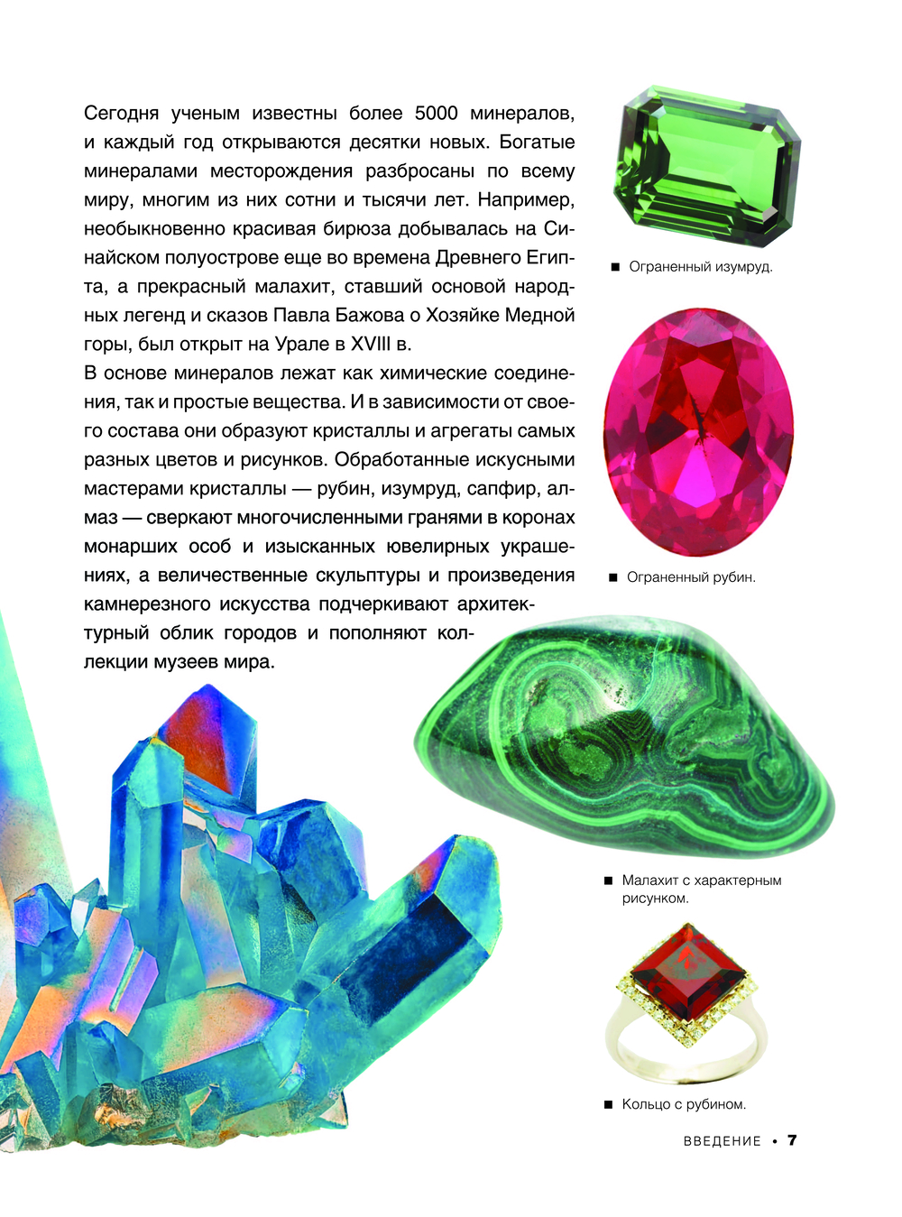Содержательные статьи и интересные факты, сопровождающие зрелищные иллюстрации, позволят узнать больше о строении и свойствах всех этих удивительных богатств, созданных природой и человеком.