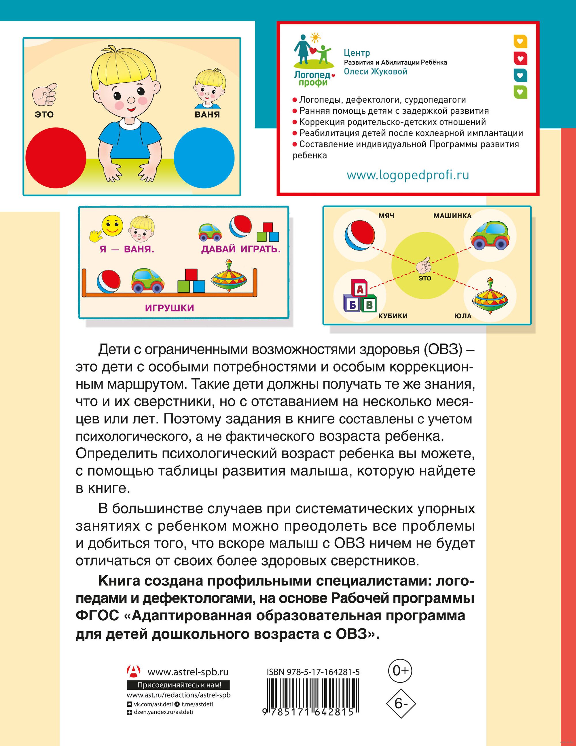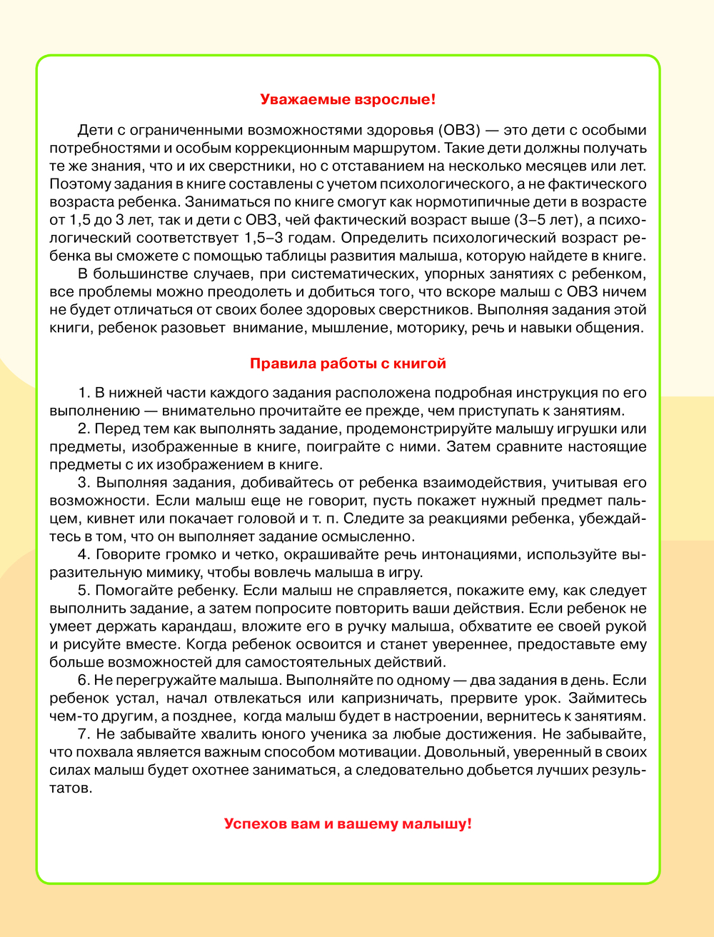 Книга предназначена для детей с ограниченными возможностями здоровья (ОВЗ), которые имеют особые потребности и нуждаются в особом коррекционном маршруте. Такие дети должны получать те же знания, что и их сверстники, но с отставанием на несколько месяцев или лет. Поэтому задания в книге составлены с учетом психологического, а не фактического возраста ребенка. Определить психологический возраст ребенка вы сможете с помощью таблицы развития малыша, которую найдете в книге. В большинстве случаев при систематических упорных занятиях можно преодолеть все проблемы и добиться того, что вскоре малыш с ОВЗ ничем не будет отличаться от своих более здоровых сверстников.