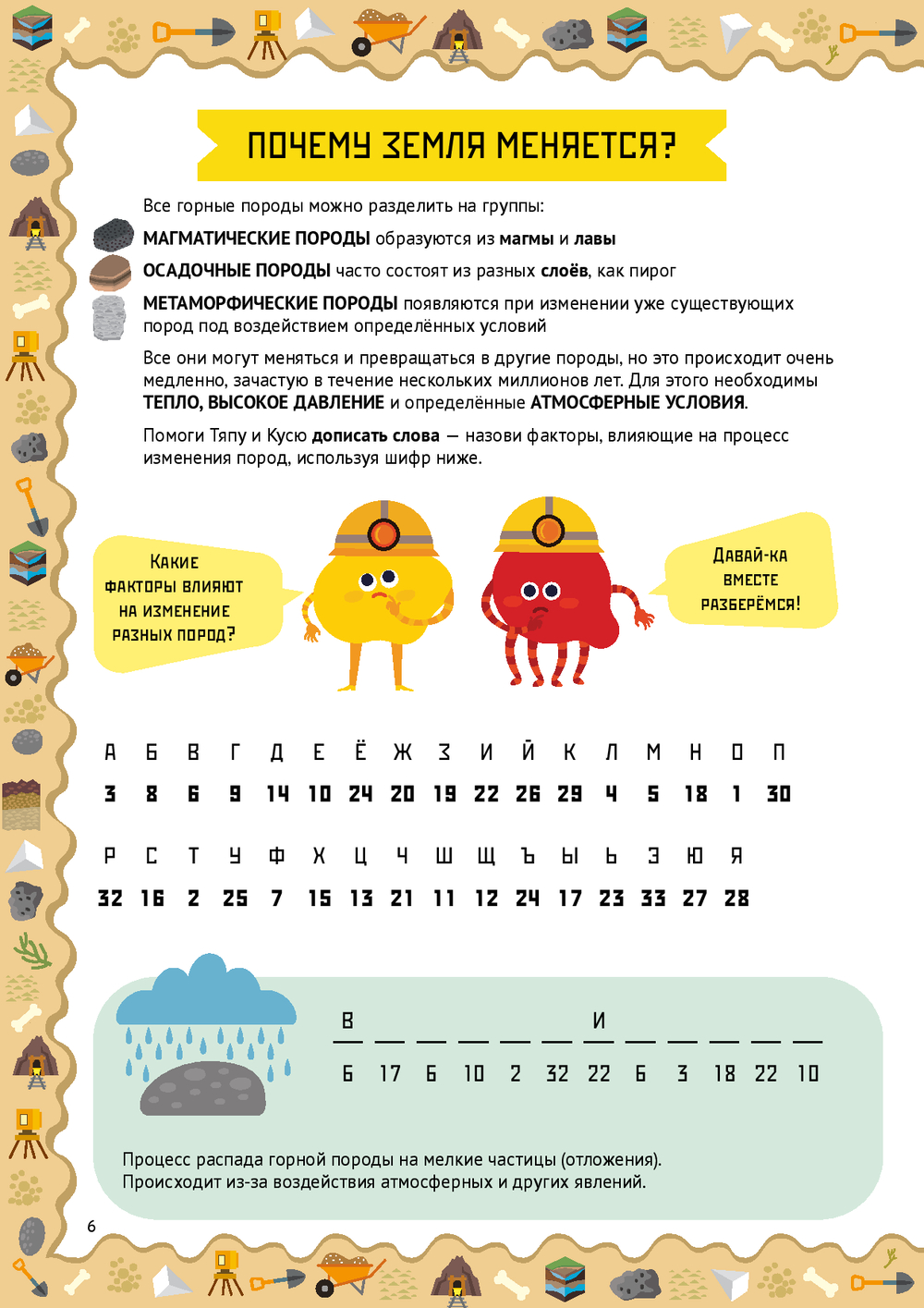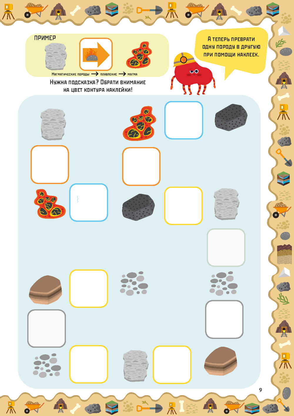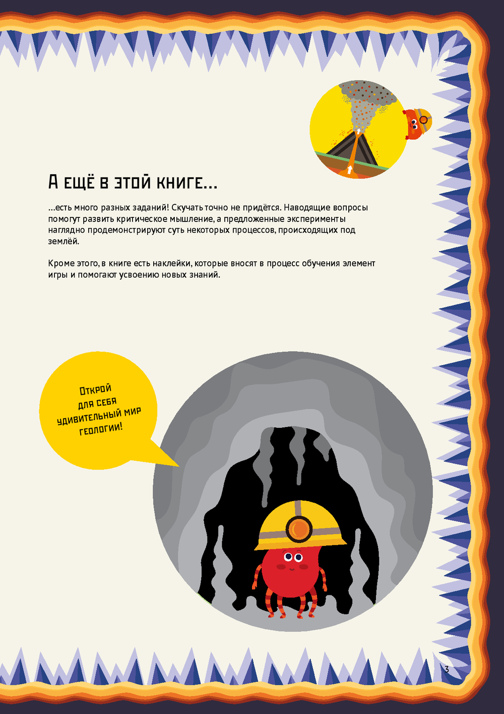 Наводящие вопросы помогут развить критическое мышление, а предложенные эксперименты, которые можно проводить прямо дома с подручными материалами, наглядно продемонстрируют суть некоторых процессов, происходящих под землёй. А еще найдете много самых разных заданий, стикеры для их выполнения и настольную игру – геологическое домино. Скучать точно не придётся!