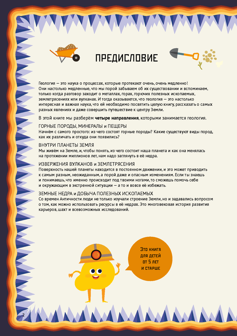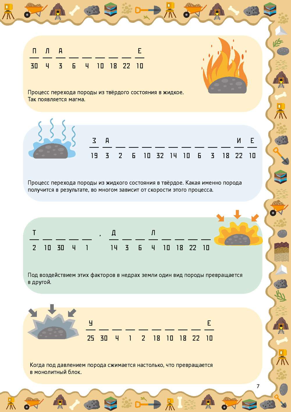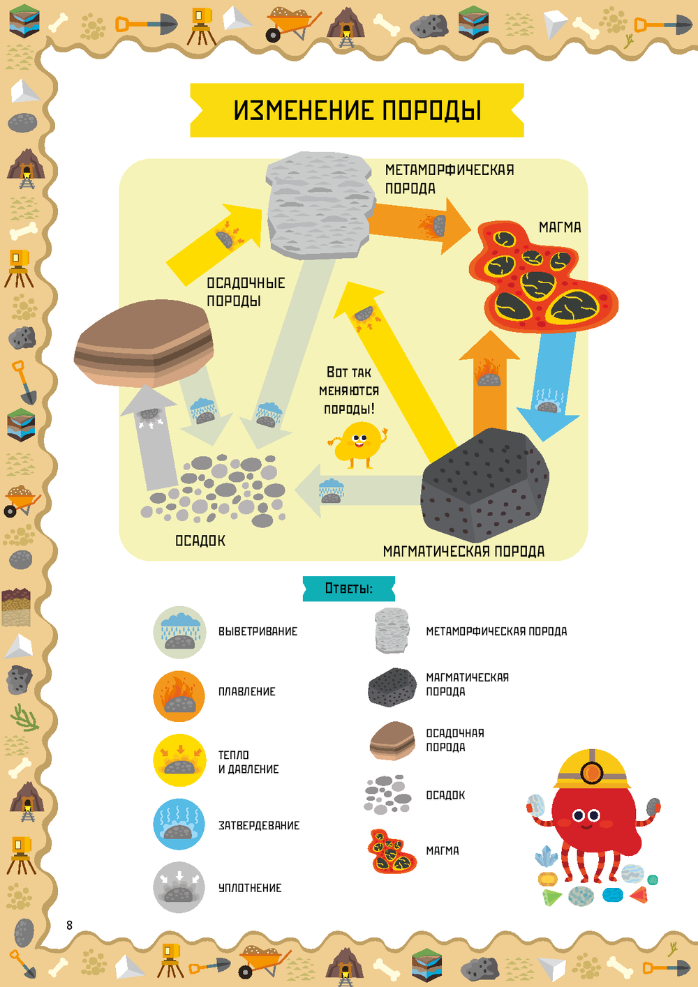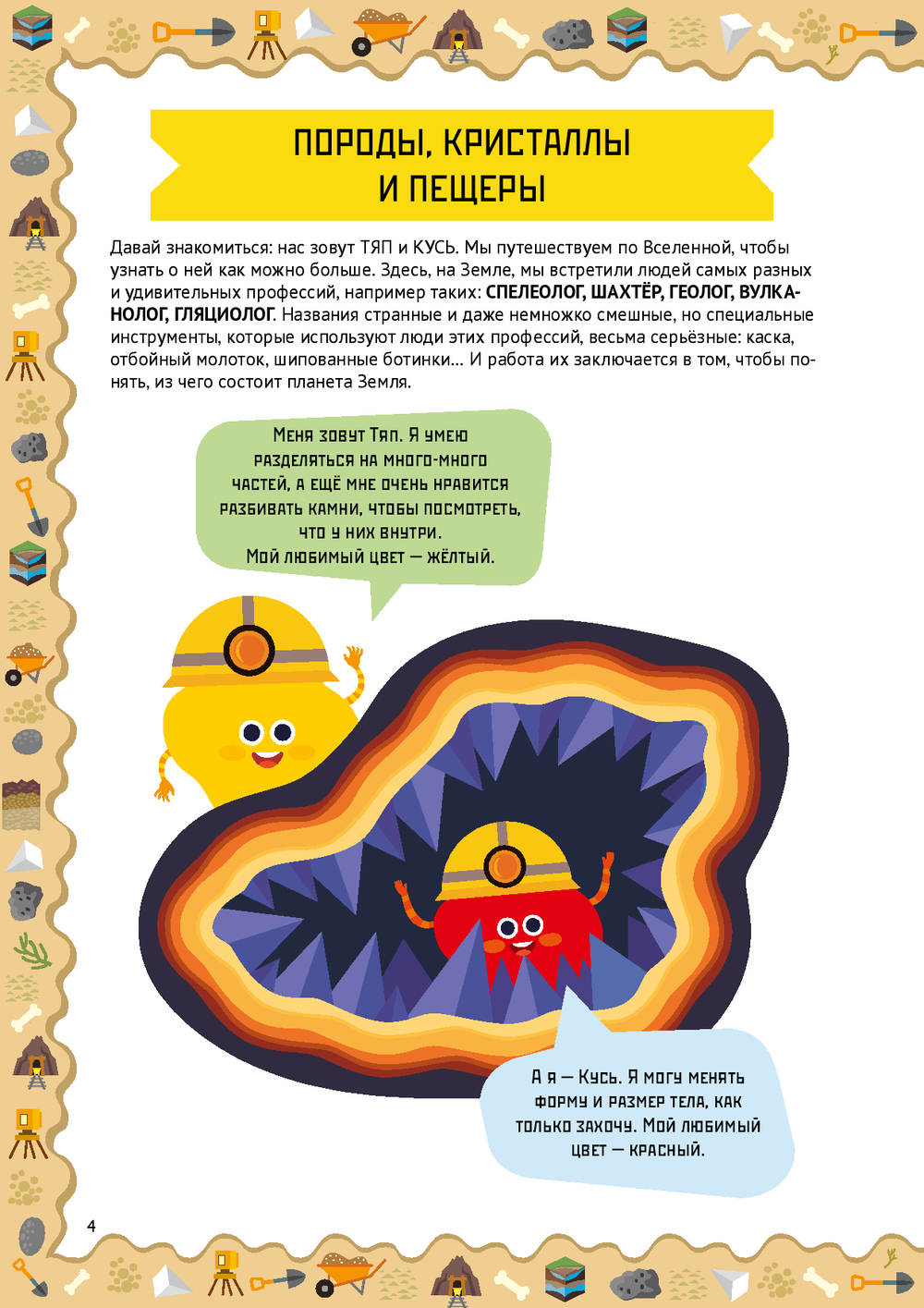Наводящие вопросы помогут развить критическое мышление, а предложенные эксперименты, которые можно проводить прямо дома с подручными материалами, наглядно продемонстрируют суть некоторых процессов, происходящих под землёй. А еще найдете много самых разных заданий, стикеры для их выполнения и настольную игру – геологическое домино. Скучать точно не придётся!