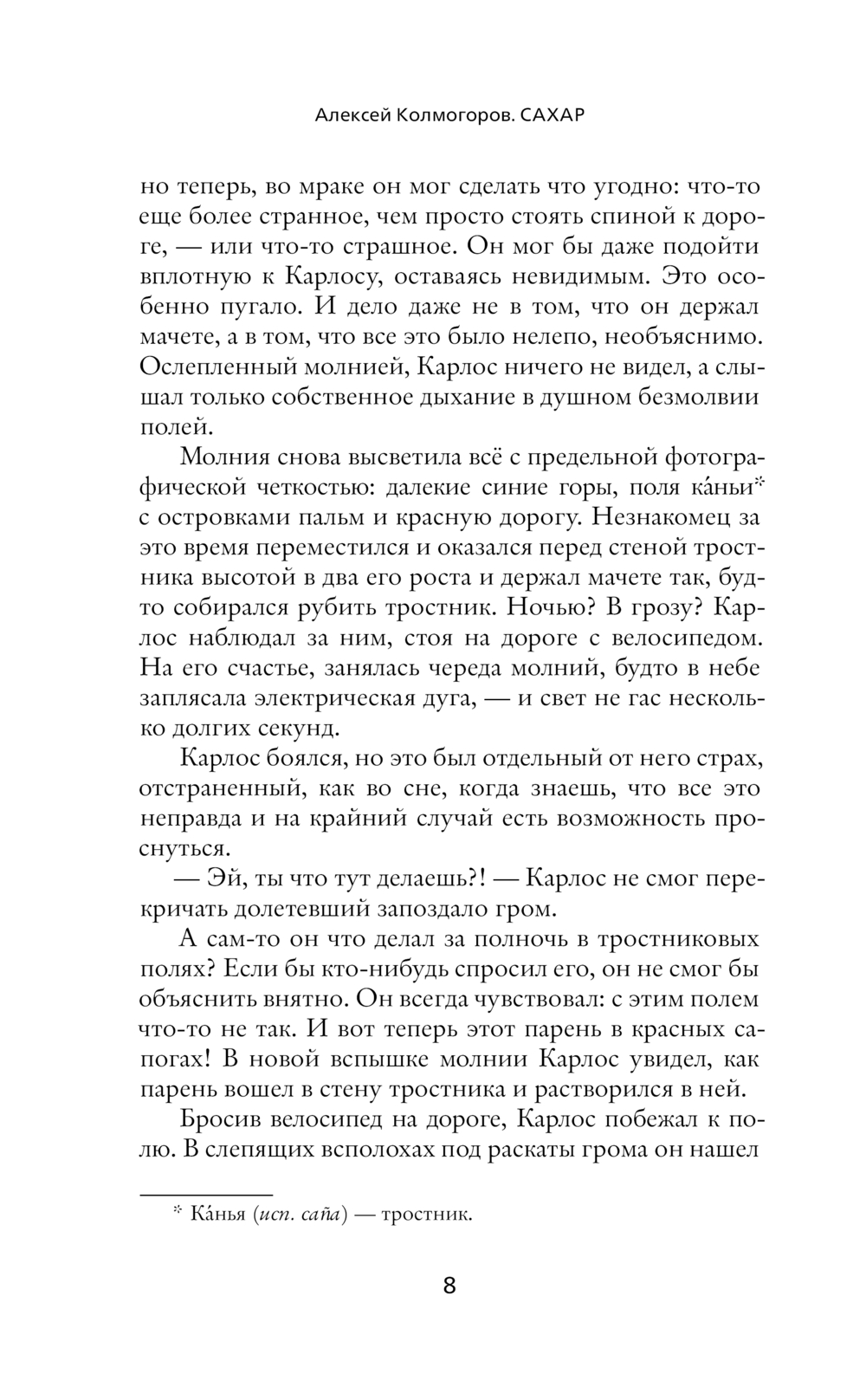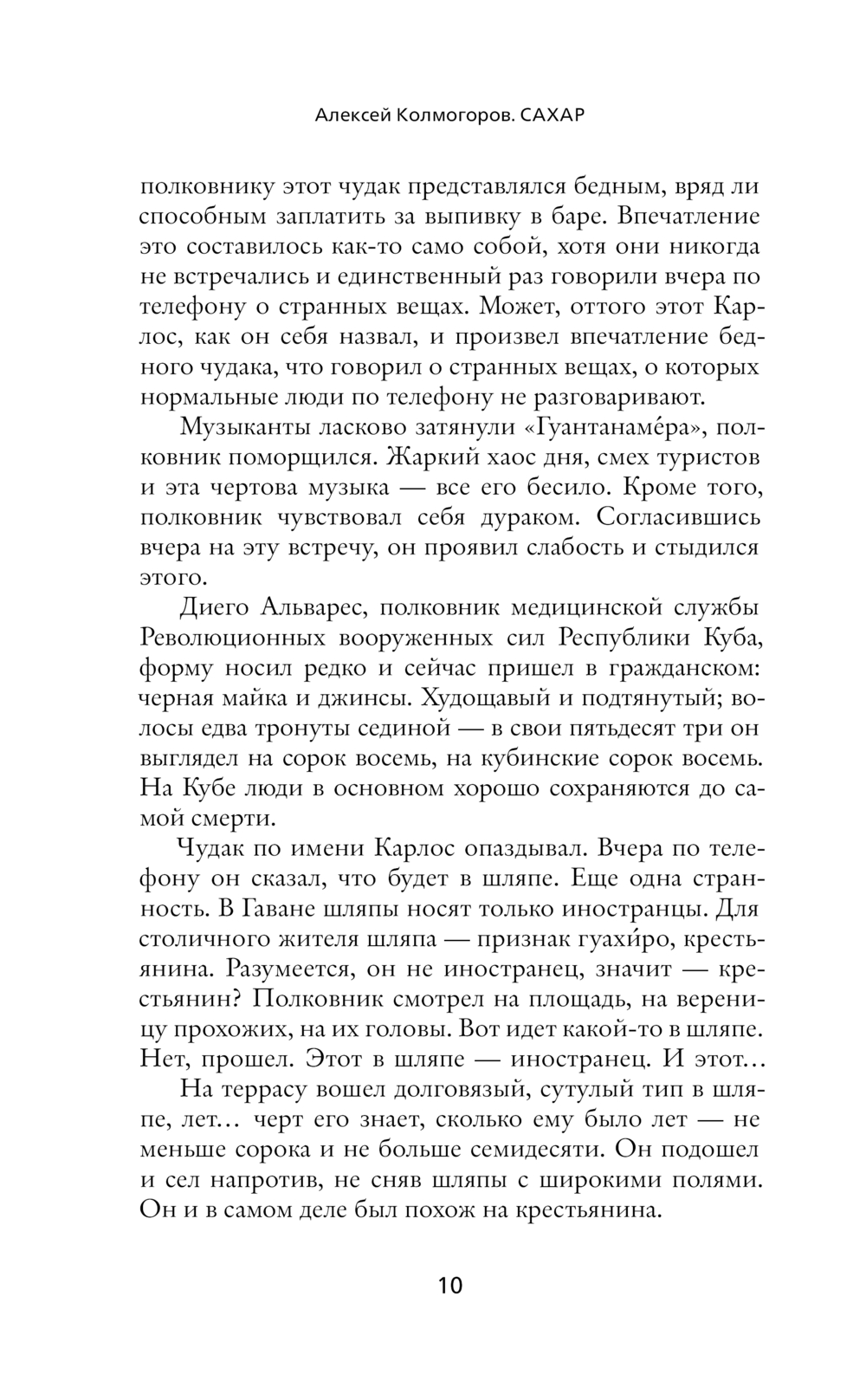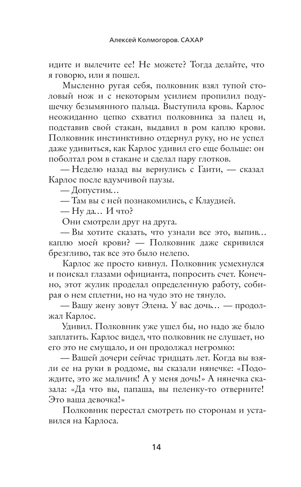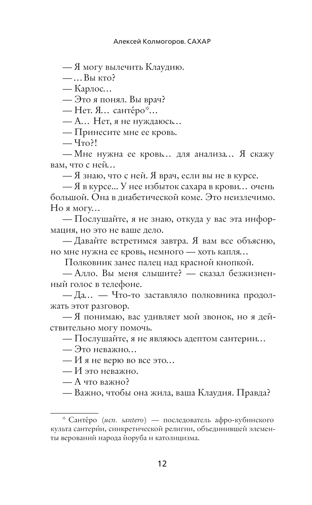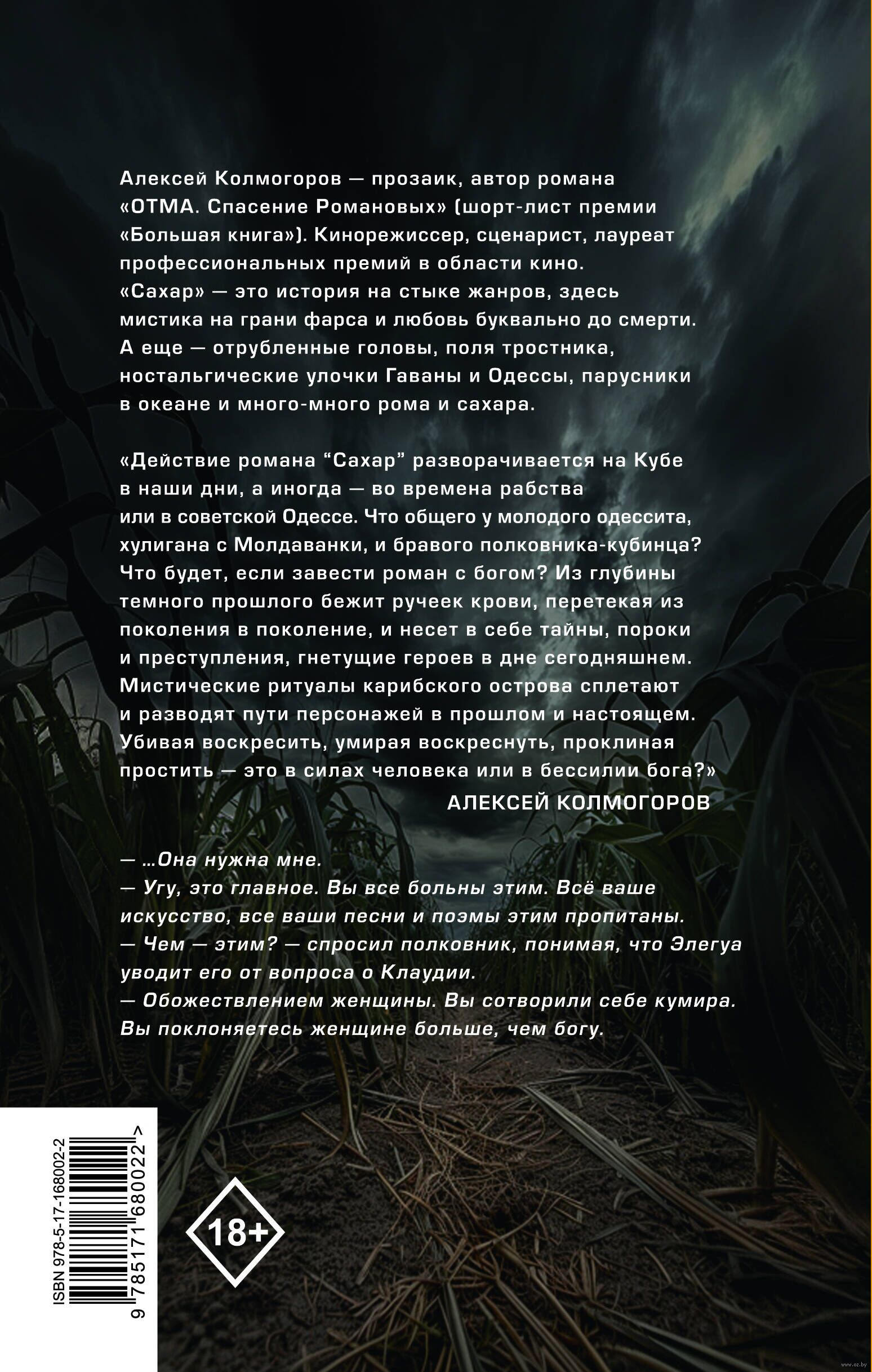 Действие романа "Сахар" разворачивается на Кубе в наши дни, а иногда – во времена рабства, или в советской Одессе. Что общего у молодого одессита, хулигана с Молдаванки, и бравого полковника-кубинца? Что будет, если завести роман с богом? Из глубины темного прошлого бежит ручеек крови, перетекая из поколения в поколение, и несет в себе тайны, пороки и преступления, гнетущие героев в дне сегодняшнем. Мистические ритуалы карибского острова сплетают и разводят пути персонажей в прошлом и настоящем. Убивая воскресить, умирая воскреснуть, проклиная простить – это в силах человека или в бессилии бога? (Алексей Колмогоров)