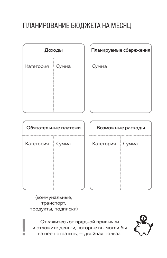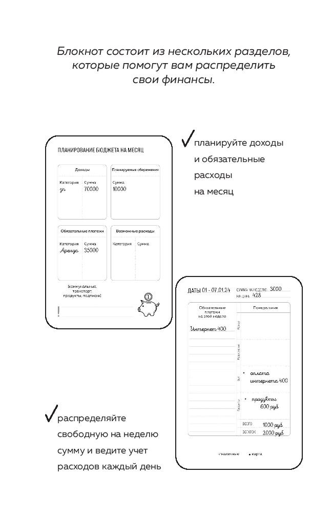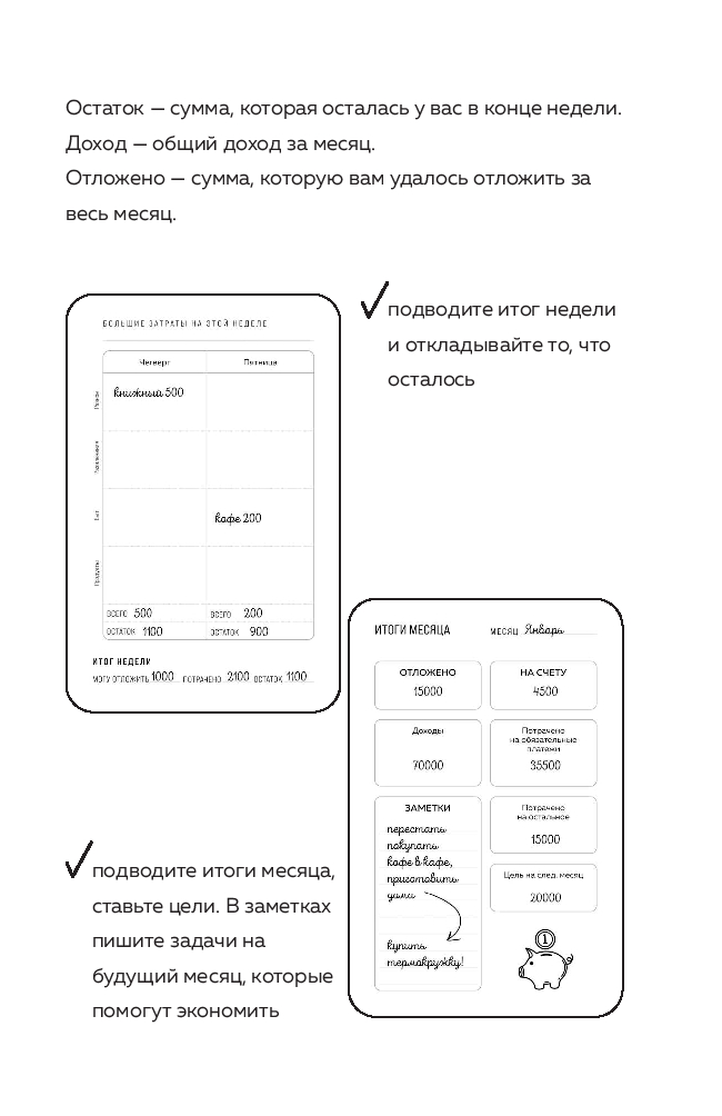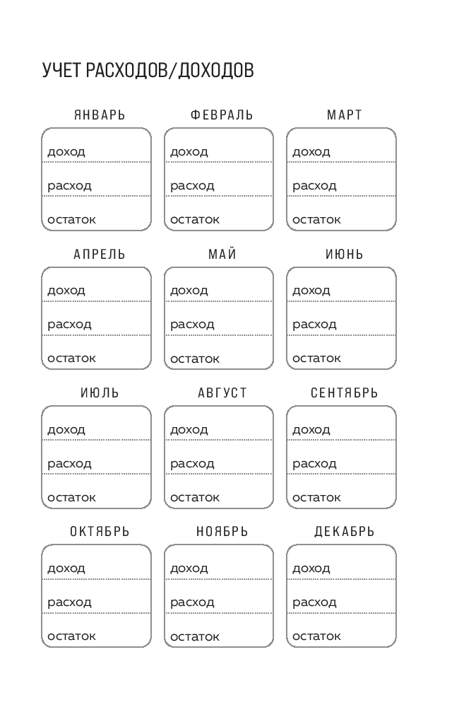 Научитесь планировать свой бюджет и откладывайте деньги на исполнение своих желаний! С нашим ежедневником вы сможете проанализировать свои финансы, научитесь копить деньги и сможете увеличить свой доход! Функциональная сетка расходов, в которой вы сможете записывать и анализировать свои траты по различным категориям, планировать бюджет на будущий месяц и подводить итоги. Ведите учет расходов и доходов и наблюдайте за своими успехами! С помощью удобного и простого графика вы поставите финансовые планы и цели на год, а полезный трекер и подсказки помогут вам достичь всех целей и накопить деньги.