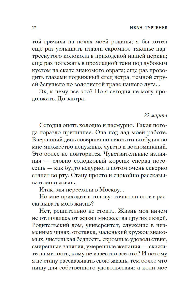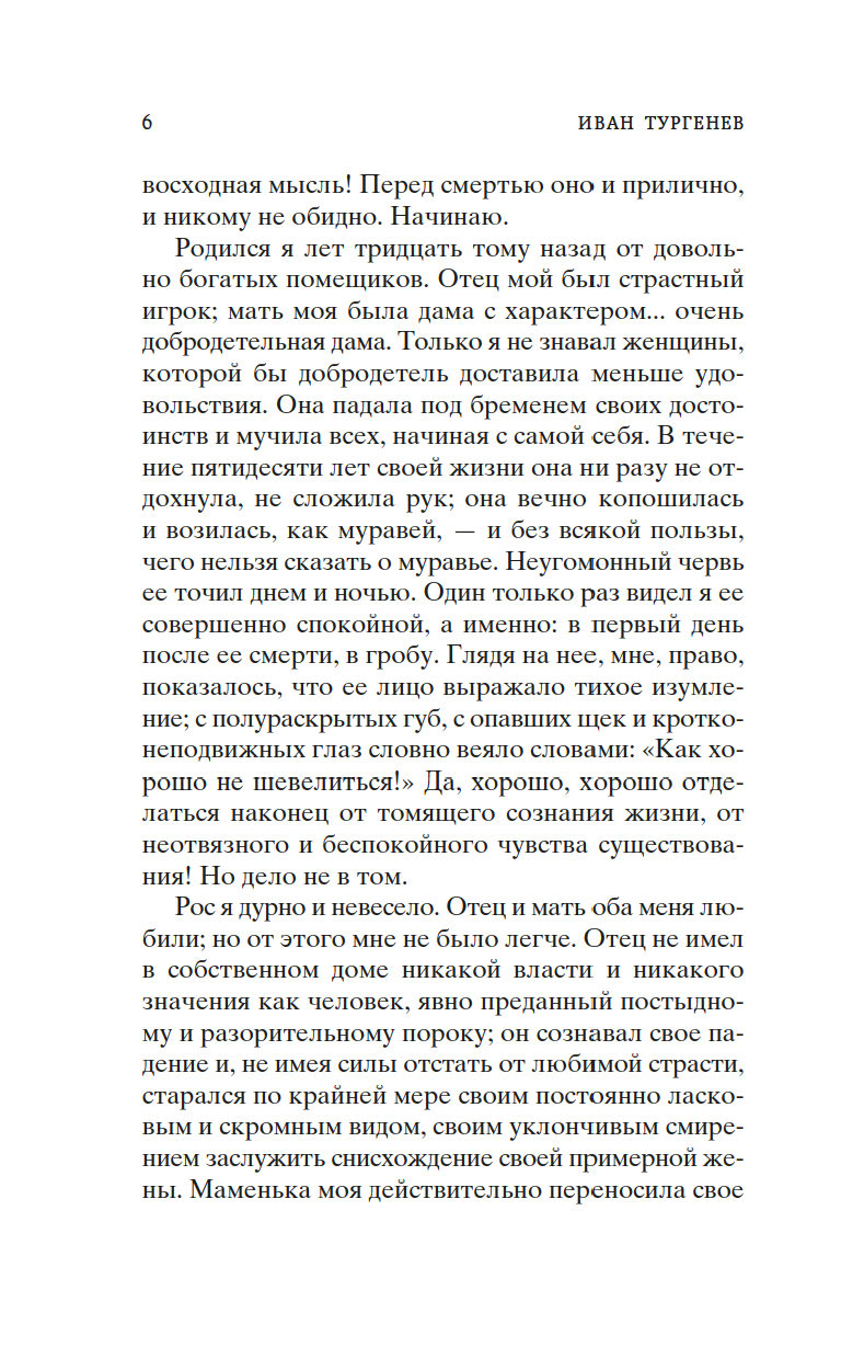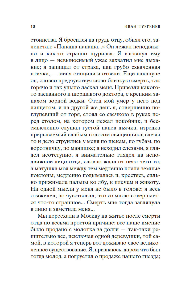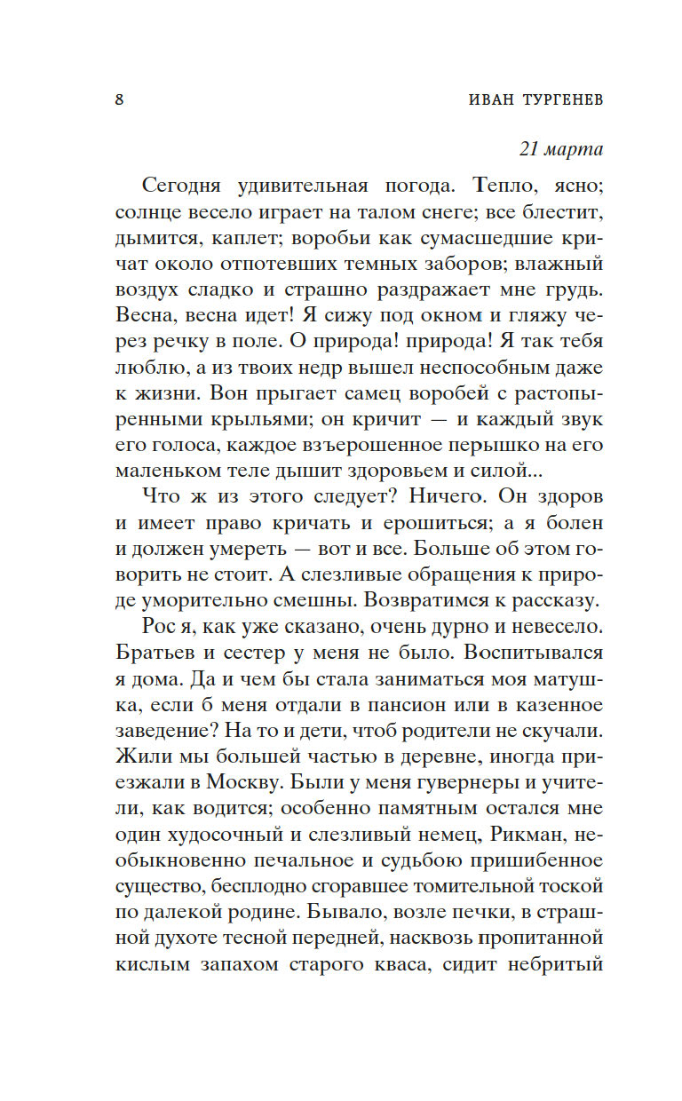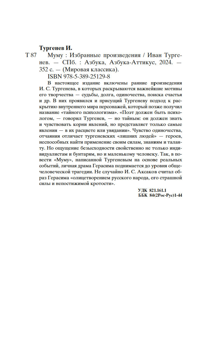 В настоящее издание включены ранние произведения И. С. Тургенева, в которых раскрываются важнейшие мотивы его творчества – судьбы, долга, одиночества, поиска счастья и др. В них проявился и присущий Тургеневу подход к раскрытию внутреннего мира персонажей, который позже получил название "тайного психологизма". "Поэт должен быть психологом, – говорил Тургенев, – но тайным: он должен знать и чувствовать корни явлений, но представляет только самые явления – в их расцвете или увядании". Чувство одиночества, отчаяния отличает тургеневских "лишних людей" – героев, неспособных найти применение своим силам, знаниям и таланту. Но ощущение безысходности свойственно не только индивидуалистам и бунтарям, но и маленькому человеку. Так, в повести "Муму", написанной Тургеневым на основе реальных событий, личная драма Герасима поднимается до уровня общечеловеческой трагедии. Не случайно И. С. Аксаков считал образ Герасима "олицетворением русского народа, его страшной силы и непостижимой кротости".