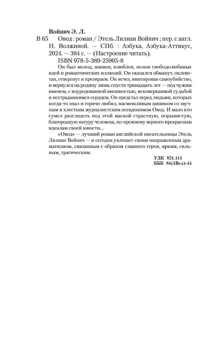 Он был молод, наивен, влюблен, полон свободолюбивых идей и романтических иллюзий. Он оказался обманут, оклеветан, отвергнут и презираем. Он исчез, имитировав самоубийство, и вернулся на родину лишь спустя тринадцать лет – под чужим именем, с изуродованной внешностью, исковерканной судьбой и исстрадавшимся сердцем. Он предстал перед людьми, которых когда-то знал и горячо любил, насмешливым циником со звучным и хлестким журналистским псевдонимом Овод. И мало кто сумел разглядеть под этой маской страстную, порывистую, благородную натуру человека, по-прежнему верного прекрасным идеалам своей юности...
