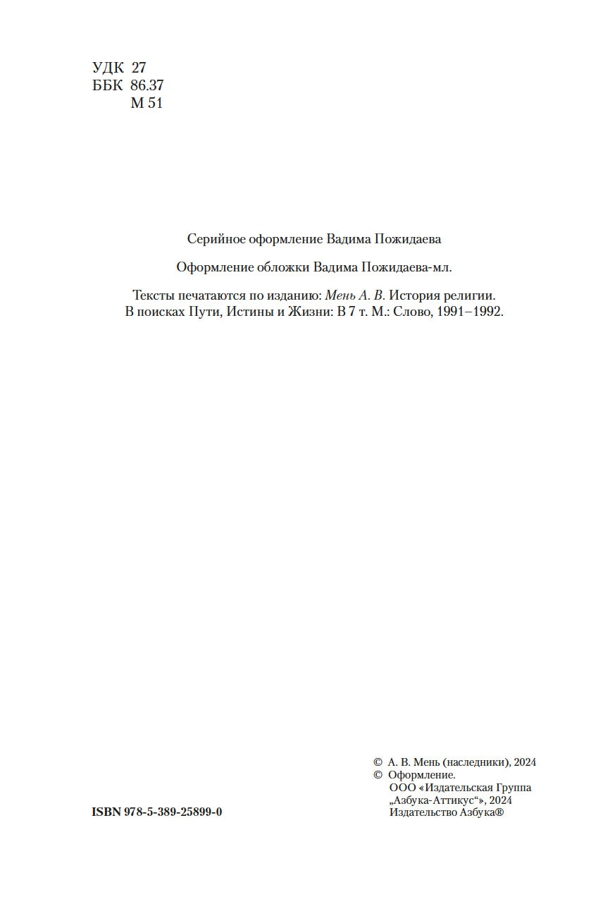 Книга "Истоки религии" (1970) открывает авторскую серию "В поисках Пути, Истины и Жизни", посвященную предыстории христианства, поискам Бога. Написанная христианином, она тем не менее ориентирована на самую широкую читательскую аудиторию, заинтересованную в непредвзятом отношении к религиозной традиции. Обширные знания, доступность изложения, доверительный разговор с читателем – качества, благодаря которым труд Александра Меня и сегодня не утрачивает актуальности.