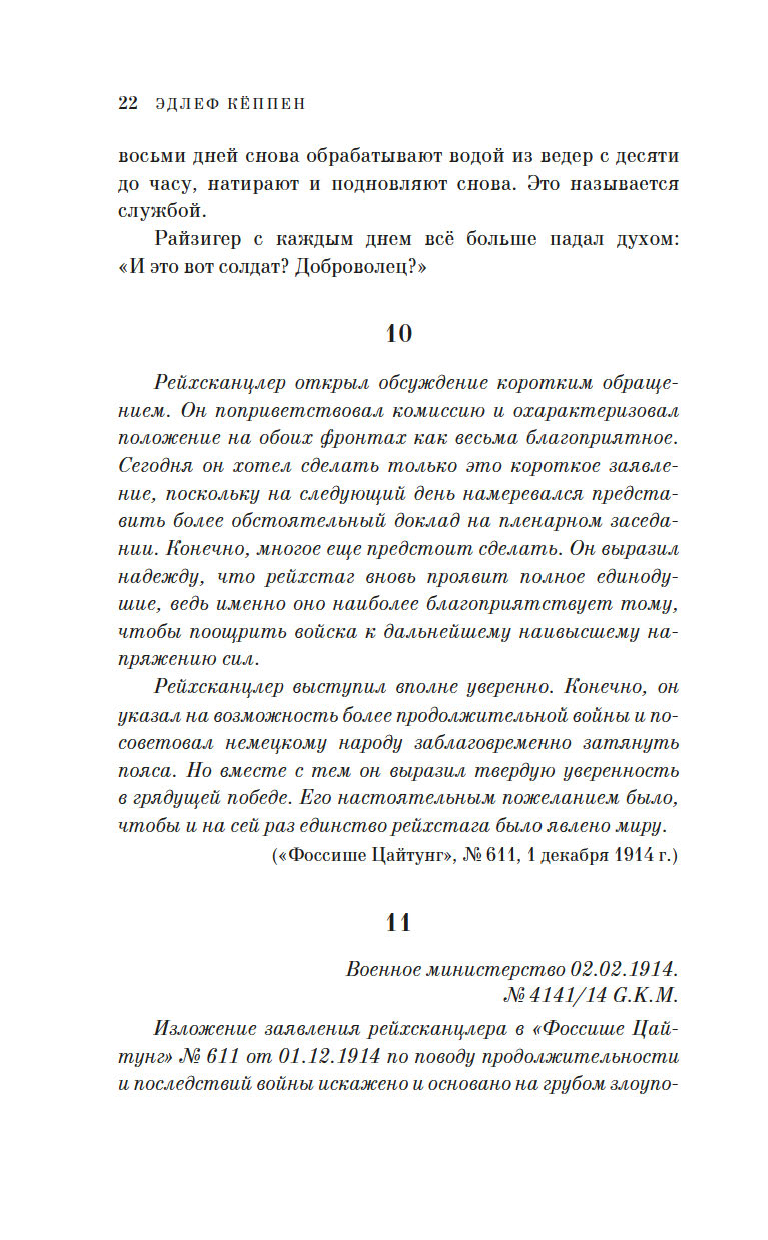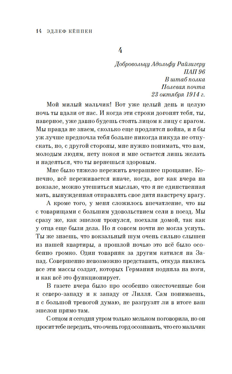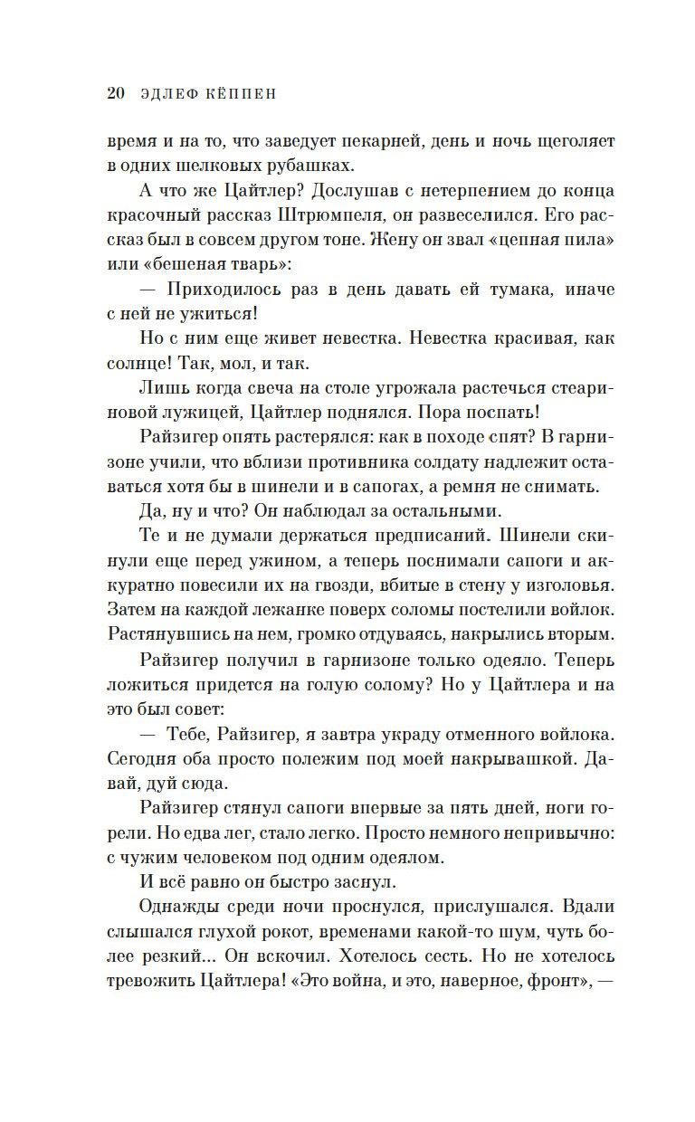 Участник Первой мировой войны, ушедший на фронт добровольцем с третьего курса философского факультета университета, Эдлеф Кёппен создал "монтажный роман", где оригинальные документы – цитаты из воззваний императора Вильгельма II, указы цензурных органов, газетные сообщения органично вплетены в сюжет, а прообразом главного героя Адольфа Райзигера является сам автор.