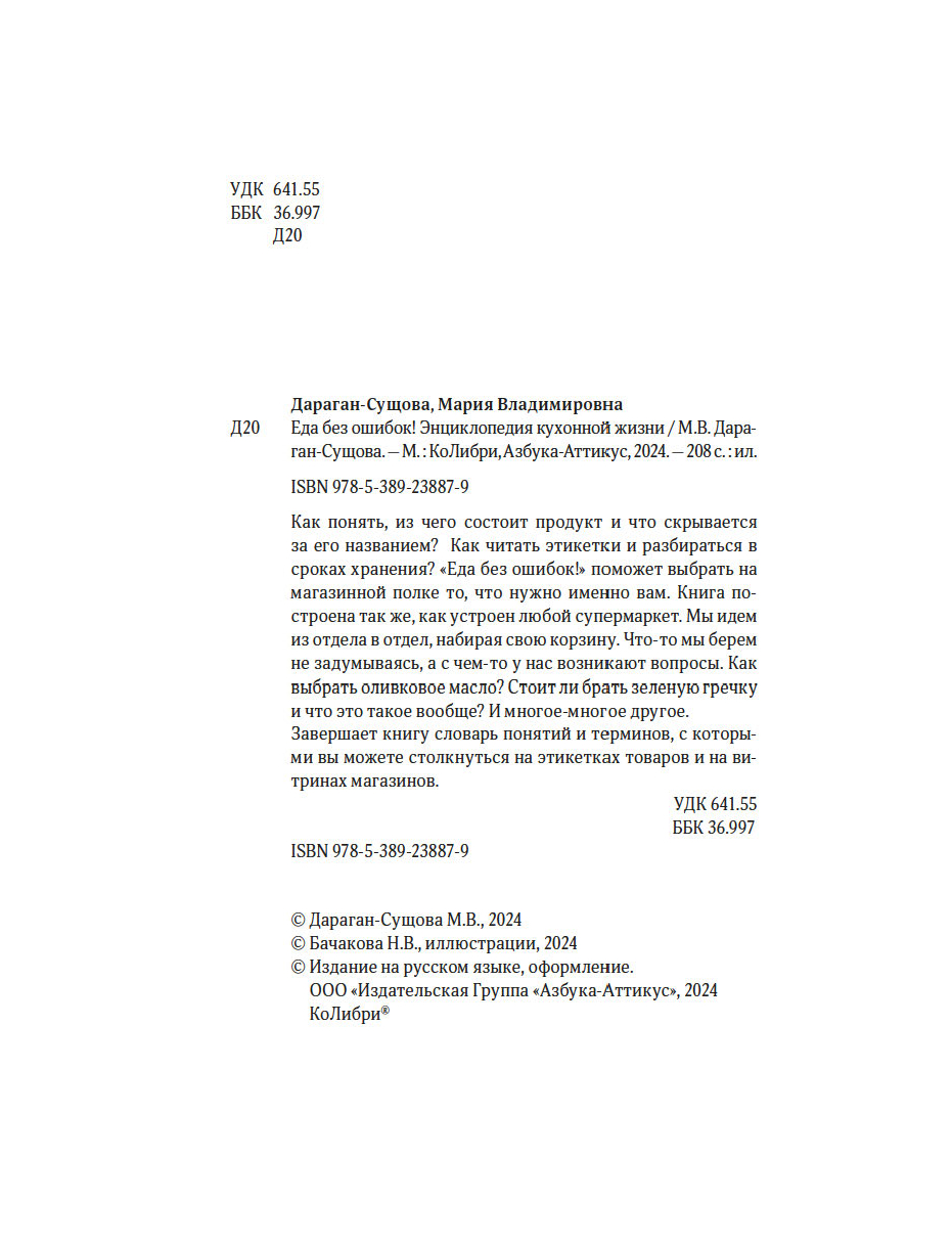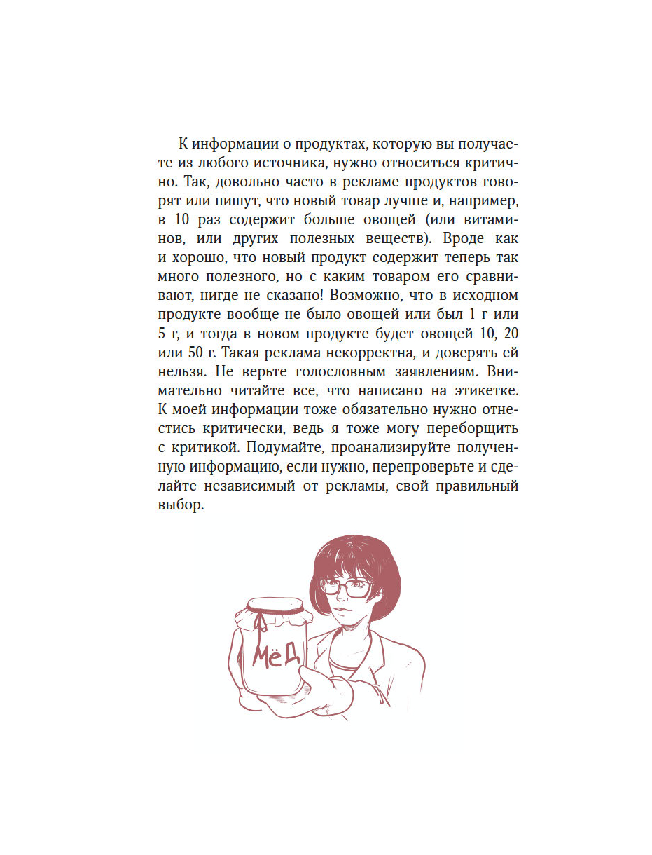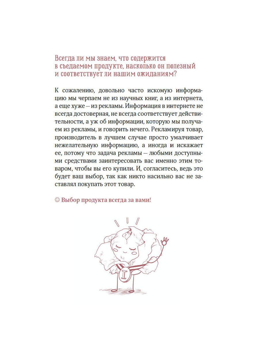 Как понять, из чего состоит продукт и что скрывается а его названием? Как читать этикетки и разбираться в сроках хранения? "Еда без ошибок!" поможет выбрать на магазинной полке то, что нужно именно вам. Книга построена так же, как устроен любой супермаркет. Мы идем из отдела в отдел, набирая свою корзину. Что-то мы берем не задумываясь, а с чем-то у нас возникают вопросы. Как выбрать оливковое масло? Стоит ли брать зеленую гречку и что это такое вообще? И многое-многое другое.