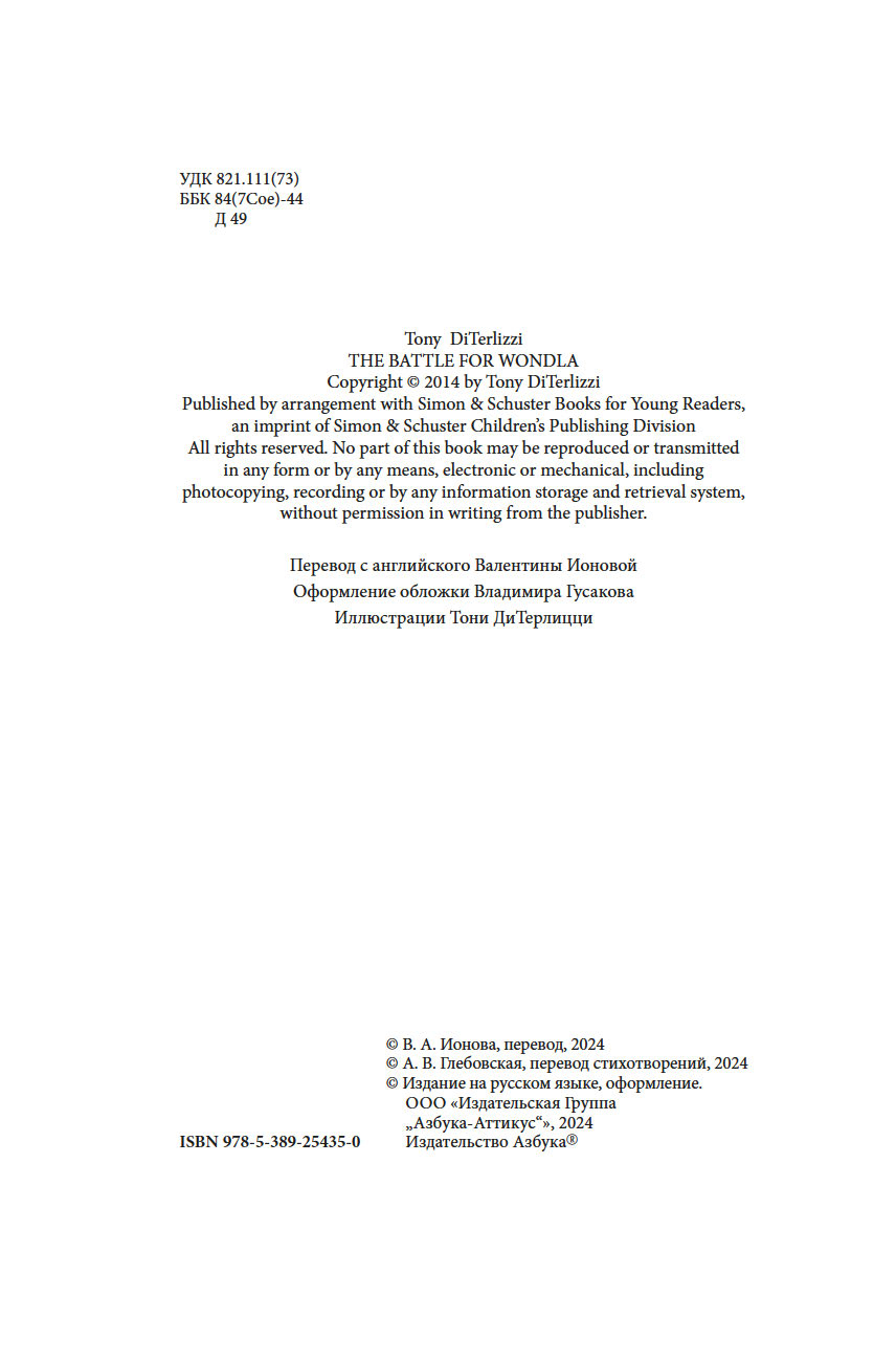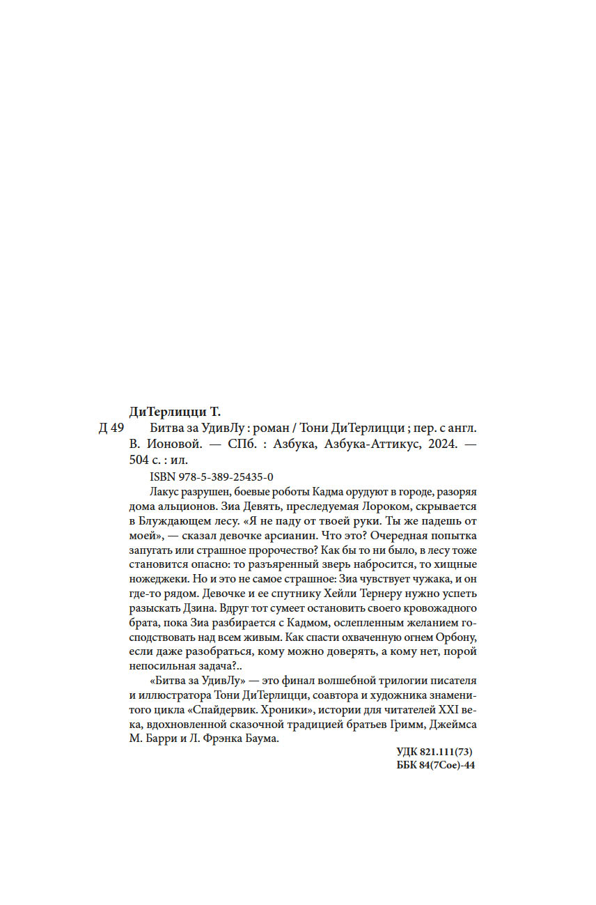 "Битва за УдивЛу" – это финал волшебной трилогии писателя и иллюстратора Тони ДиТерлицци, соавтора и художника знаменитого цикла "Спайдервик. Хроники", истории для читателей XXI века, вдохновленной сказочной традицией братьев Гримм, Джеймса М. Барри и Л. Фрэнка Баума.