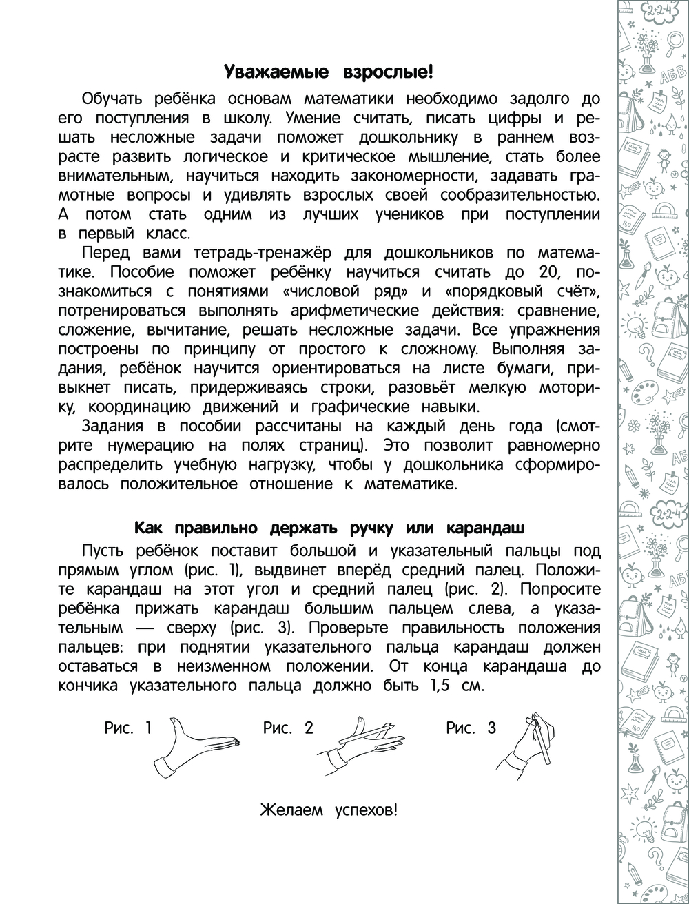 В рабочей тетради более 365 упражнений для детей от 5 лет по математике, рассчитанных на каждый день года. Это способствует равномерному распределению учебной нагрузки и формированию положительного отношения ребёнка к обучению.