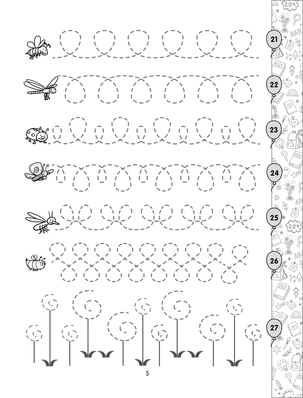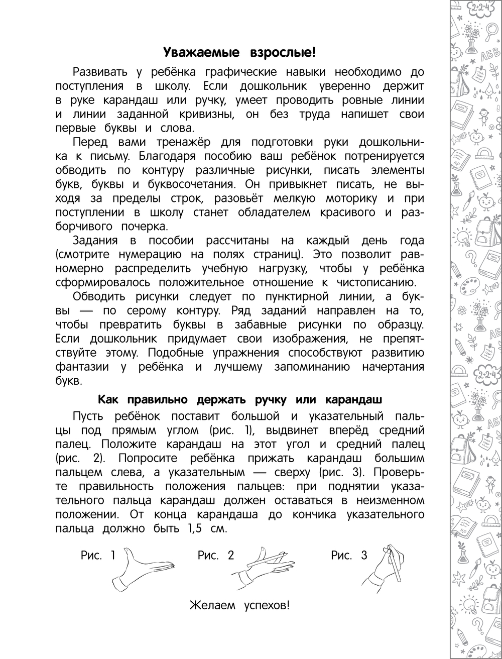 Дошкольник потренируется обводить рисунки и рисовать их по образцу, напишет элементы букв, буквы и целые слова, как это делают ученики первого класса. Книга поможет ребёнку развить графические навыки, координацию движений, научиться писать буквы русского алфавита, стать внимательным, усидчивым и аккуратным.