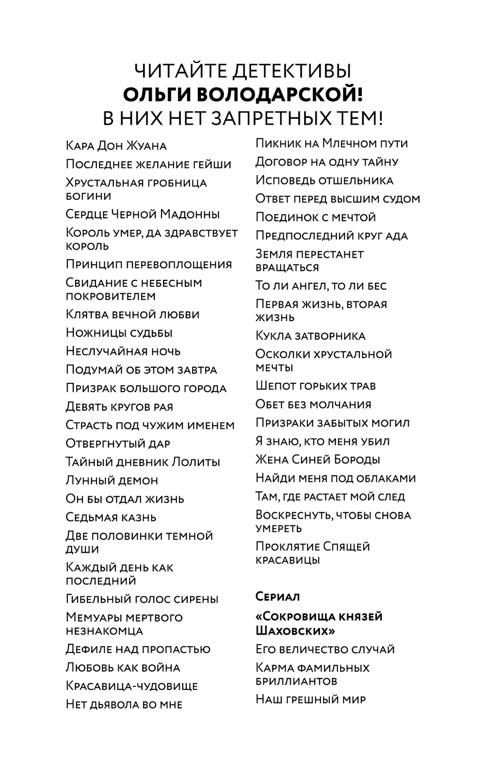 | Серия | Никаких запретных тем! Остросюжетная проза О. Володарской. Новое оформление |