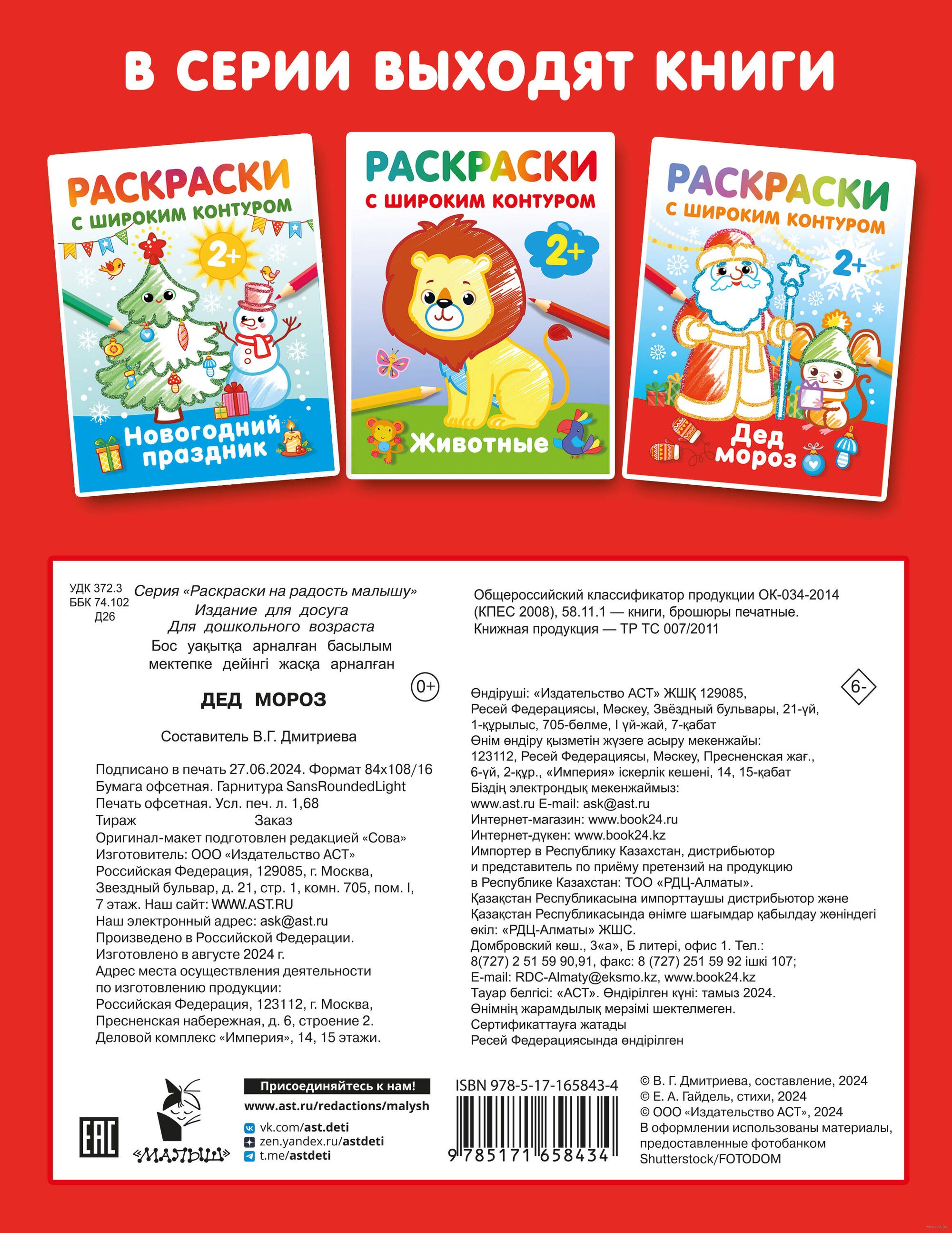 Замечательная книжка "Дед Мороз. Раскраски с широким контуром" обязательно понравится и мальчикам, и девочкам, ведь она придумана специально для самых маленьких художников, которые с нетерпением ждут наступления Нового года. На каждой странице – забавные картинки с широким цветным контуром + развивающие задания + весёлые стихи. Широкий контур поможет не "убежать" за границы картинки и подскажет, в какие цвета раскрасить каждый рисунок. На плотной бумаге можно раскрашивать цветными карандашами, а ещё – пальчиковыми красками, мелками, фломастерами.