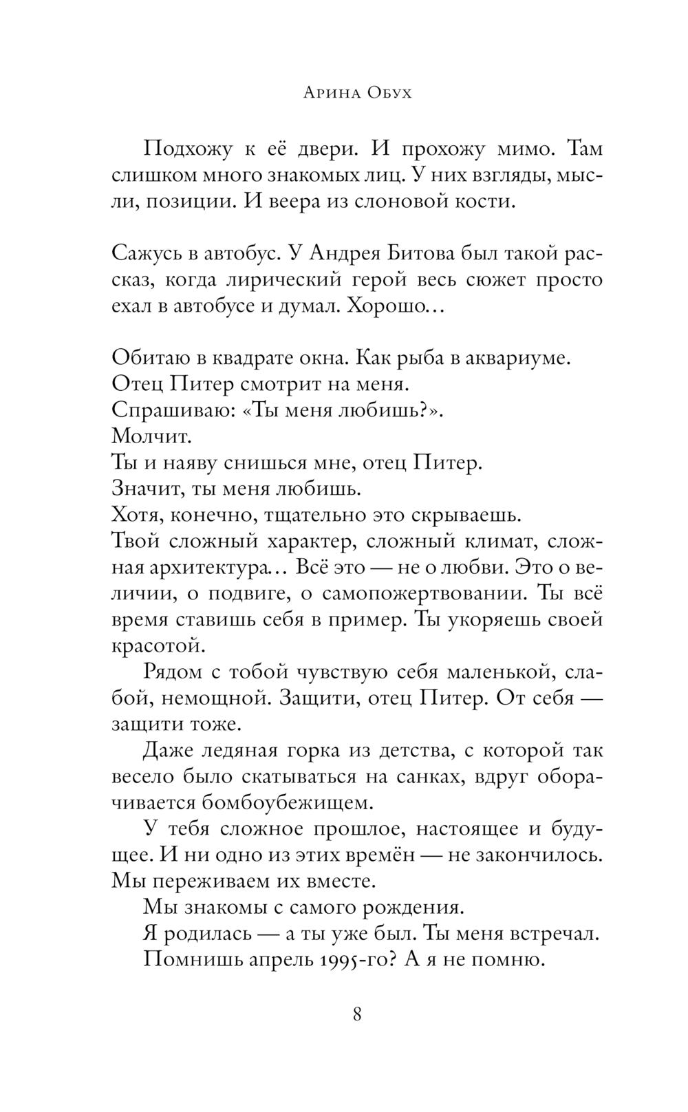 Арина Обух – писатель, художник, выпускница "Мухи имени Штиглица" и автор книги о ней, а ещё – о Петербурге: с Городом неразрывно связаны почти все её тексты.Её новая книга "Следующая остановка – "Пионерская-стрит"" – это разговор: с другом, с Городом, с Богом... С немецким человеком по имени Леон Шмидт, который услышал песню о Ленинграде – и отправился вслед за ней в Петербург. Разговор с художником, который вот уже шесть лет как умер, и с поэтами, которые стоят на Малой Конюшенной спиной к прозаику Гоголю. Разговор со смертью, которая носит розовые вьетнамки, и с Бродским, который пришёл на Васильевский остров (не умирать, а просто пришёл). Разговор с тобой.
