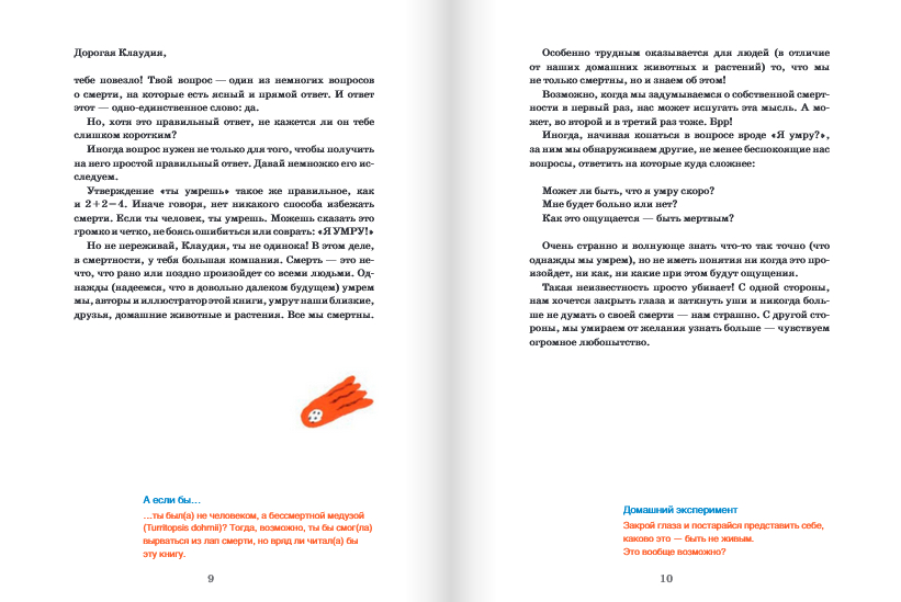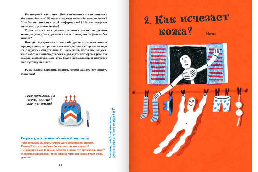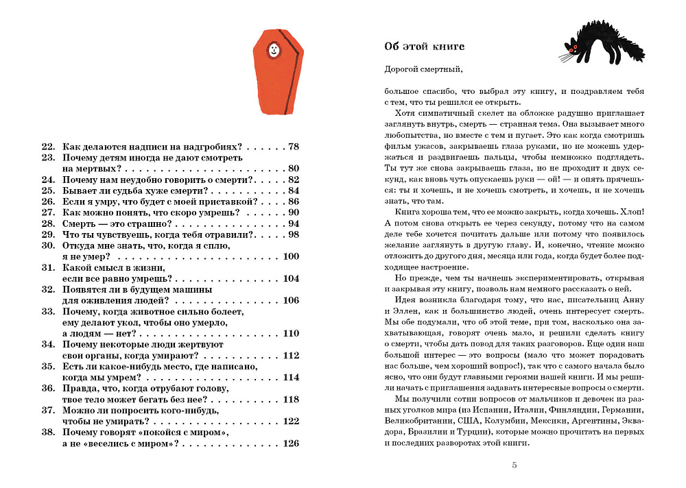 Когда умираешь, у тебя пропадают мысли? Откуда мне знать, что, когда я сплю, я не умер? Если я умру, что будет с моей приставкой? Смерть – это страшно? Правда, что когда отрубают голову, твое тело бегает без головы? Если умирает кто-то, кого ты любишь, сколько времени ты горюешь? В будущем появятся машины для оживления людей? Почему говорят "покойся с миром", а не "веселись с миром"?