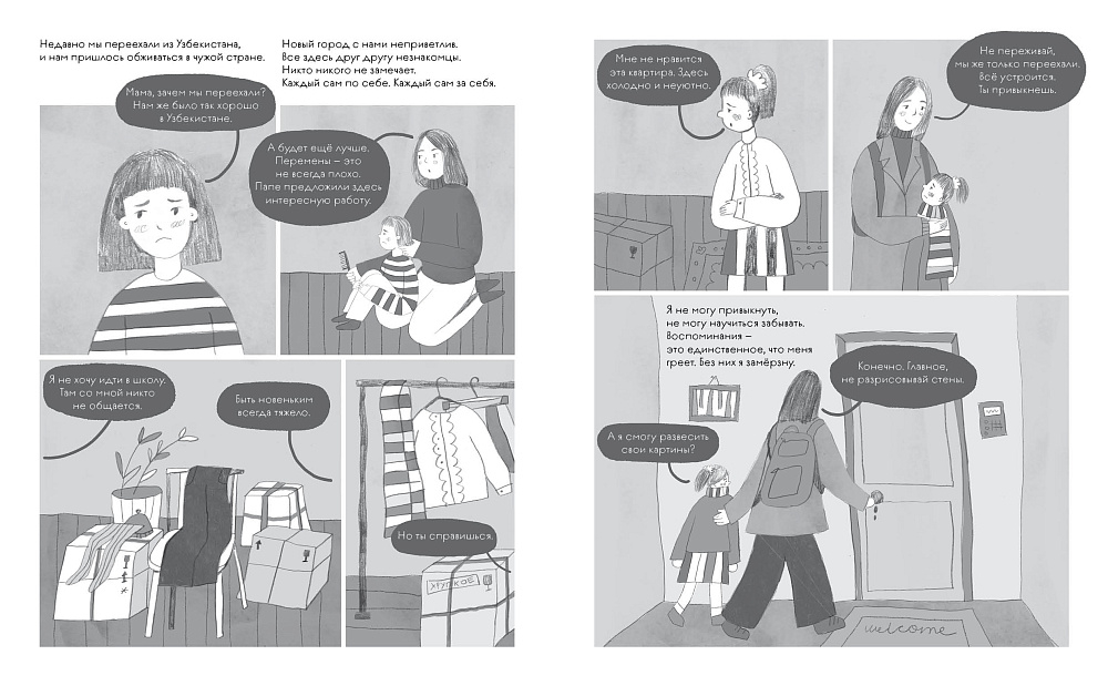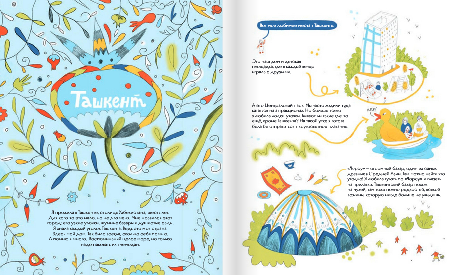 Воспоминания сплетаются в узор, в причудливый орнамент, за которым угадывается далёкая солнечная страна. Страна, из которой Аля уехала в шесть лет. Страна, где остались те, кто был ей дорог. Шумные базары и узкие улочки дружелюбного Ташкента сменили широкие проспекты серого города. И вот уже Але и её семье приходится обживать новый дом, покорять другую страну, осваивать незнакомый чёрно-белый мир, который пришёл на смену старому – расцвеченному яркими красками. Как жить тем, кто уезжает, и тем, кто остаётся? Как смотреть в будущее, если хочется вернуться в прошлое? И как научиться принимать новое, оставаясь самим собой?
