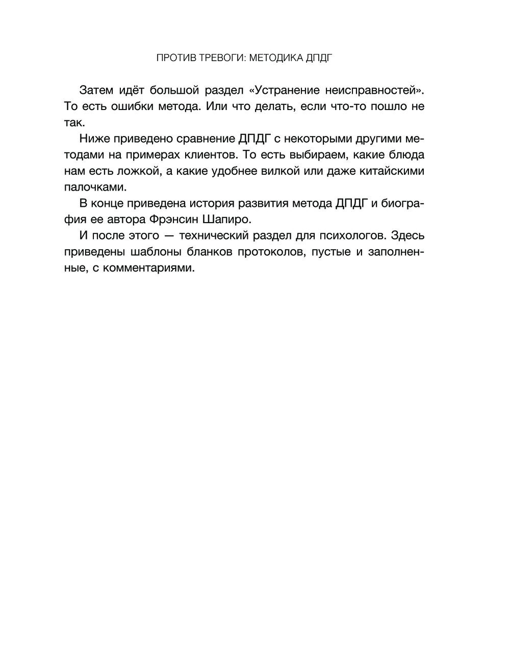 По всему миру психологи МЧС и служб спасения используют технику ДПДГ, чтобы вывести людей из шоковых состояний при массовых катастрофах. Однако этот метод применим и для более бытовых стрессов, страхов, неприятных воспоминаний: измены, воспоминания после операций, изнасилования, драки, страхи собак, высоты, самолетов, лифтов, стоматологов, темноты, страх заболеть – любые фобии можно проработать.
