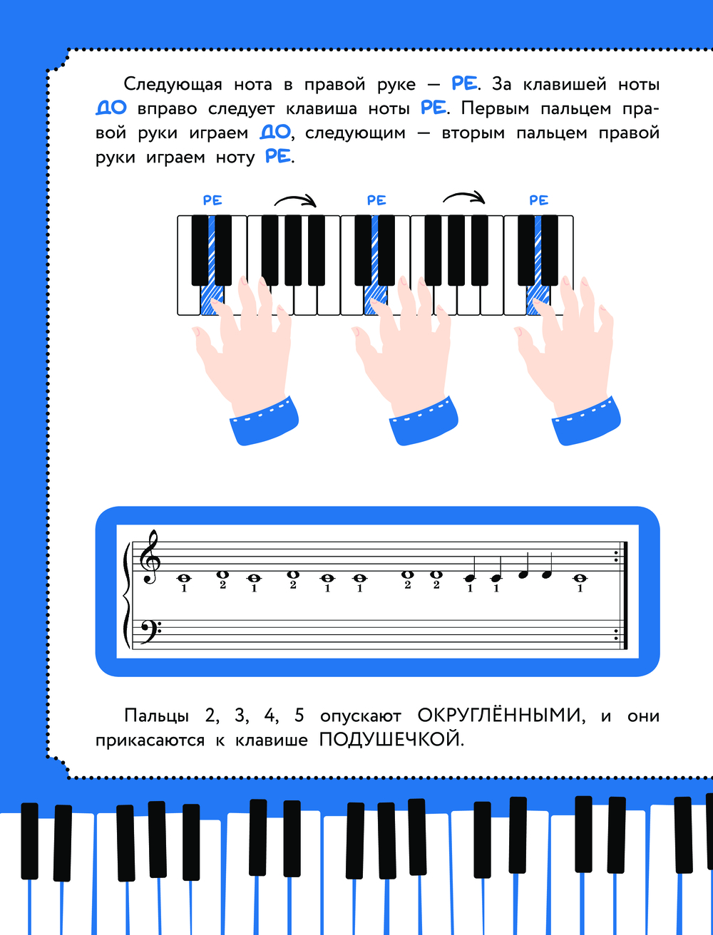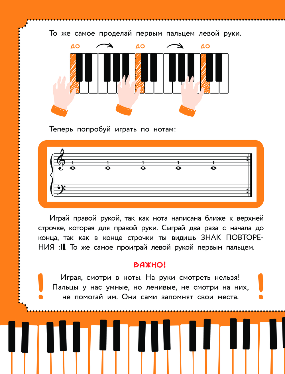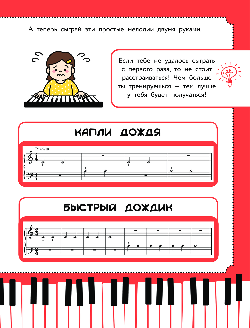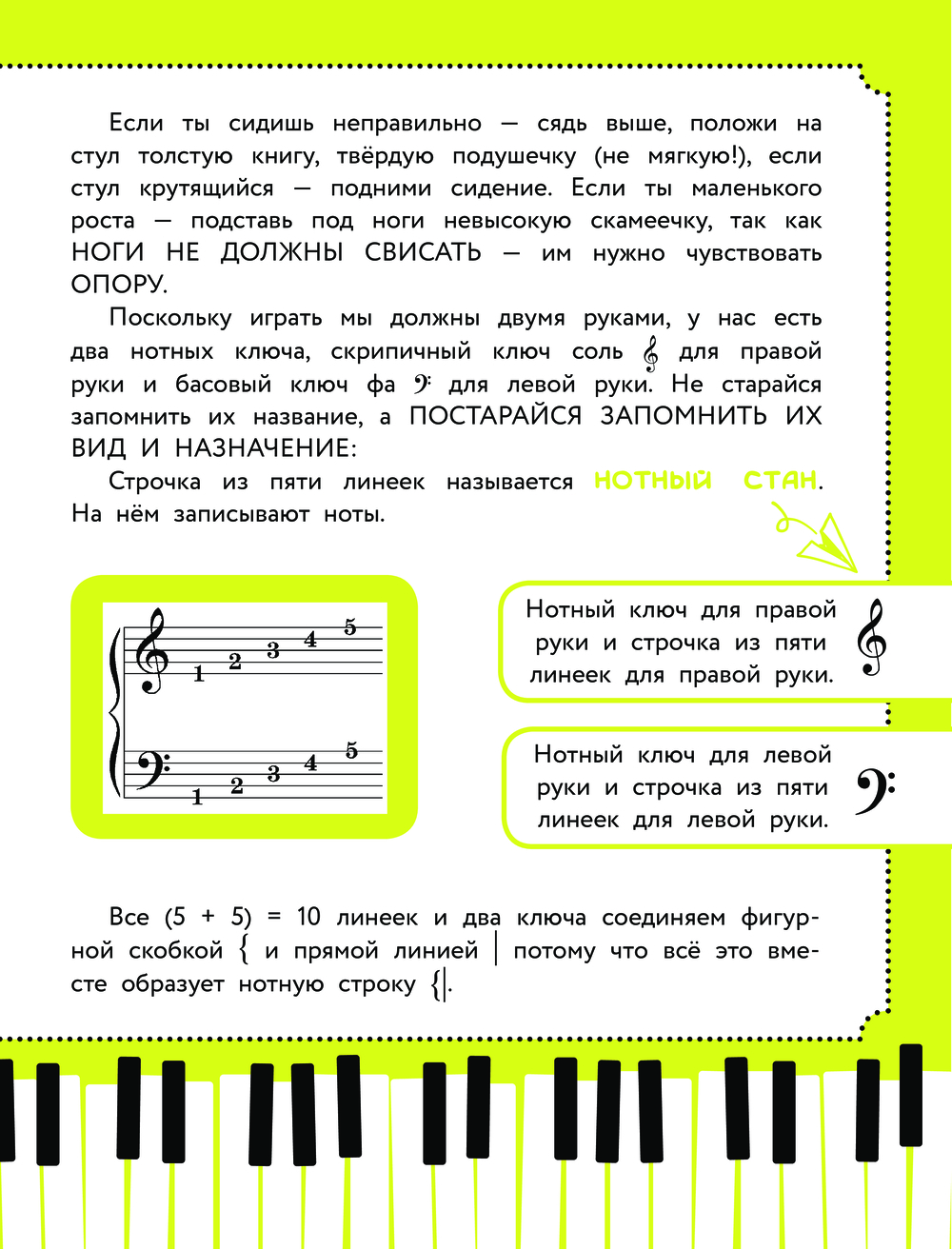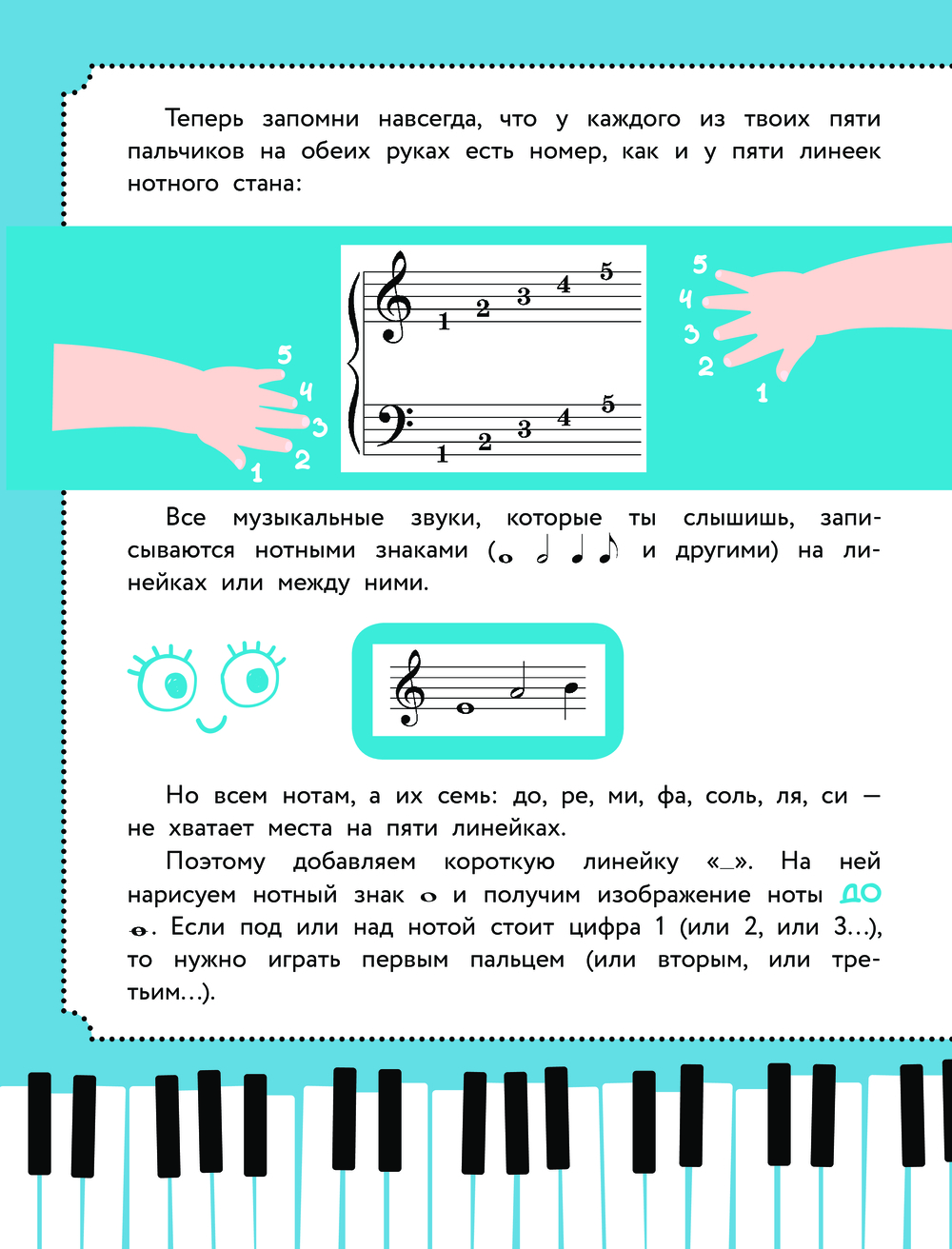 Обучение будет проходить легко и быстро, ведь внутри книги ребёнка ожидают: яркий набор наклеек для клавиш фортепиано с подписанными нотами; адаптированные пьесы, которые постепенно усложняются; крупный шрифт и красочное оформление!