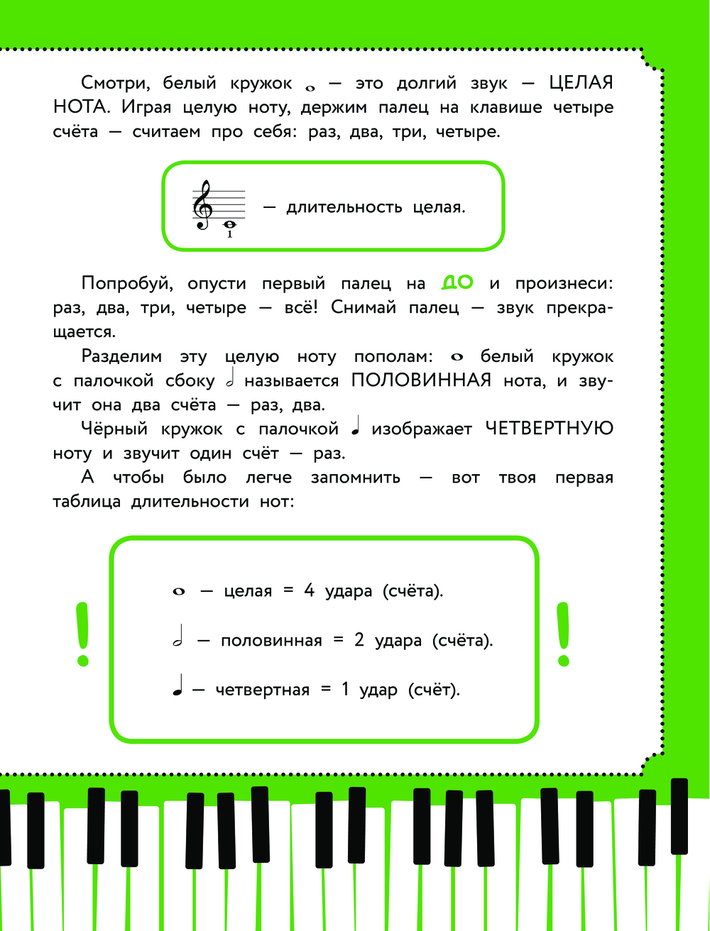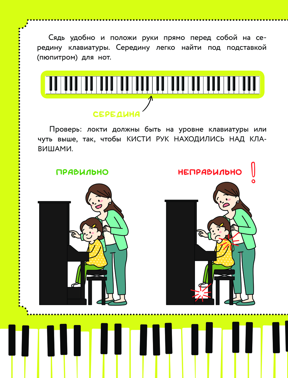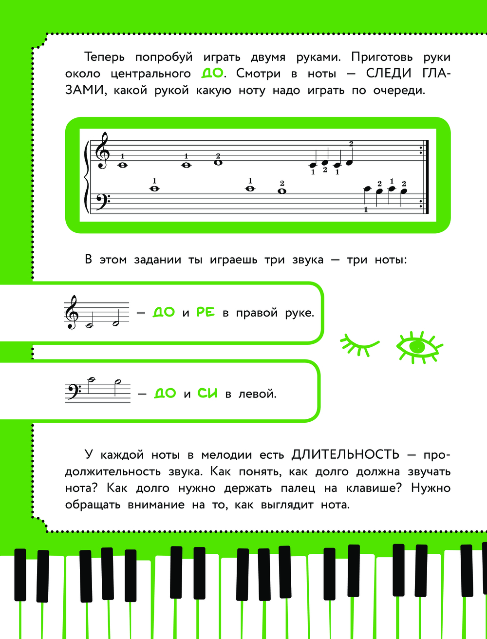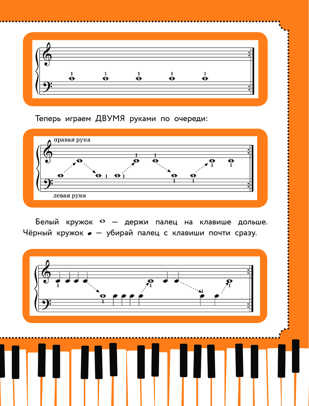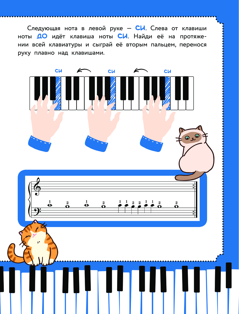 Обучение будет проходить легко и быстро, ведь внутри книги ребёнка ожидают: яркий набор наклеек для клавиш фортепиано с подписанными нотами; адаптированные пьесы, которые постепенно усложняются; крупный шрифт и красочное оформление!