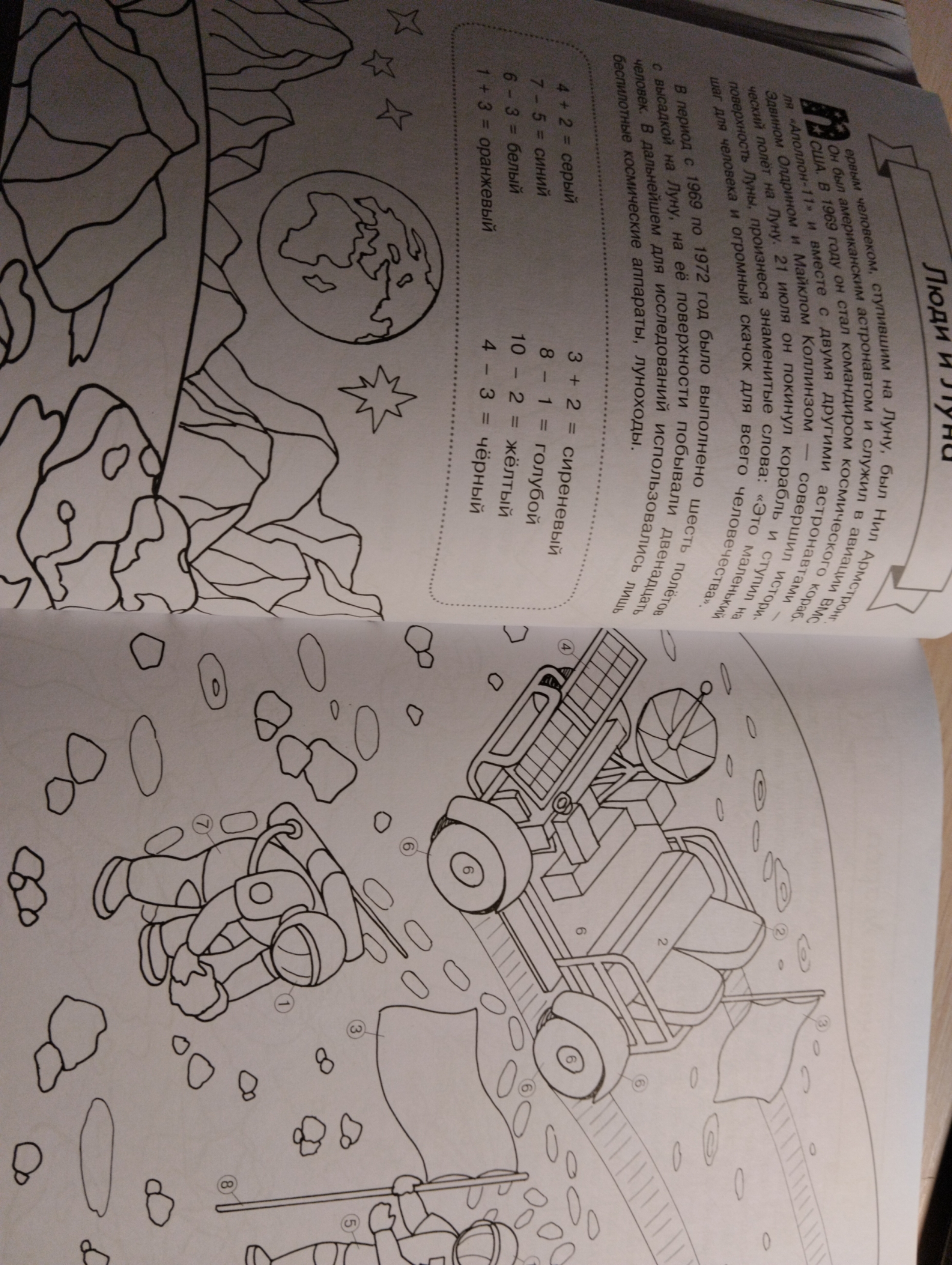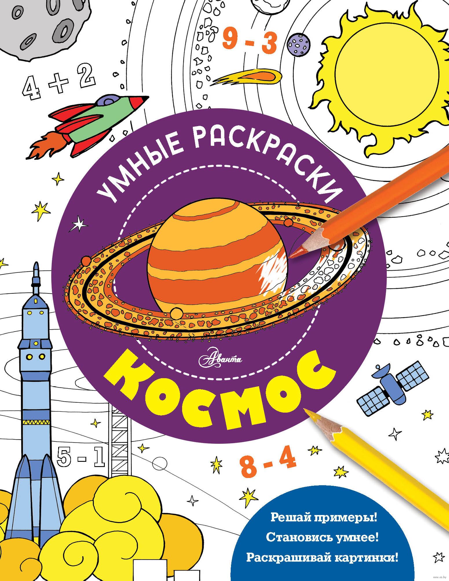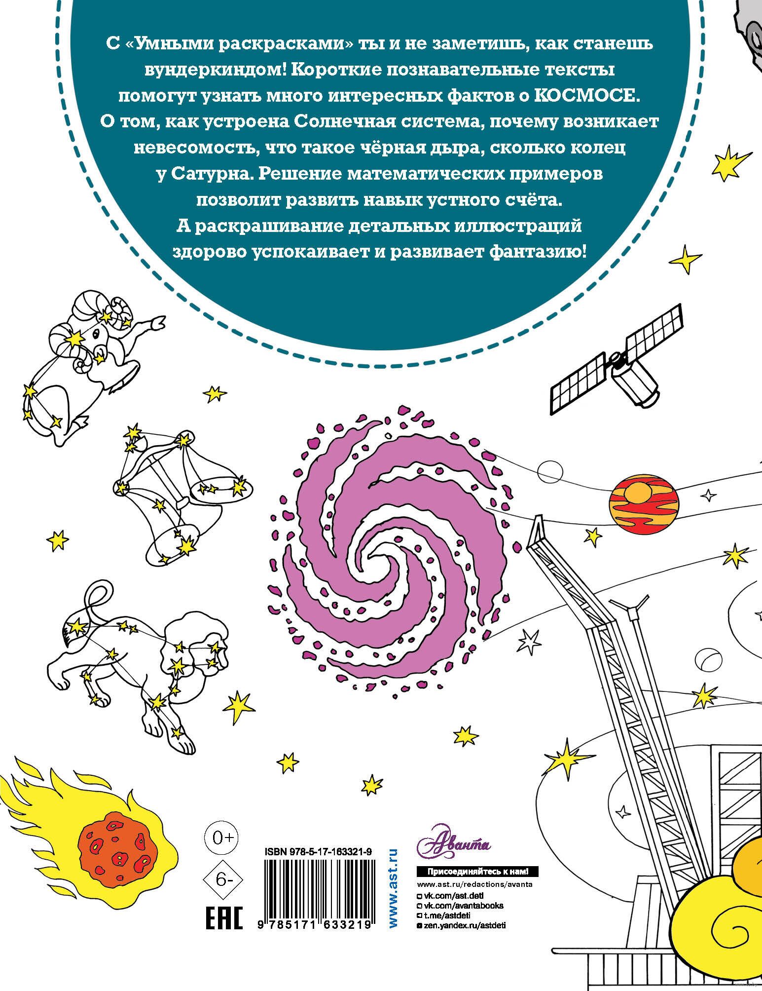 Эта книга – не просто раскраска, а самая настоящая маленькая энциклопедия, которая познакомит ребёнка с интересными фактами о космосе, расскажет, как разные народы представляли себе устройство Земли, какие бывают галактики, сколько планет в Солнечной системе, что такое квазар и чёрная дыра, какие бывают созвездия. Ребёнок сможет раскрасить подробные иллюстрации и попутно потренировать навык устного счёта, ведь на каждом развороте есть математические примеры, которые помогут выбрать нужный цвет.