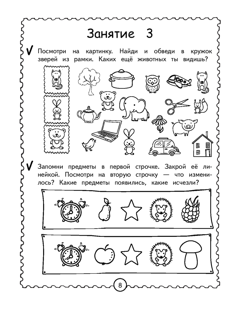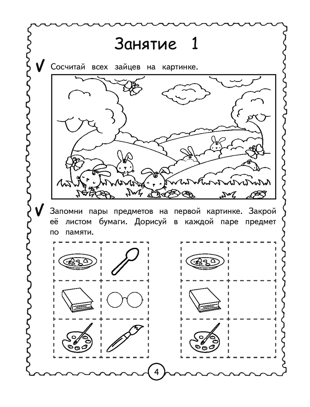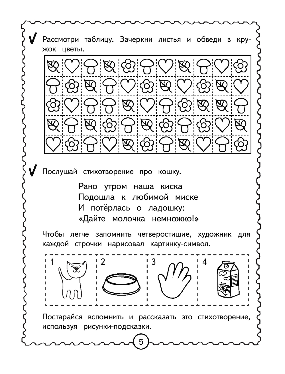 Каждый разворот книги – отдельное занятие, рассчитанное на 15 минут и состоящее из занимательных заданий. Выполняя увлекательные задания, дошкольник будет вспоминать четверостишия, используя картинки и схемы, перерисовывать по клеткам, дорисовывать половинки, искать отличия, проходить лабиринты, объединять предметы в пары, искать лишнее и др. Представленные в книге развивающие задания помогут ребёнку в игровой форме усовершенствовать такие свойства внимания, как: устойчивость, сосредоточенность, переключаемость, распределение и объём, а также потренировать кратковременную и долговременную память.