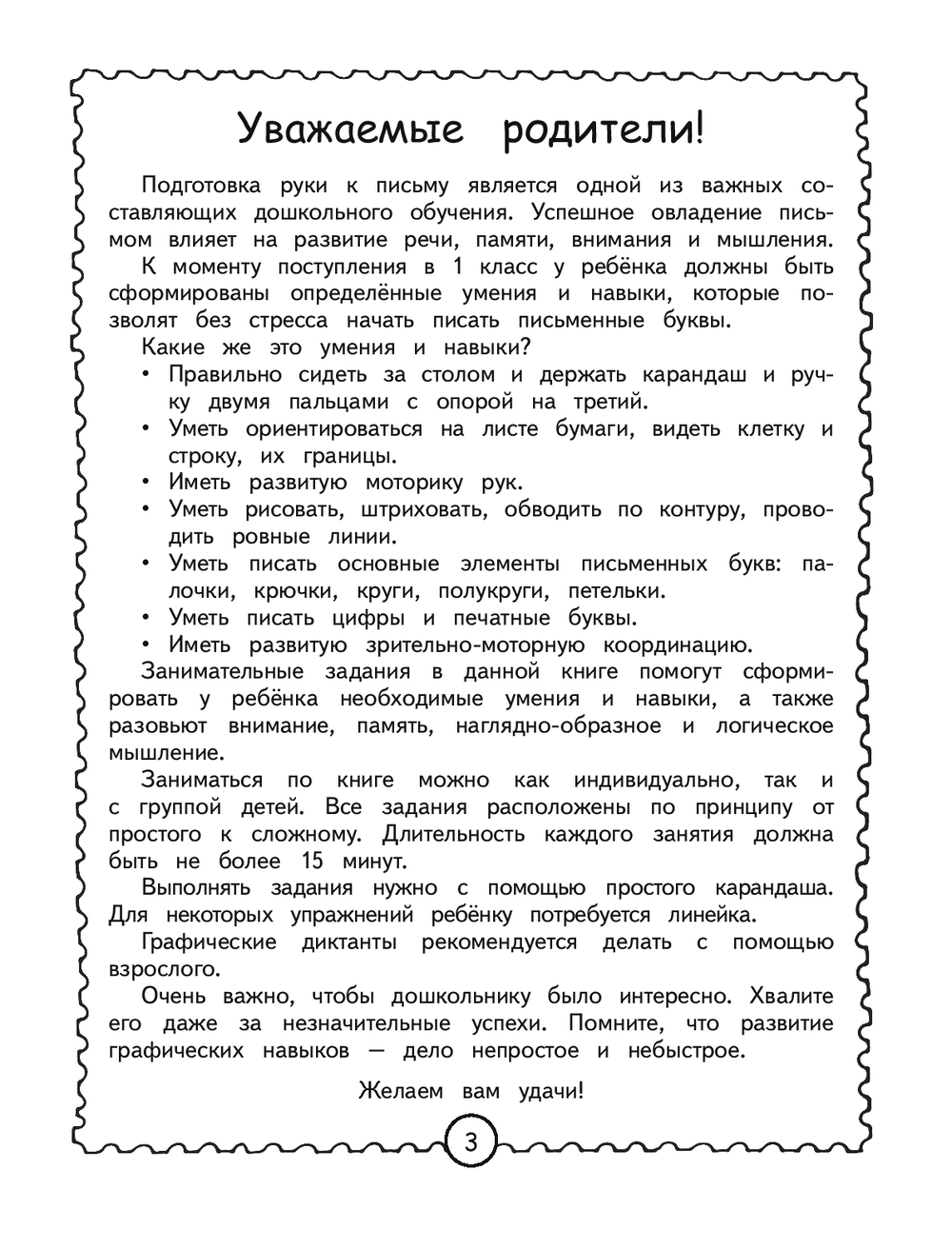 Цель пособия – развить у ребенка графические навыки и подготовить его к школе через развитие основных психических функций и познавательных способностей. Каждое занятие представлено в игровой форме, содержит задания по обучению письму в линейку и в клетку и рассчитано на 15 минут. Выполняя увлекательные упражнения, ребенок будет штриховать, обводить по пунктиру, дорисовывать половинки, рисовать по точкам, научится писать цифры, печатные буквы, элементы письменных букв и многое другое.