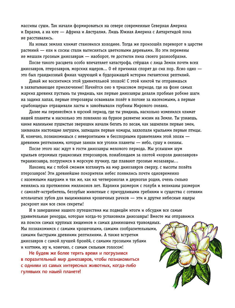 Это подарочное издание приятно удивит всех яркой рельефной обложкой, большим форматом и занимательными иллюстрациями на каждой странице. Особая фишка книги – раздел "Портретная галерея", где динозавры с удовольствием расскажут о себе от первого лица и поделятся своими уникальными тайнами!