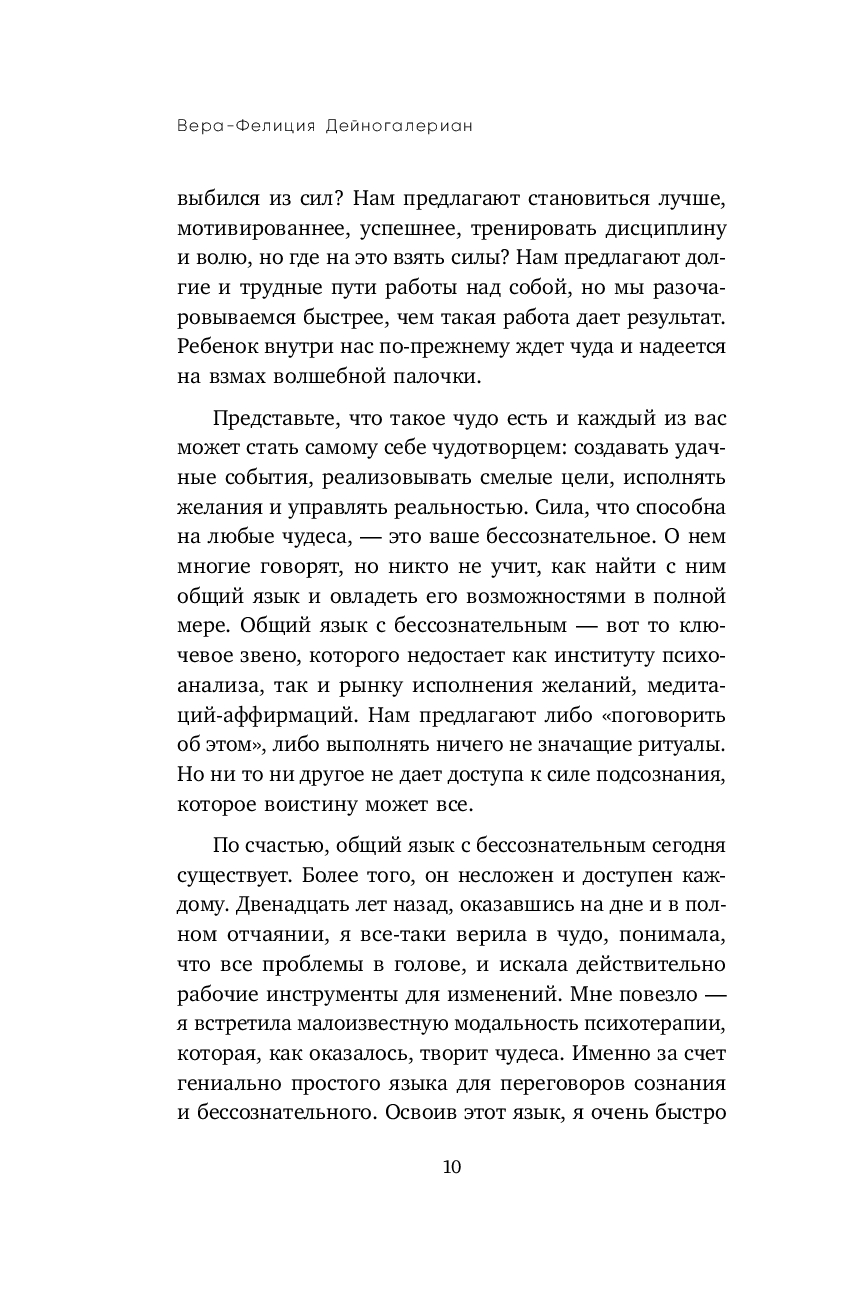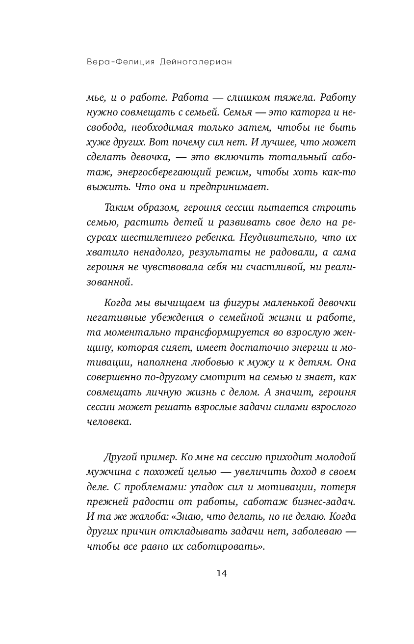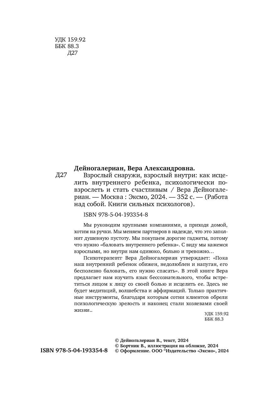 Психотерапевт Вера Дейногалериан утверждает: "Пока наш внутренний ребенок обижен, недолюблен и напуган, его бесполезно баловать, – его нужно спасать". В этой книге Вера предлагает нам изучить язык бессознательного, чтобы встретиться лицом к лицу со своей болью и исцелить ее. Здесь не будет медитаций, волшебства и аффирмаций. Только практичные инструменты, благодаря которым сотни клиентов обрели психологическую зрелость и наконец стали хозяевами своей жизни.