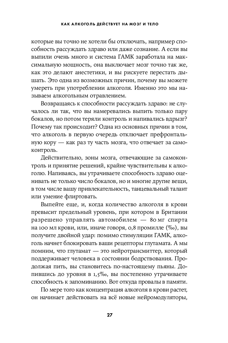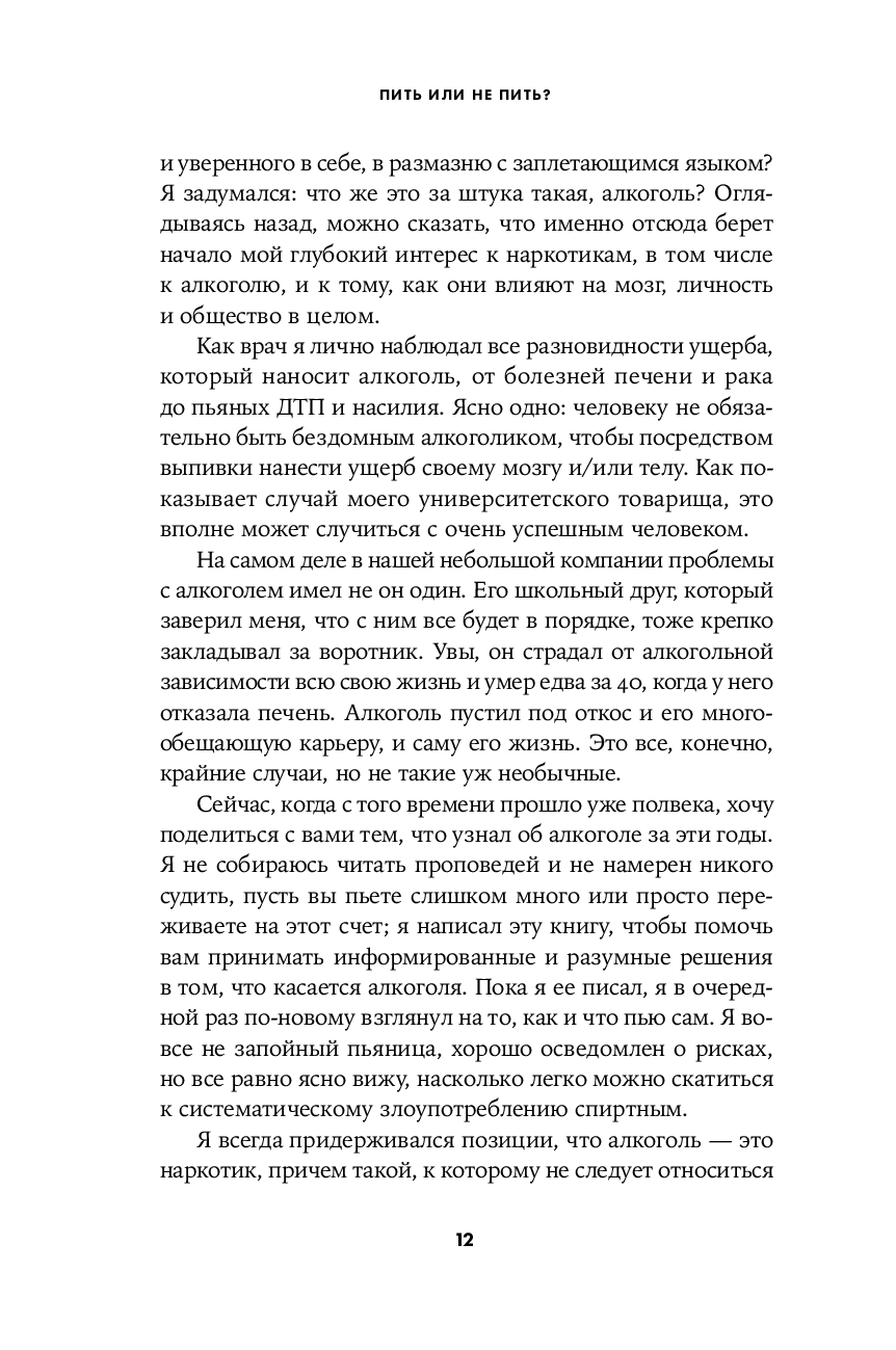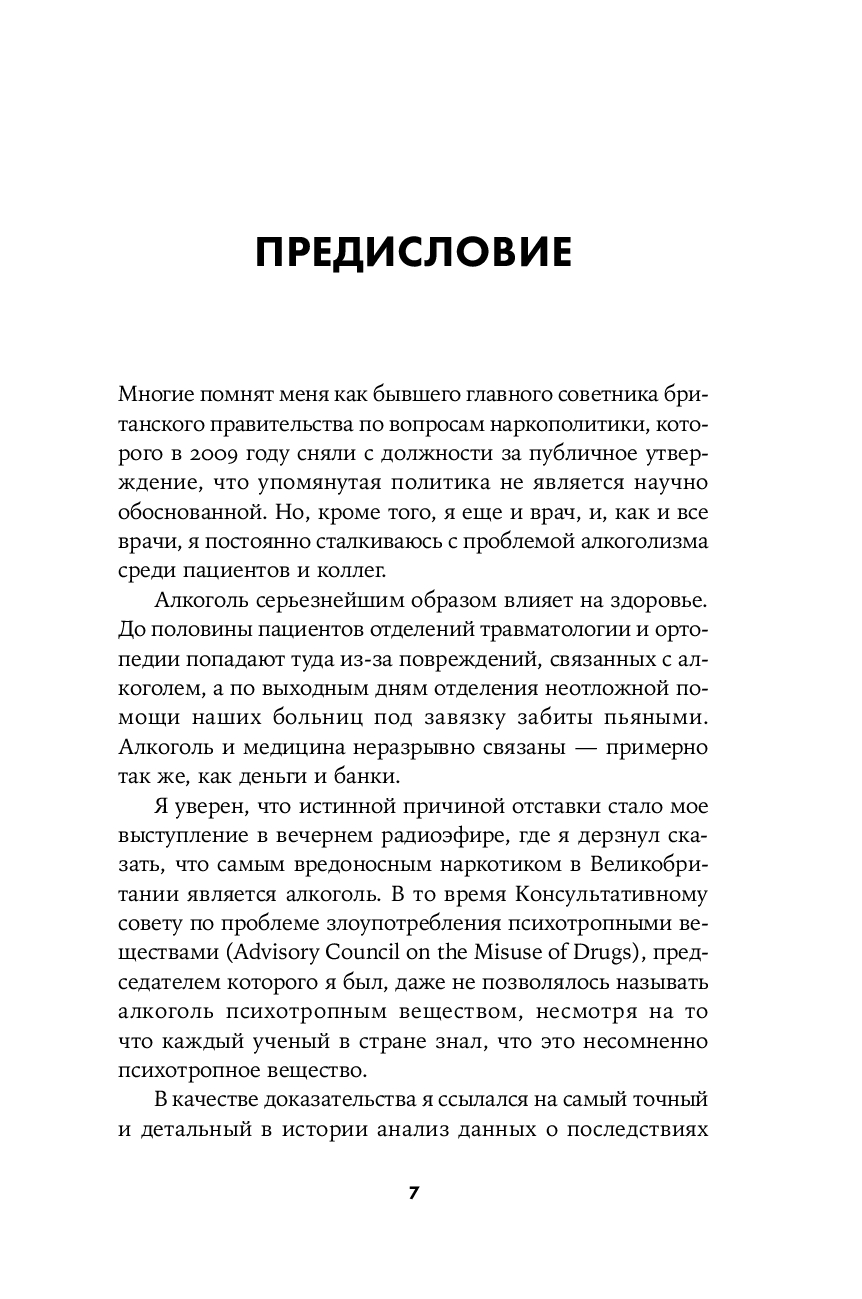 В своей книге Натт постарался простым языком ответить на бесчисленные вопросы, связанные с уходящим во тьму веков симбиозом человека и этанола. Почему алкоголь – наркотик? Как он действует на нашу психику? Как избежать похмелья? Почему от пьянства особенно страдает печень? Каковы социальные преимущества выпивки? Как понять, что у тебя формируется зависимость? Бывают ли успешные алкоголики? Какие стратегии помогают контролировать употребление алкоголя? Виноват ли алкоголик в своем положении? Как работают различные лекарственные препараты для лечения алкогольной зависимости? Что должны предпринимать в этой связи правительства?