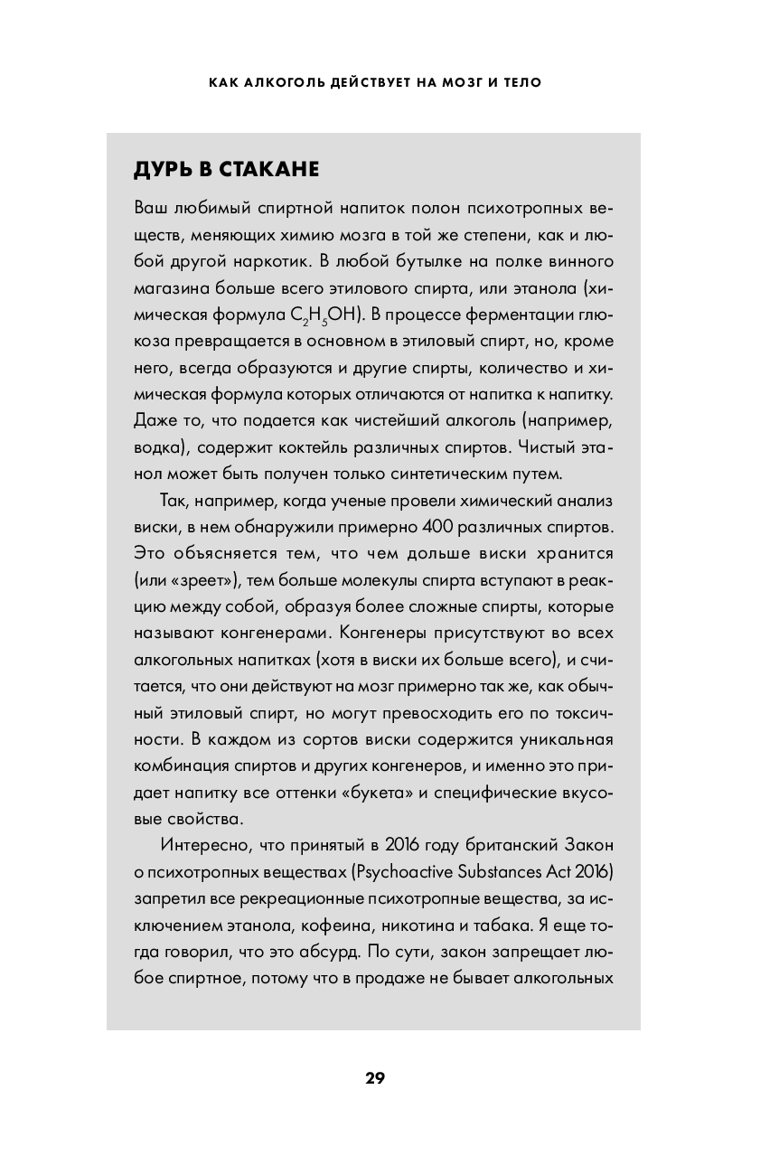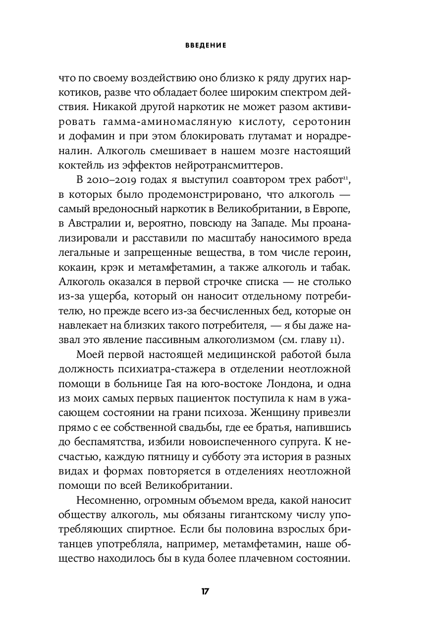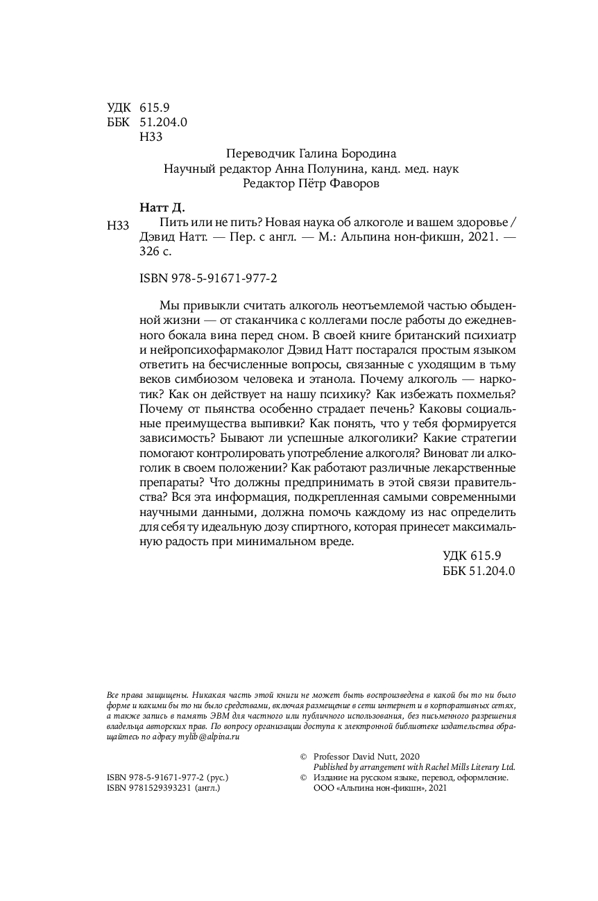 В своей книге Натт постарался простым языком ответить на бесчисленные вопросы, связанные с уходящим во тьму веков симбиозом человека и этанола. Почему алкоголь – наркотик? Как он действует на нашу психику? Как избежать похмелья? Почему от пьянства особенно страдает печень? Каковы социальные преимущества выпивки? Как понять, что у тебя формируется зависимость? Бывают ли успешные алкоголики? Какие стратегии помогают контролировать употребление алкоголя? Виноват ли алкоголик в своем положении? Как работают различные лекарственные препараты для лечения алкогольной зависимости? Что должны предпринимать в этой связи правительства?
