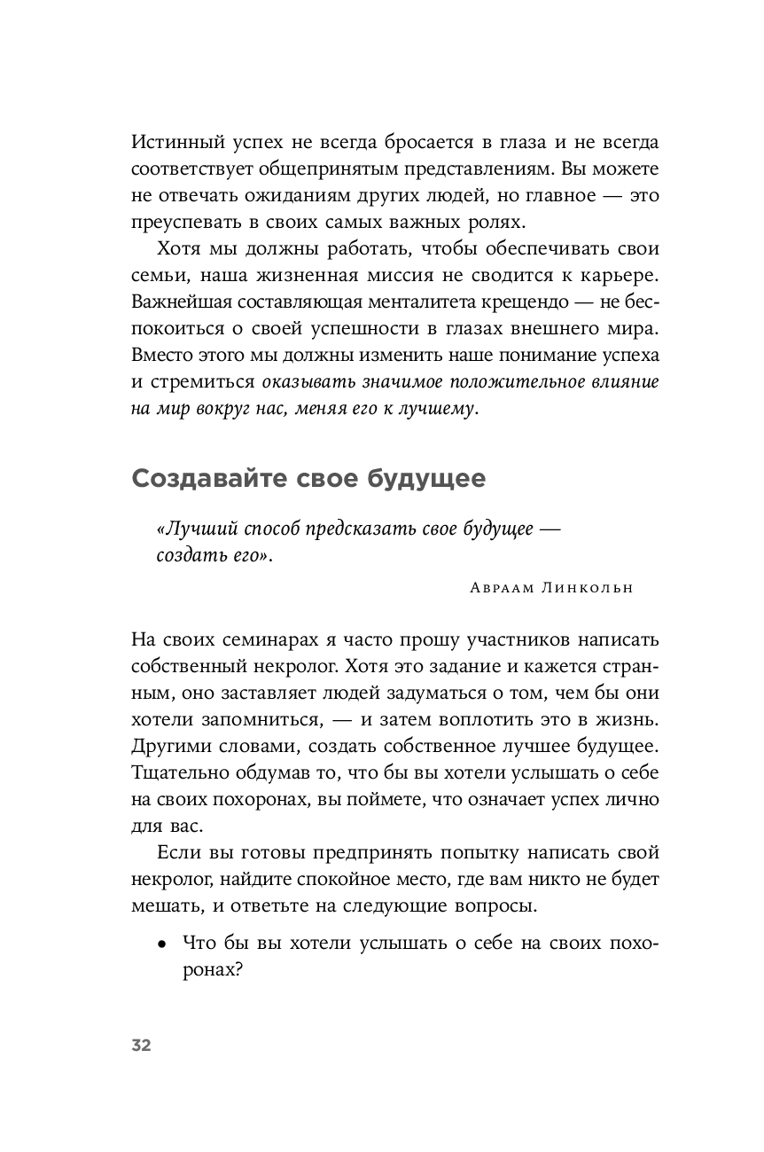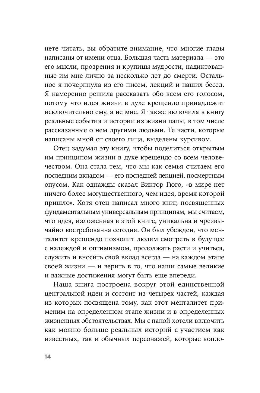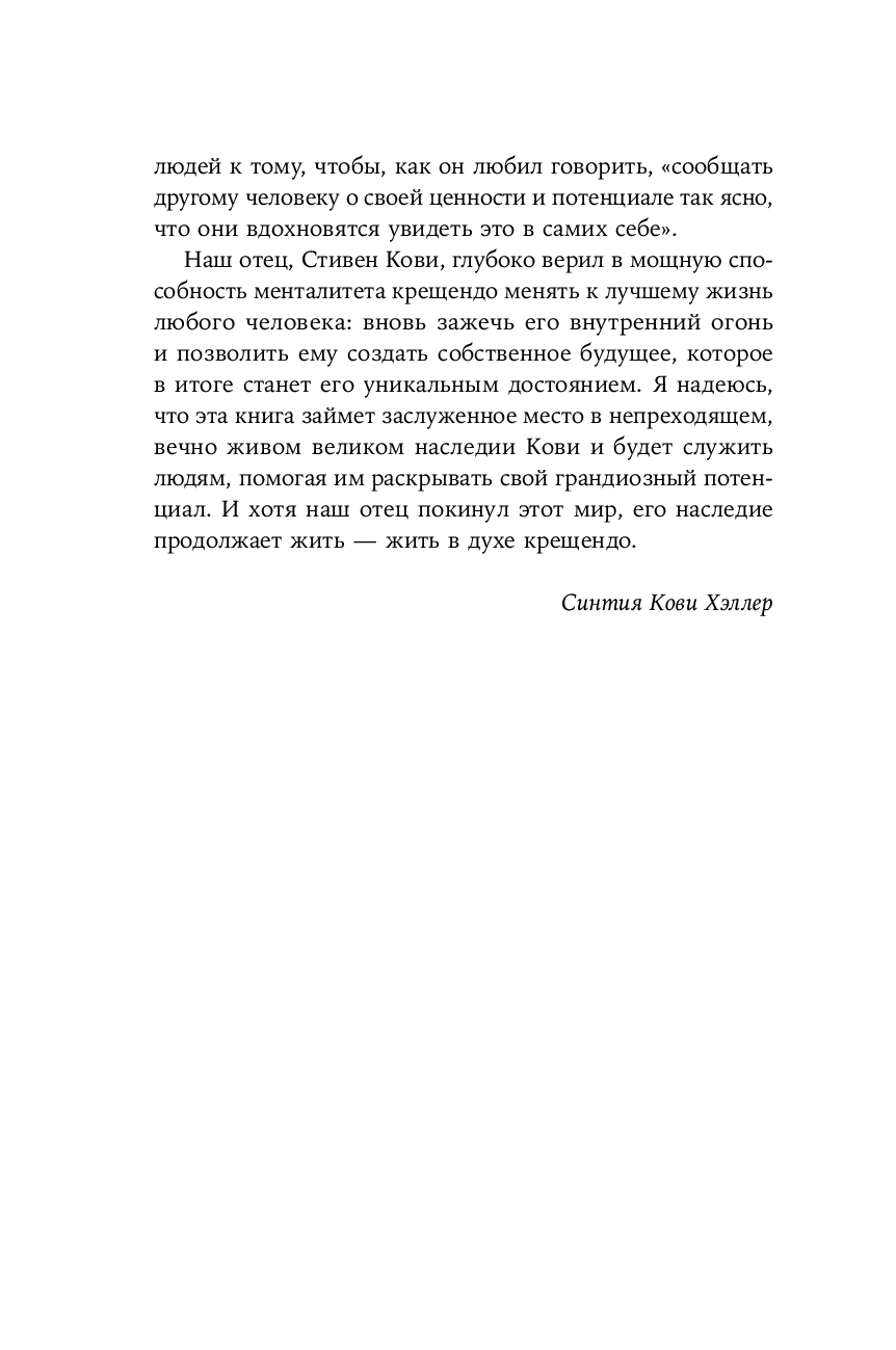 Выдающийся специалист в области лидерства, автор "Семи навыков высокоэффективных людей" и других мировых бестселлеров Стивен Р. Кови задумал свою последнюю книгу, стремясь поделиться с читателями принципами жизни в духе крещендо, которыми руководствовался сам. Он был убежден, что эти принципы способны изменить к лучшему жизнь каждого человека, подсказать ответы на фундаментальные вопросы, раскрыть потенциал и придать сил в любом возрасте. В музыкальной теории крещендо – это постепенное нарастание громкости и интенсивности звука, а жизнь в духе крещендо означает непрерывный личный и профессиональный рост, увеличение своего вклада в развитие общества.