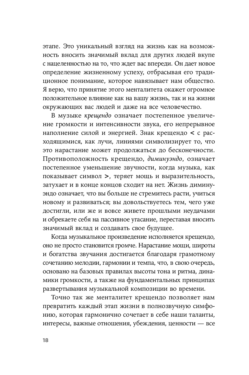 Каждая из четырех частей этой удивительной книги посвящена применению менталитета крещендо на определенном этапе жизни. В ней вы найдете множество историй людей, которым удалось изменить жизнь к лучшему при помощи следования принципу "ваше самое важное дело всегда впереди".