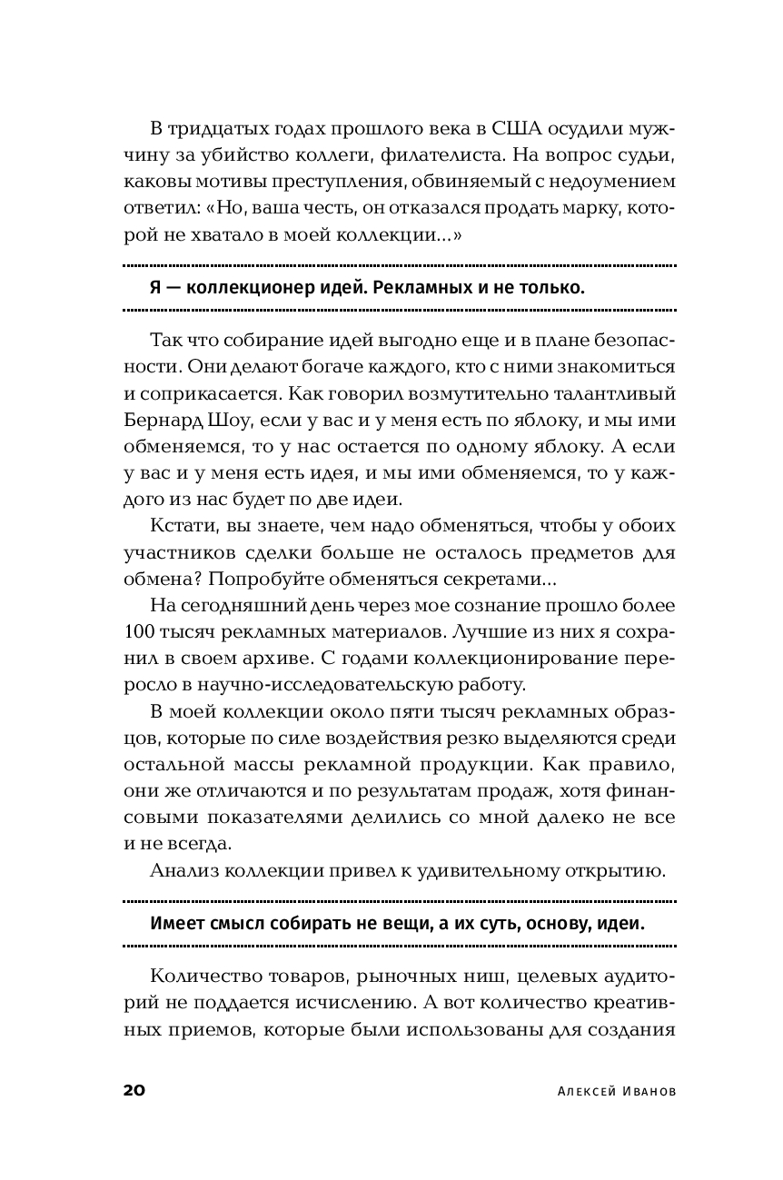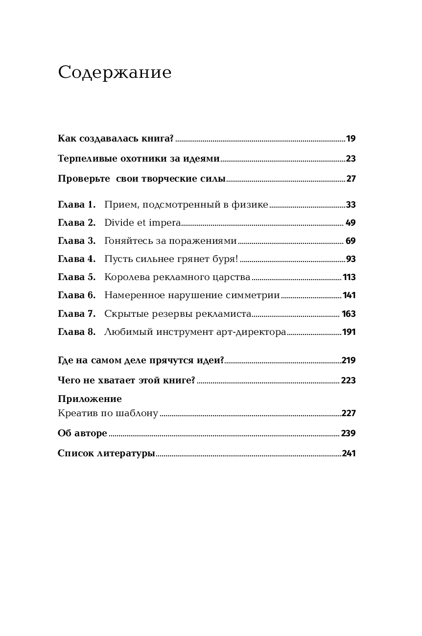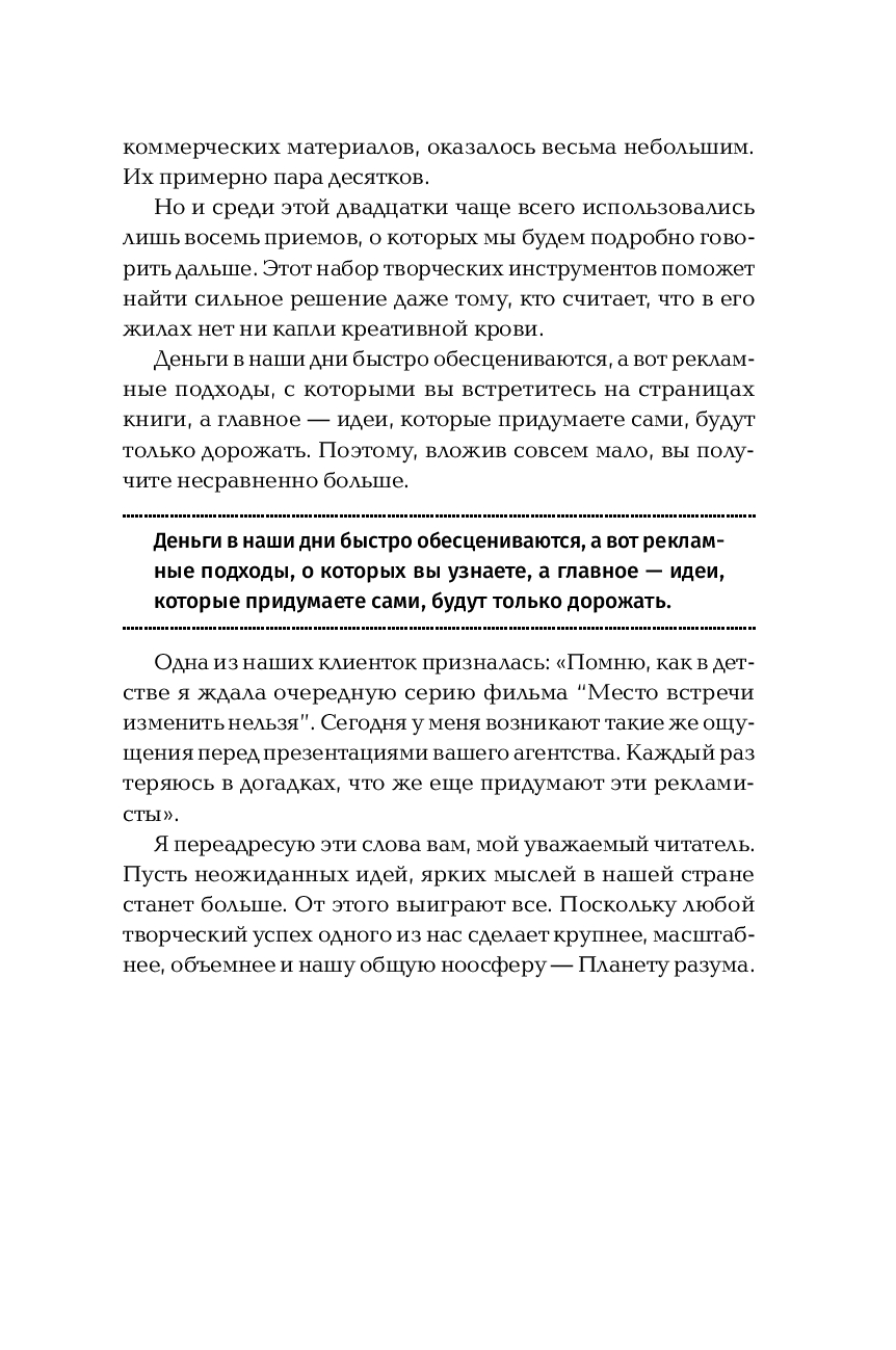 В книге предлагается альтернативный подход к поиску нестандартных идей в рекламе. Возможно, впервые в рекламном деле подробно рассмотрены, проанализированы и приведены в систему креативные приемы, позволяющие выходить на сильное решение без перебора вариантов. Одновременно обсуждаются и психологические барьеры, которые мешают находить неожиданные рекламные ходы.