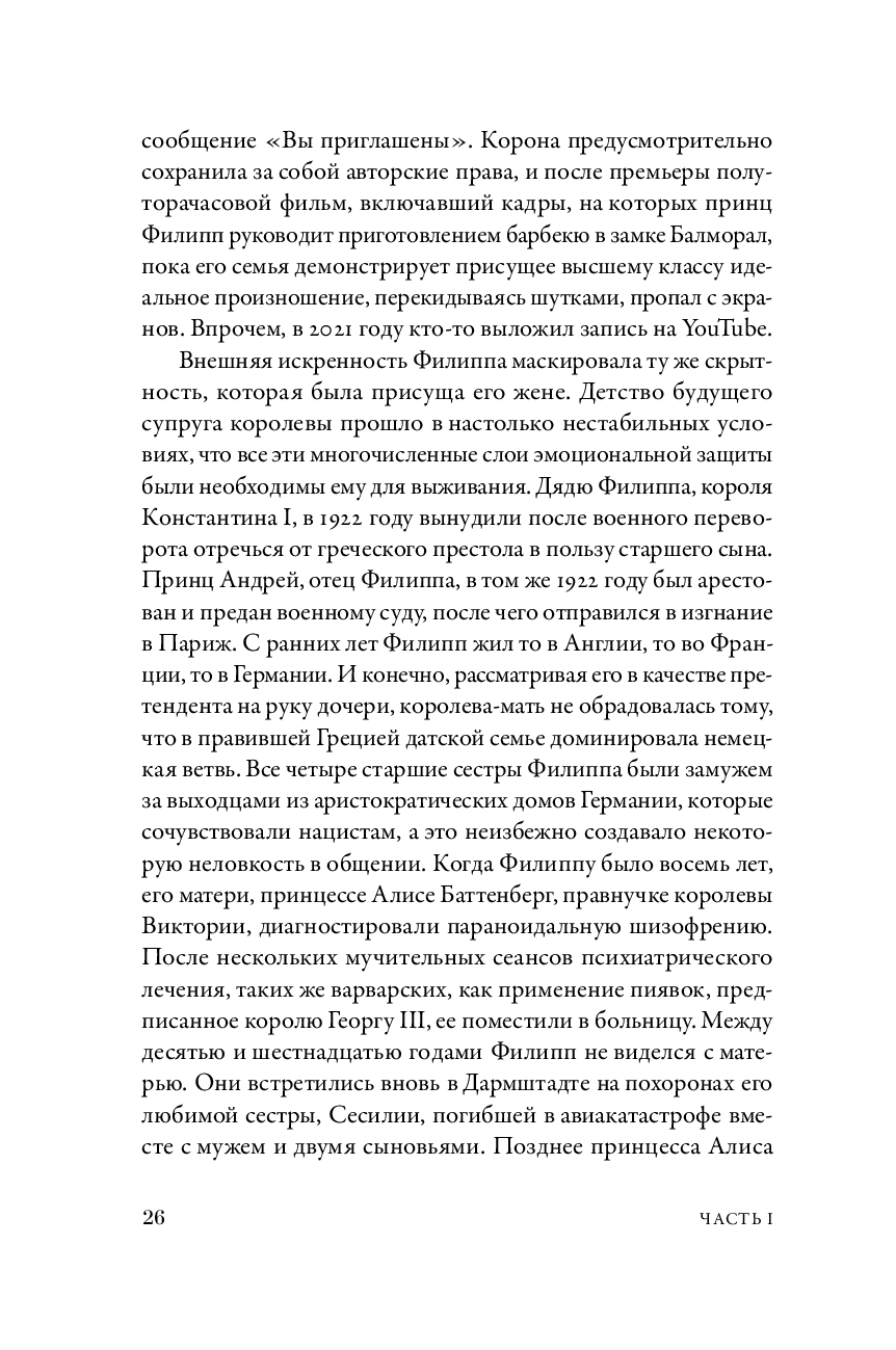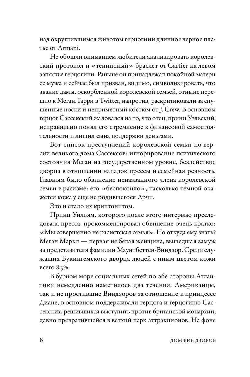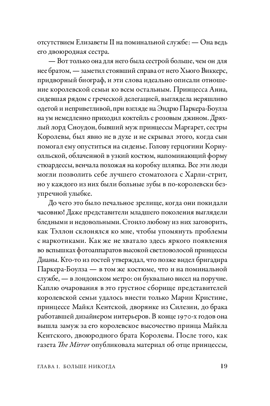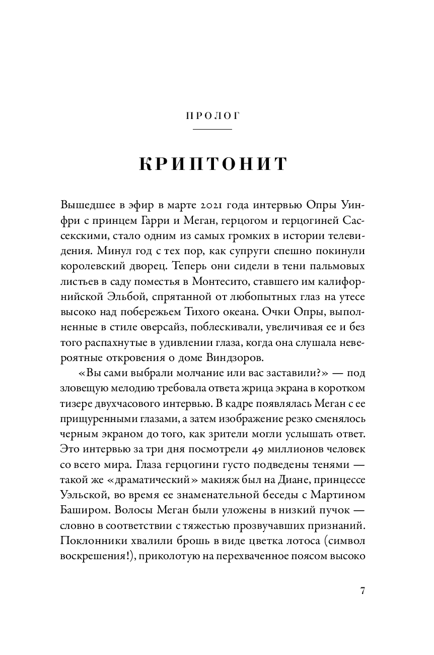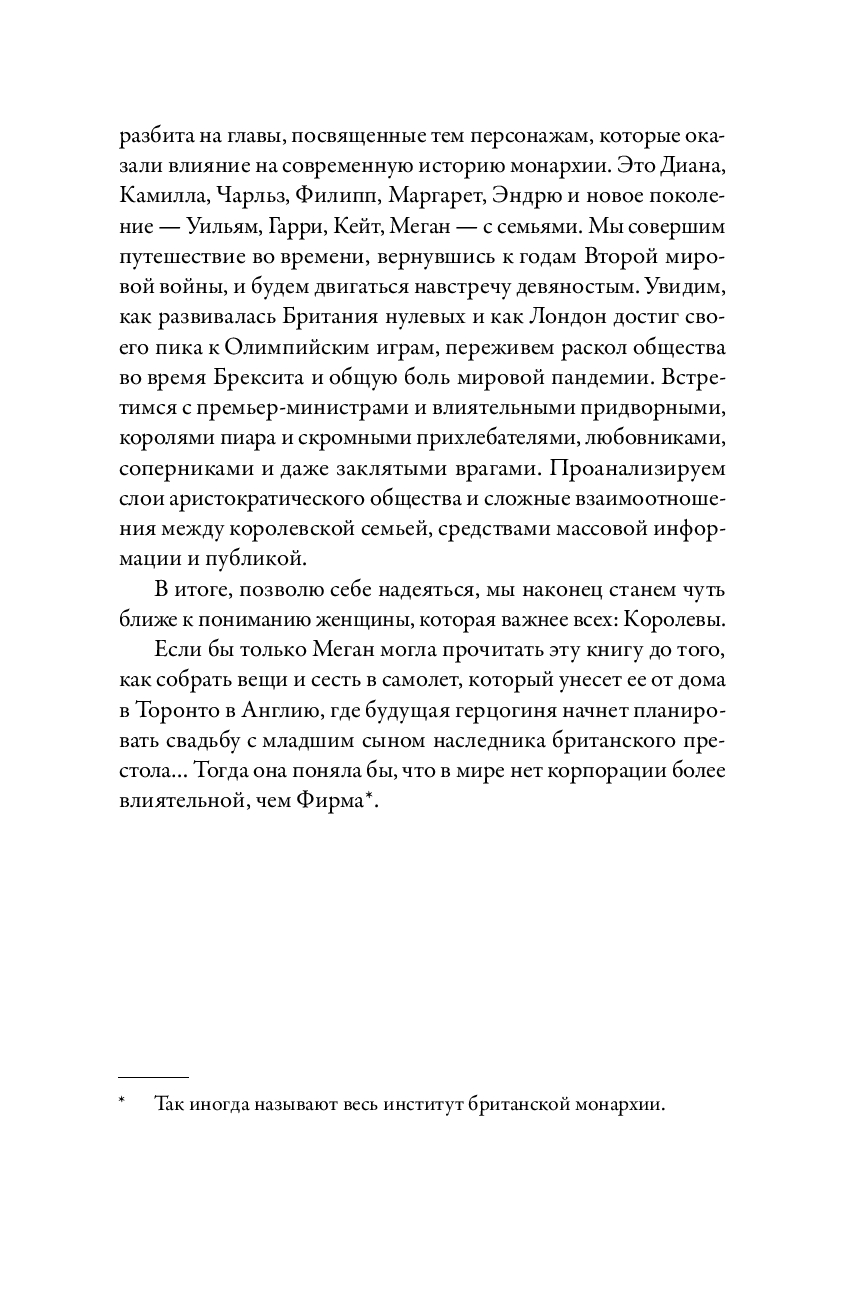 Бывший главный редактор Tatler, Vanity Fair и The New Yorker, автор бестселлера "Диана" в своей новой книге рассказывает, как британская монархия пытается выжить в XXI веке. Работая над ней, Тина Браун поговорила с 120 респондентами, которые лично знают членов королевской семьи и приближенных ко двору. Ее герои – Камилла, Чарльз, Филипп, Маргарет, Эндрю и новое поколение – Уильям, Гарри, Кейт, Меган с семьями, премьер-министры и придворные, короли пиара и скромные прихлебатели, любовники и соперники. Ее сюжет – интриги за дворцовыми стенами, битвы за влияние в тишине кабинетов, скандалы на страницах таблоидов, шокирующие откровения и уникальные подробности, которые помогают понять истинное лицо британской монархии.