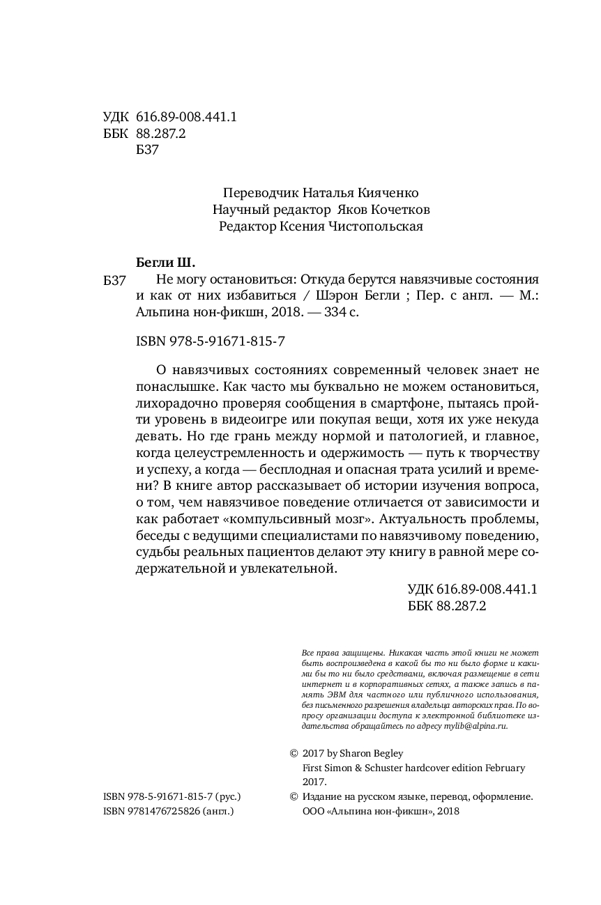 Актуальность проблемы, беседы с ведущими специалистами по навязчивому поведению, судьбы реальных пациентов делают эту книгу в равной мере содержательной и увлекательной.