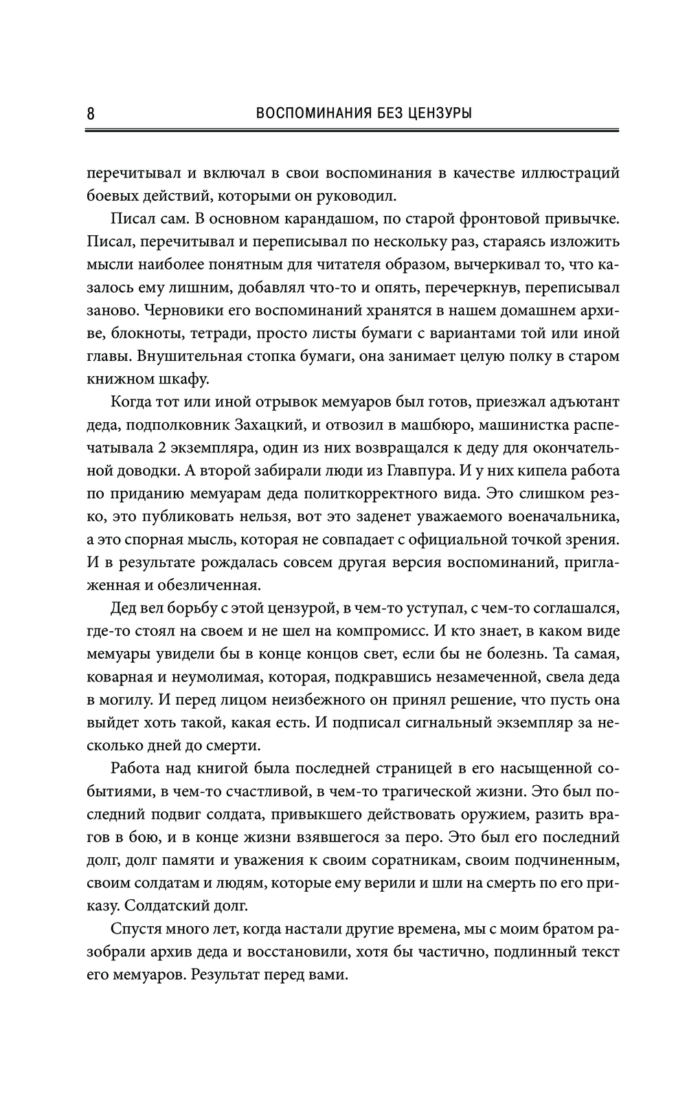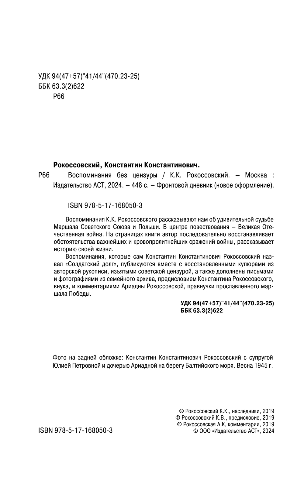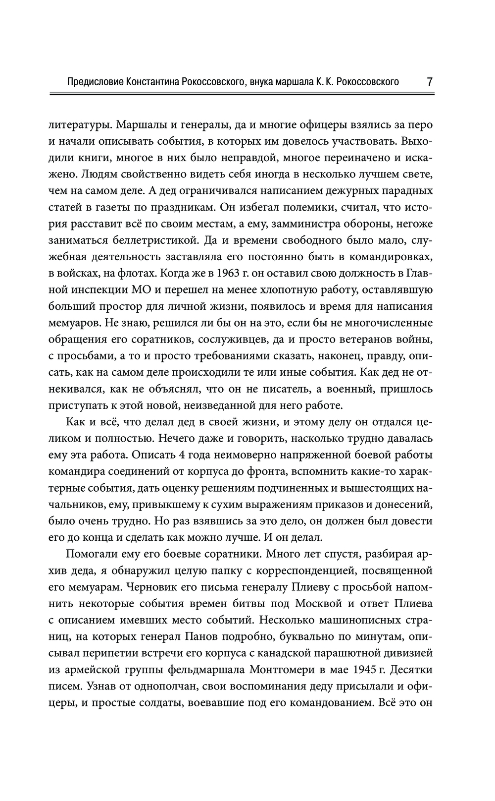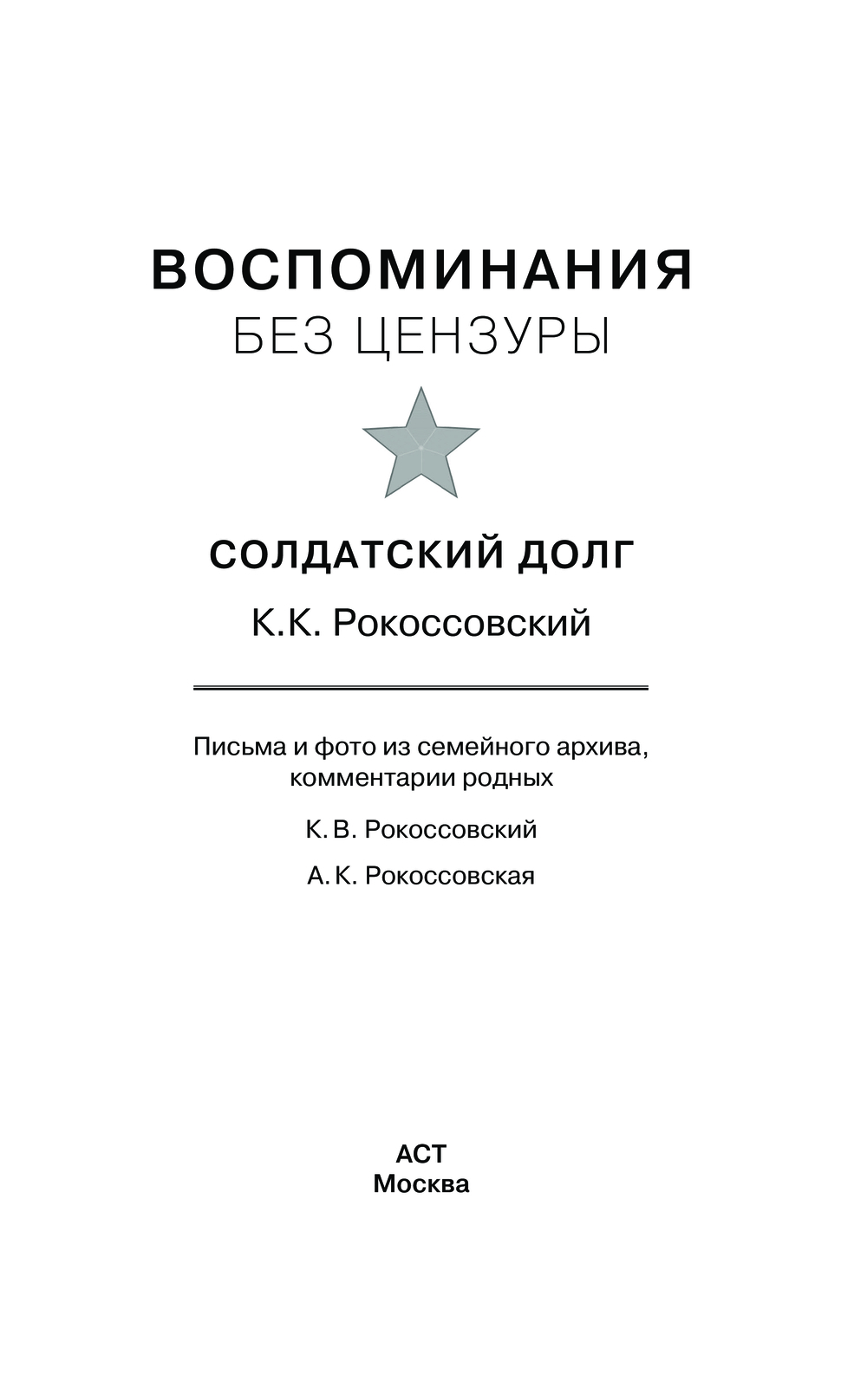 Воспоминания маршала К.К. Рокоссовского публикуются вместе с восстановленными купюрами из авторской рукописи, изъятыми советской цензурой, а также дополнены письмами и фотографиями из семейного архива и комментариями К.В. Рокоссовского, внука, и А.К. Рокоссовской, правнучки прославленного маршала Победы.