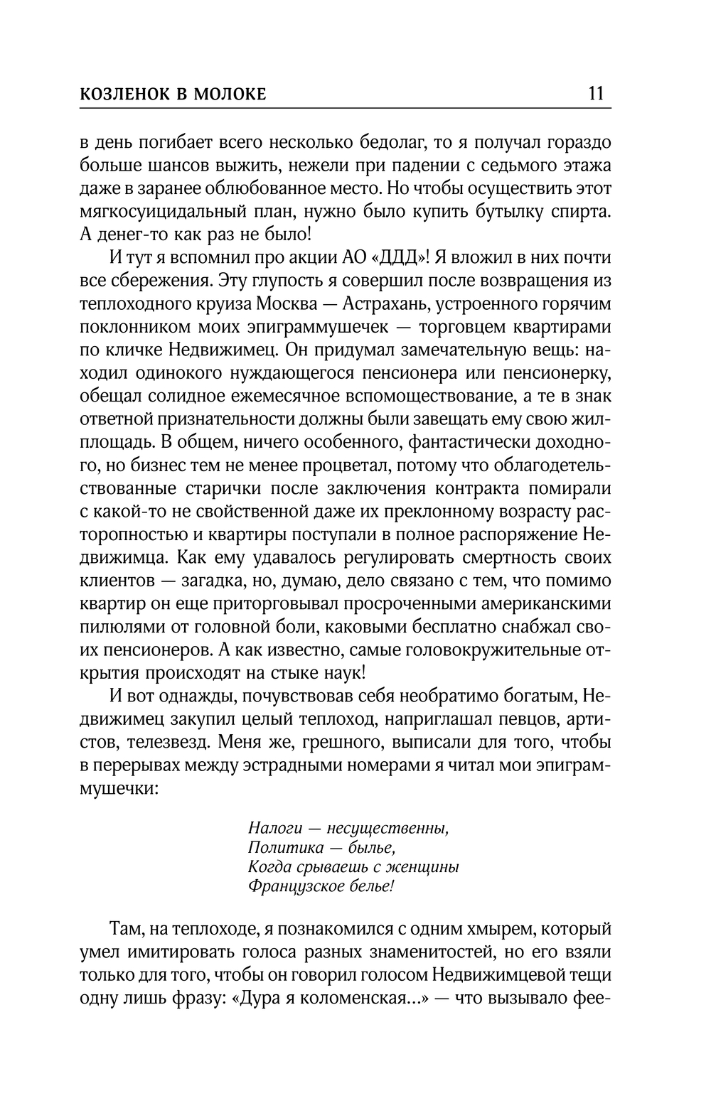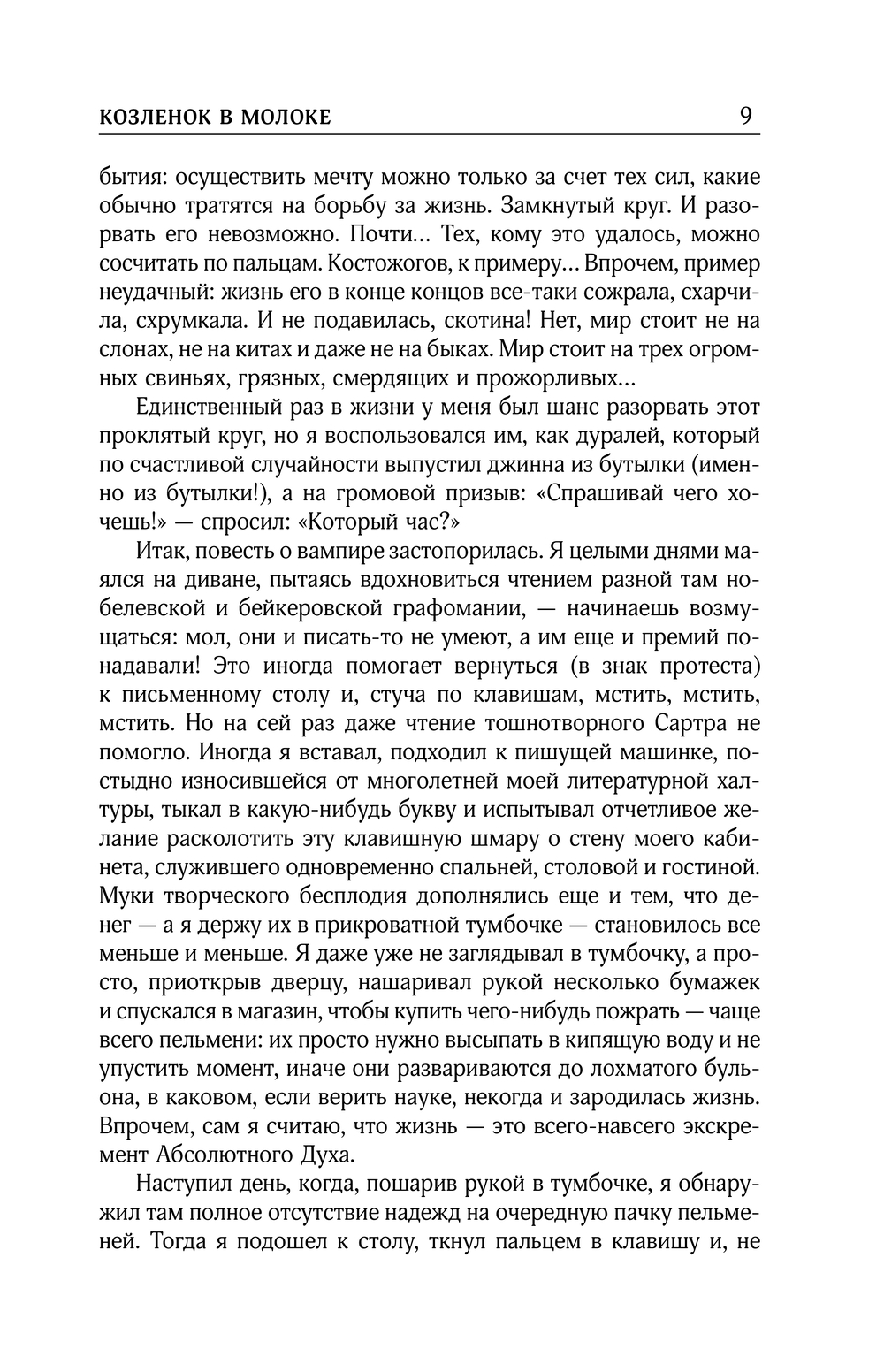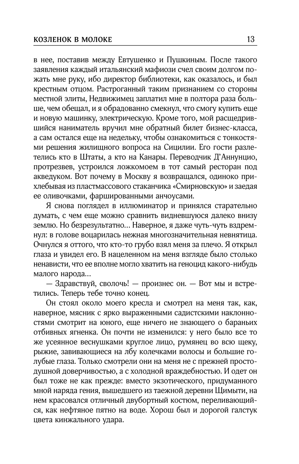 Герой романа "Козленок в молоке" молод, легкомыслен и немного заносчив. Он влюблен, а потому чувствует себя всемогущим и берется на пари сделать из первого встречного гения, который, не написав ни единой строчки, станет знаменитым писателем... Главное, чтобы об этом, кроме спорящих, не знала ни одна живая душа. Но никто не знает, какую цену придется заплатить за невинный розыгрыш.