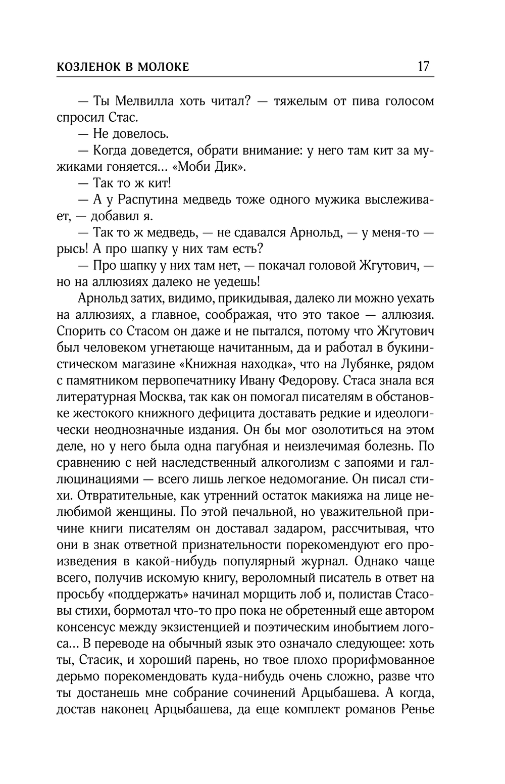 Герой романа "Козленок в молоке" молод, легкомыслен и немного заносчив. Он влюблен, а потому чувствует себя всемогущим и берется на пари сделать из первого встречного гения, который, не написав ни единой строчки, станет знаменитым писателем... Главное, чтобы об этом, кроме спорящих, не знала ни одна живая душа. Но никто не знает, какую цену придется заплатить за невинный розыгрыш.
