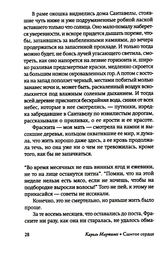 "Сшитое сердце" – пленительно красивая, яркая, изобретательная сказка, в которую погружаешься с первых же строк, и вынырнуть из нее будет невозможно. Роман Кароль Мартинез – тот самый магический реализм, что сшивает фантазию и реальность прочно и без швов.