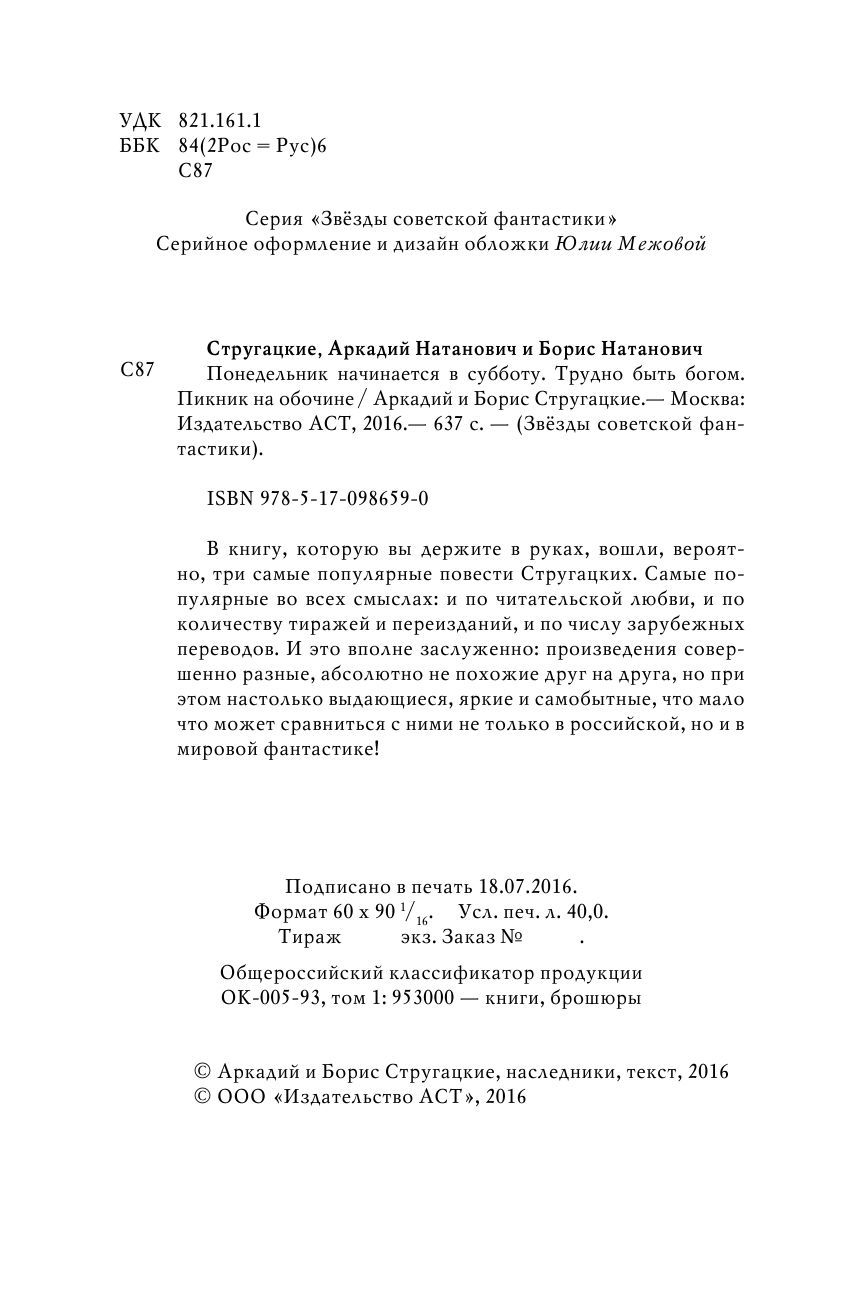 В книгу, которую вы держите в руках, вошли, вероятно, три самые популярные повести Стругацких. Самые популярные во всех смыслах: и по читательской любви, и по количеству тиражей и переизданий, и по числу зарубежных переводов. И это вполне заслуженно: произведения совершенно разные, абсолютно не похожие друг на друга, но при этом настолько выдающиеся, яркие и самобытные, что мало что может сравниться с ними не только в российской, но и в мировой фантастике!