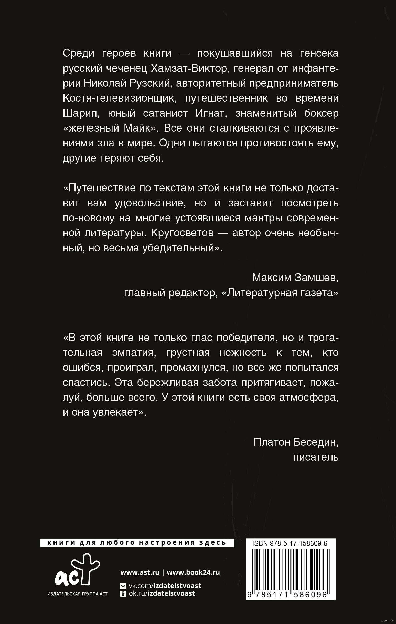 Среди героев книги – покушавшийся на генсека русский чеченец Хамзат-Виктор, генерал от инфантерии Николай Рузский, авторитетный предприниматель Костя-телевизионщик, путешественник во времени Шарип, юный сатанист Игнат, знаменитый боксер "железный Майк". Все они сталкиваются с проявлениями зла в мире. Одни пытаются противостоять ему, другие теряют себя.