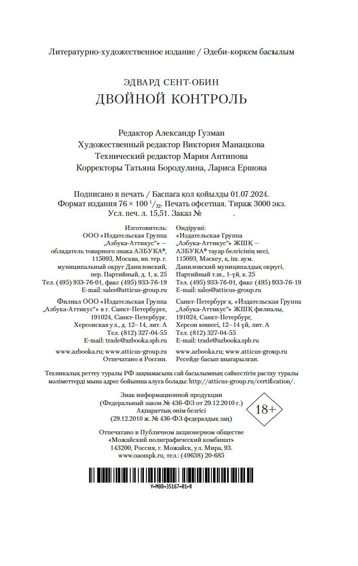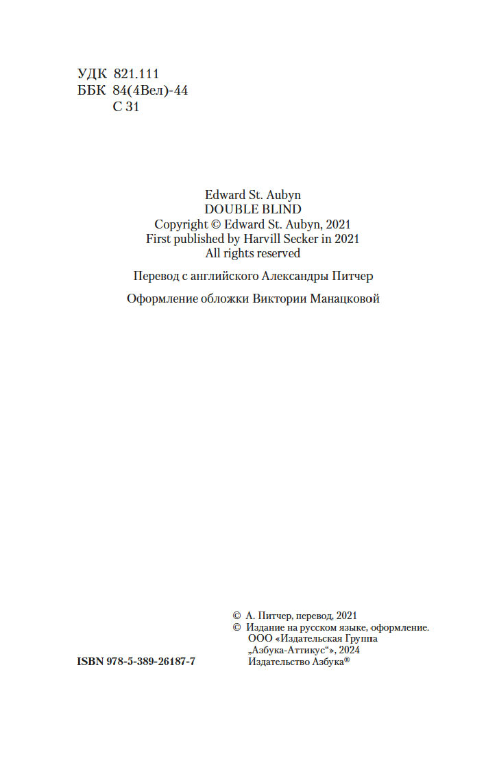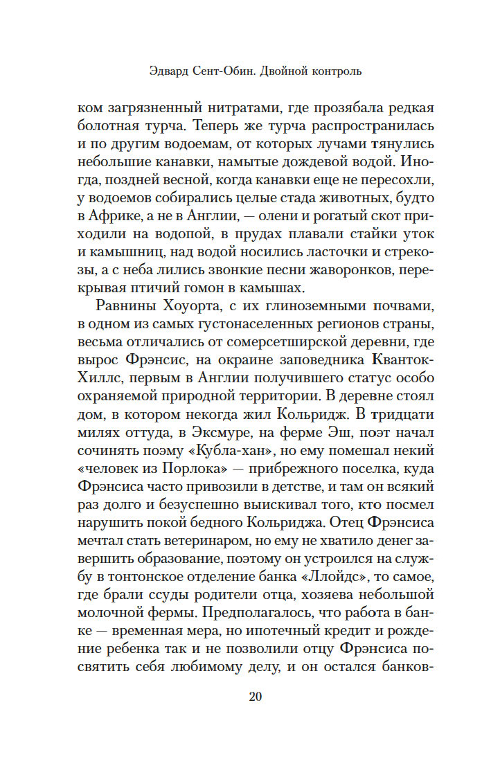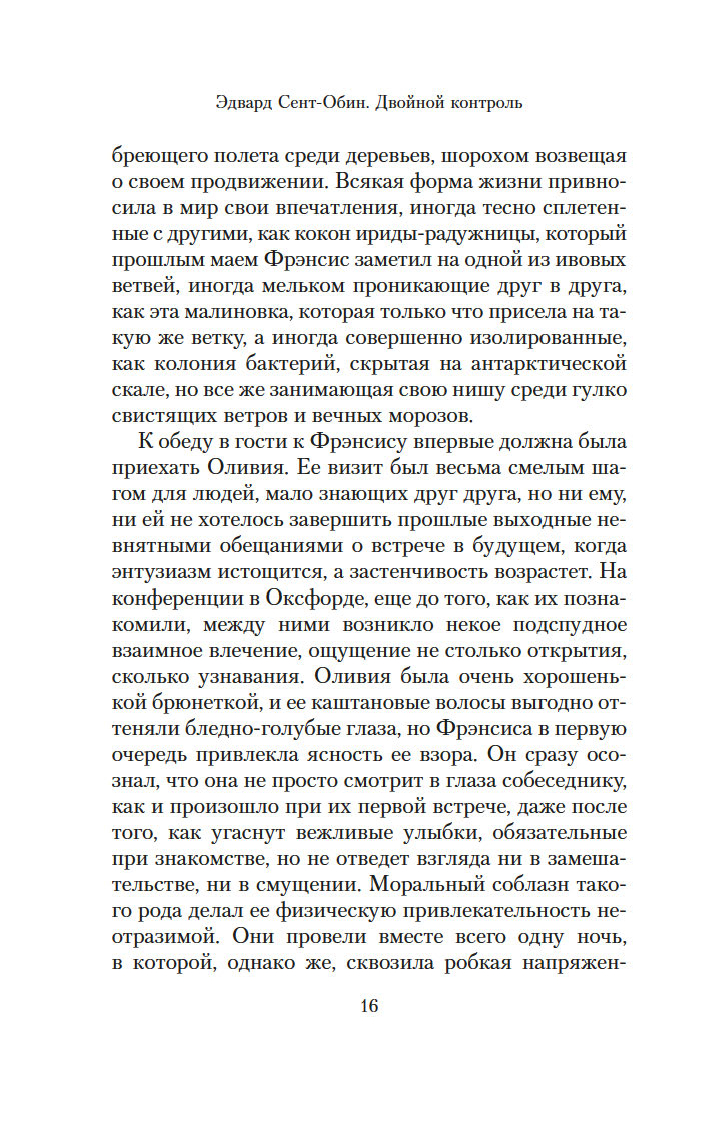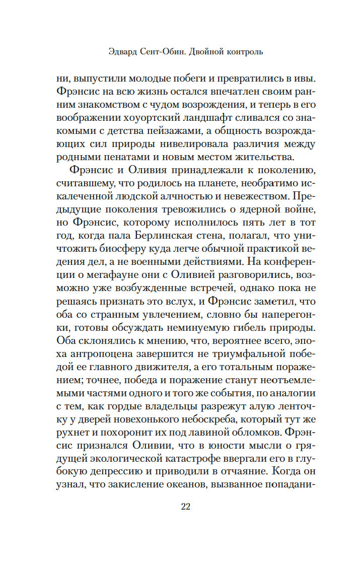 В своем новейшем романе "Двойной контроль" Сент-Обин "с необычайной легкостью затрагивает самые животрепещущие проблемы. Книга пронзает и поражает до глубины души, превращая серьезные темы – нейробиологию, экологию, психоанализ, теологию, онкологию и генетику в увлекательный фейерверк новаторских идей... В своем восхитительном романе Сент-Обин с алмазной остротой обнажает сущность семьи и любви, дружбы и соперничества, амбиций и нравственности" (Air Mail). Перемещаясь из Лондона на французский Лазурный Берег, а из глуши Сассекса в калифорнийский Биг-Сур, герои Сент-Обина исследуют темы свободы и предопределения, загадки жизни и проблемы сознания. При этом Фрэнсис и Оливия без ума влюблены друг в друга, а Люси, старая подруга Оливии, пытается выстроить отношения со своим новым боссом Хантером, виртуозом венчурных инвестиций...