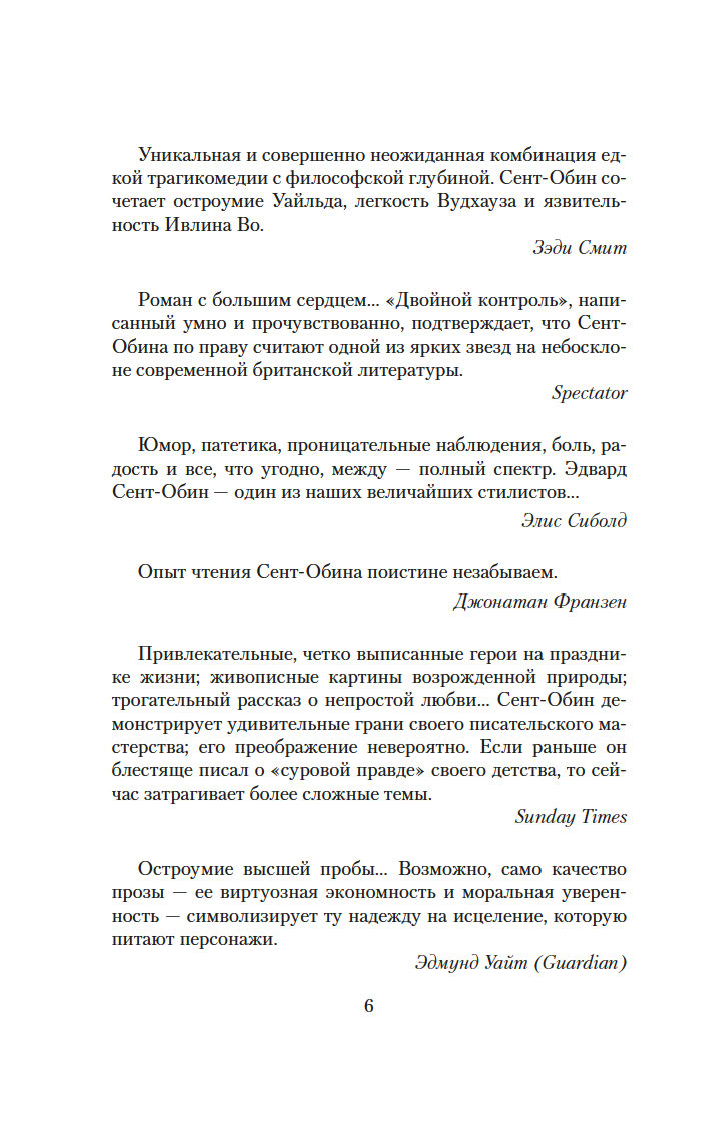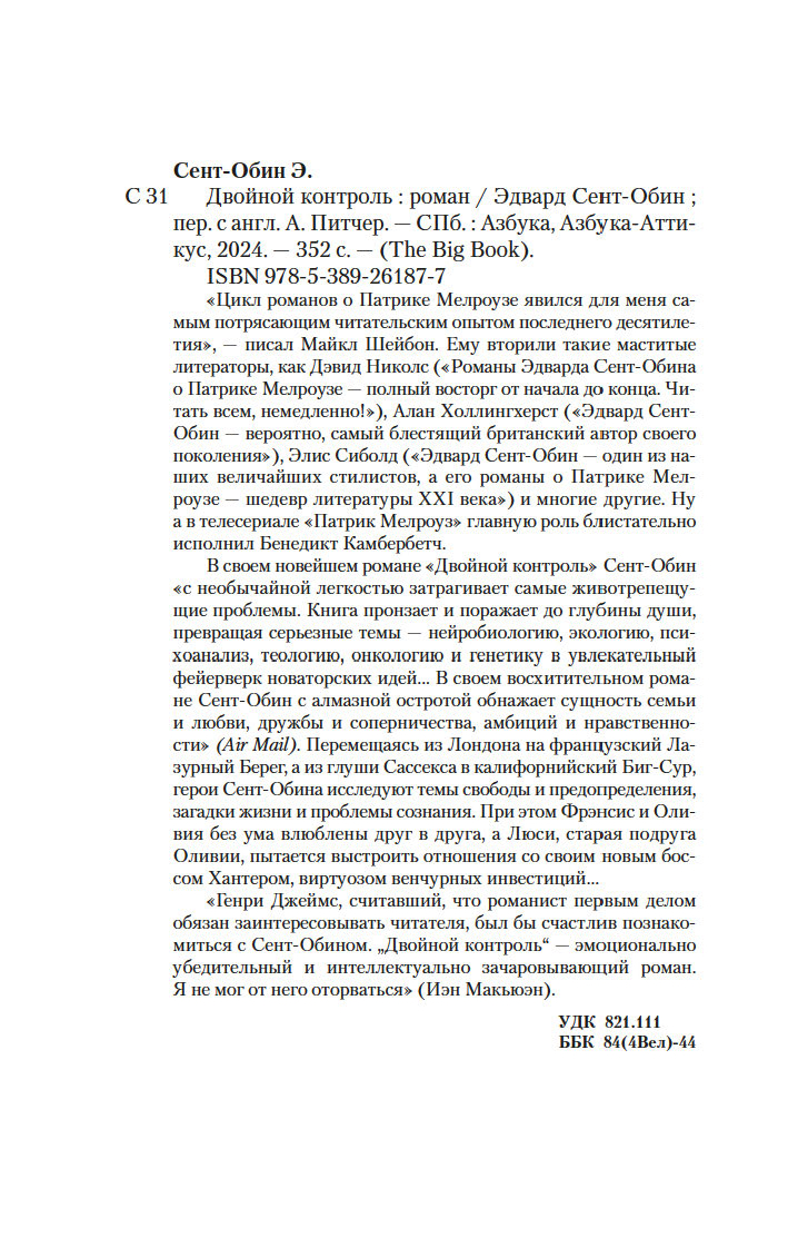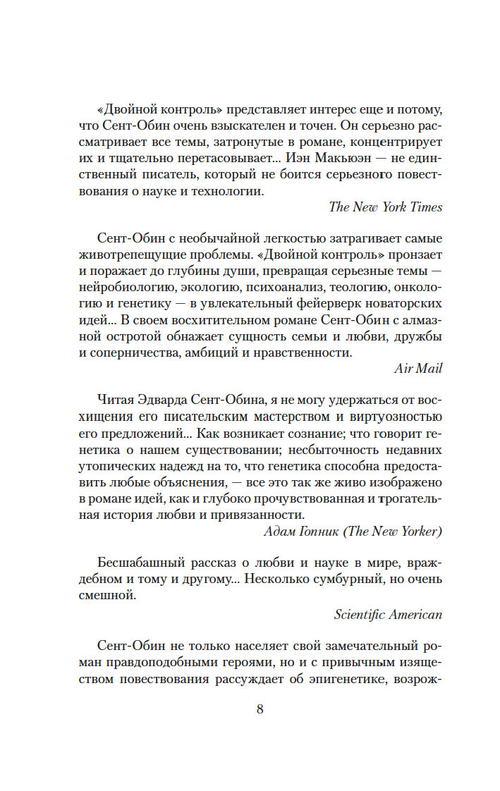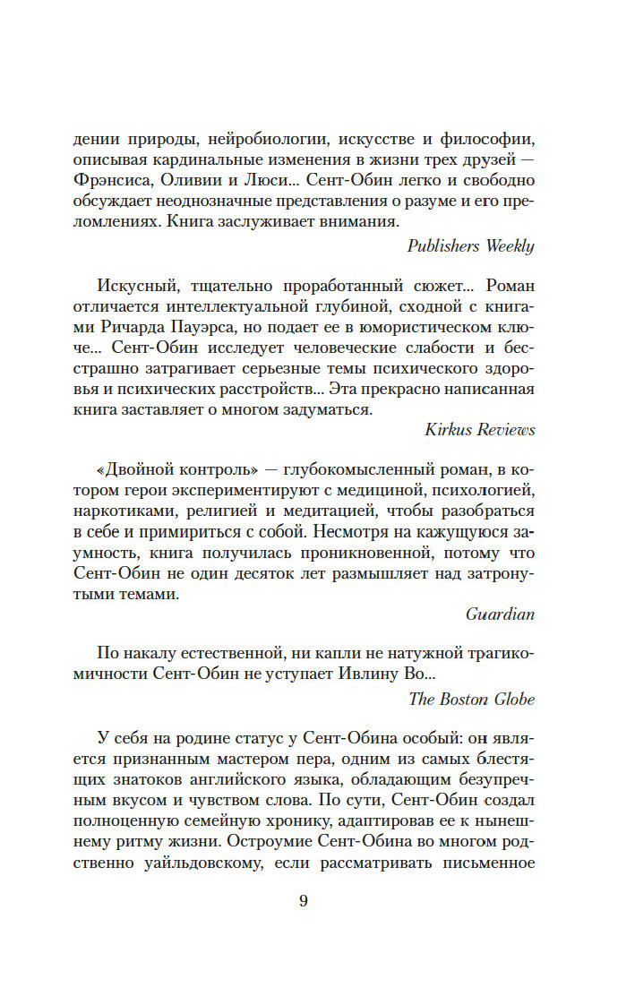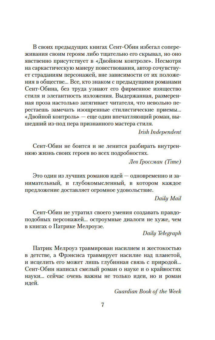 "Генри Джеймс, считавший, что романист первым делом обязан заинтересовывать читателя, был бы счастлив познакомиться с Сент-Обином. „Двойной контроль" – эмоционально убедительный и интеллектуально зачаровывающий роман. Я не мог от него оторваться" (Иэн Макьюэн).